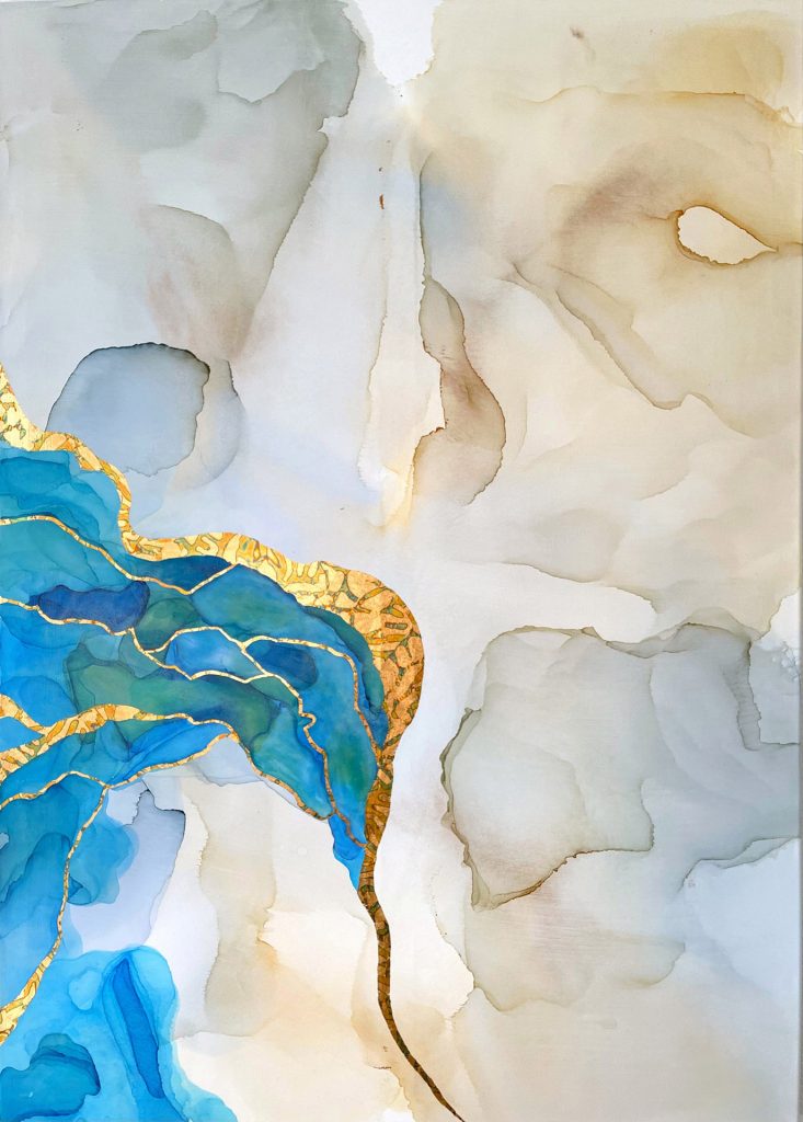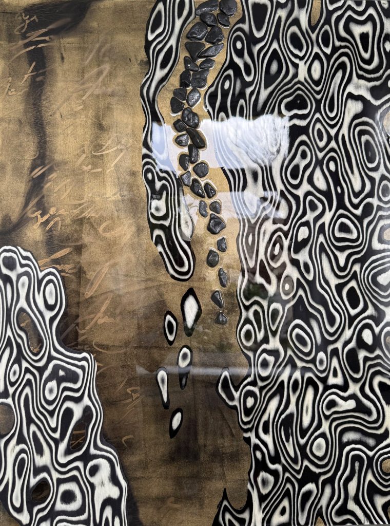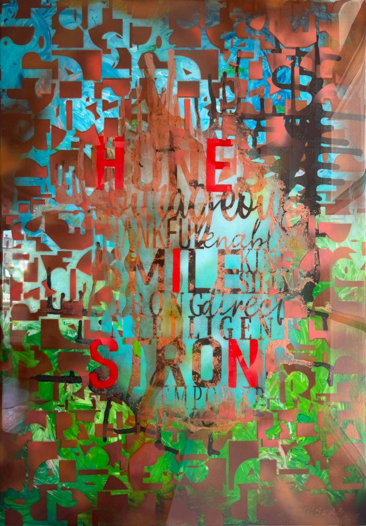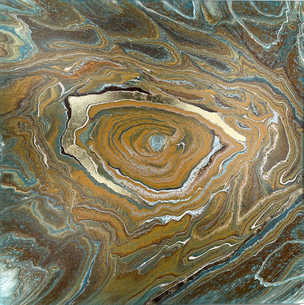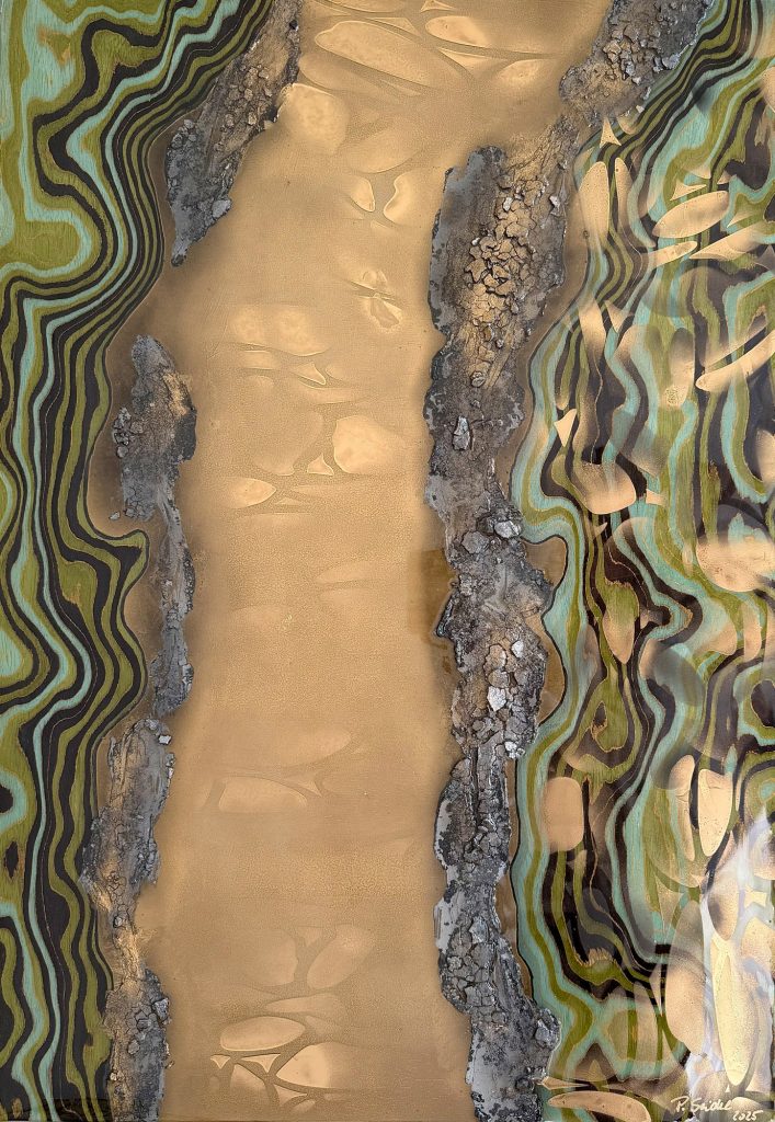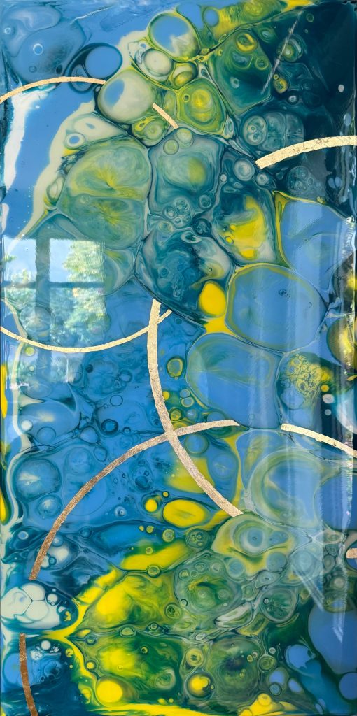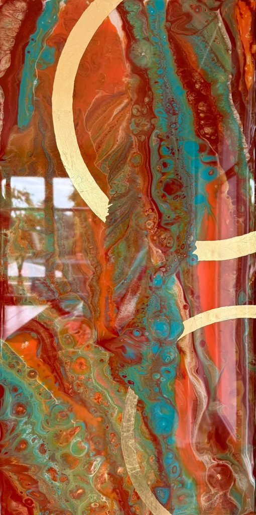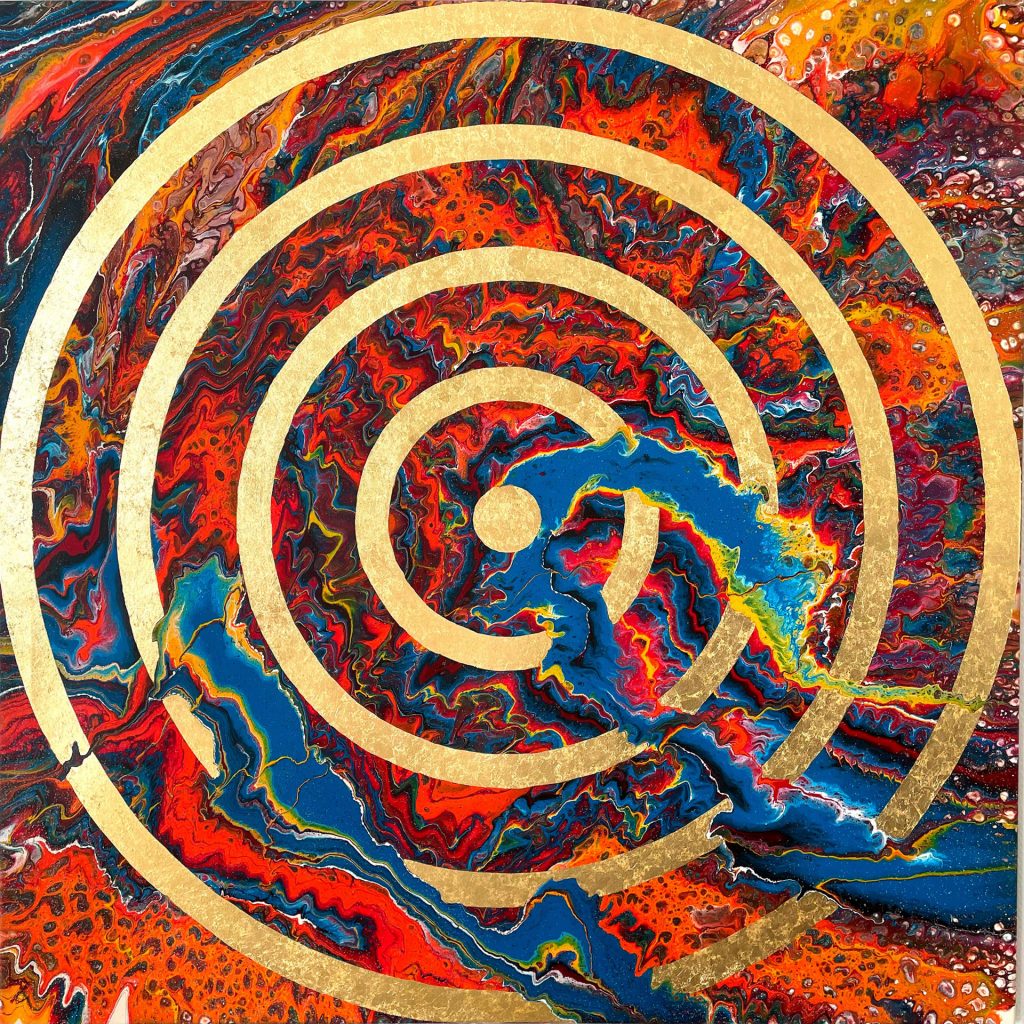 Die Strukturen stehen für Aufbruch, Entfaltung, Erdung und Bewegung – für innere Prozesse, die sich ihren Raum nehmen. Glänzende Oberflächen und goldene Akzente schaffen Momente der Reflexion und verleihen den Arbeiten Tiefe und Lebendigkeit. Kräftige Farben tragen Energie und Lebensfreude in sich und machen sie sichtbar.