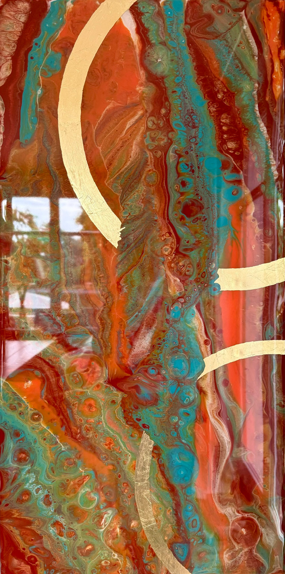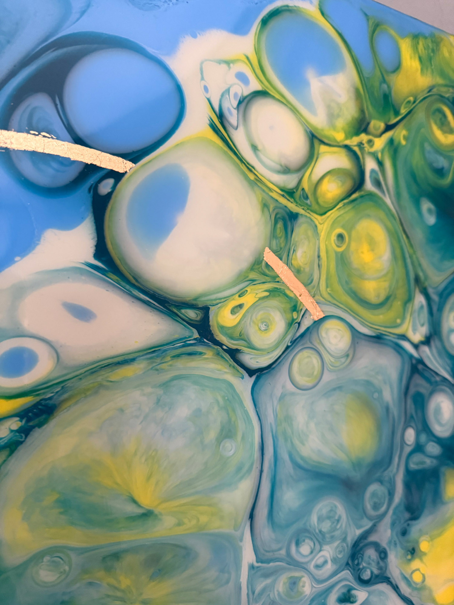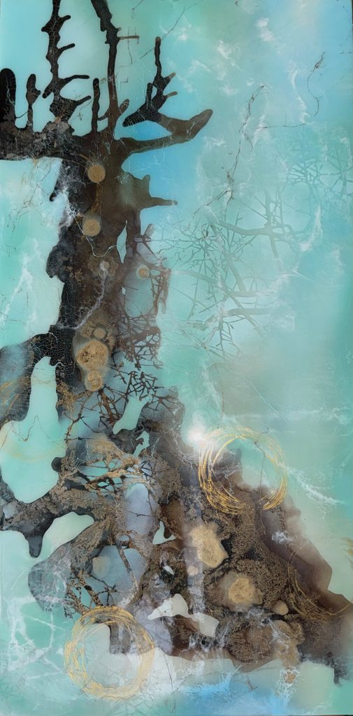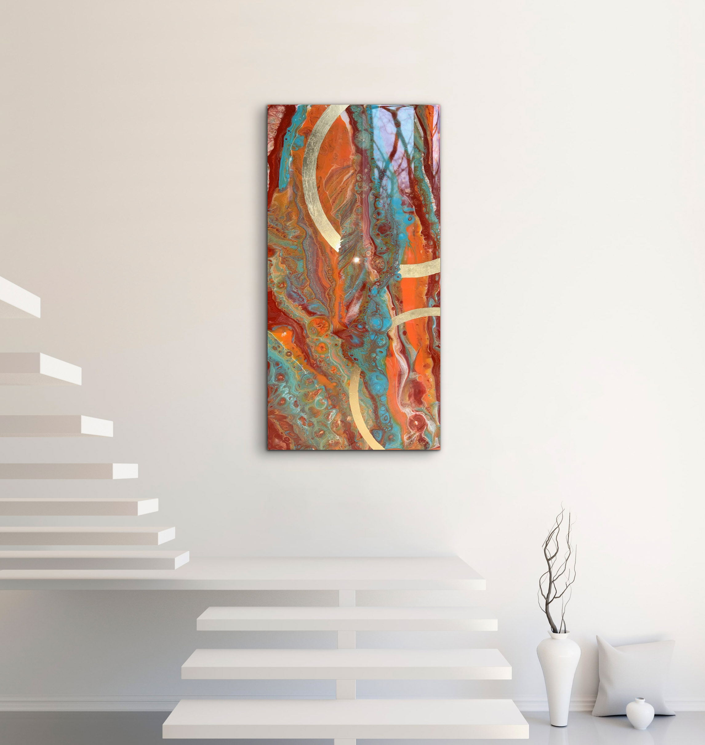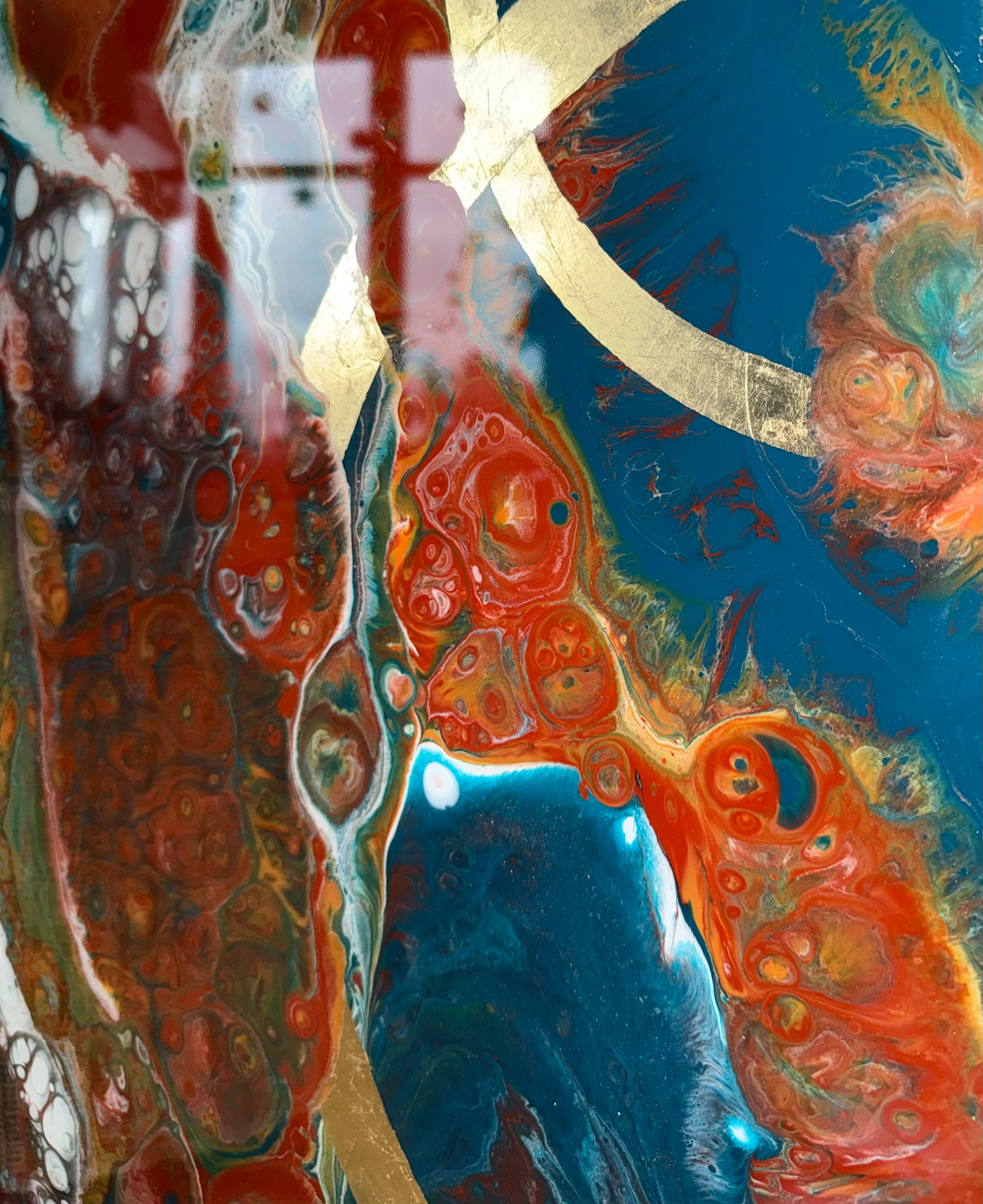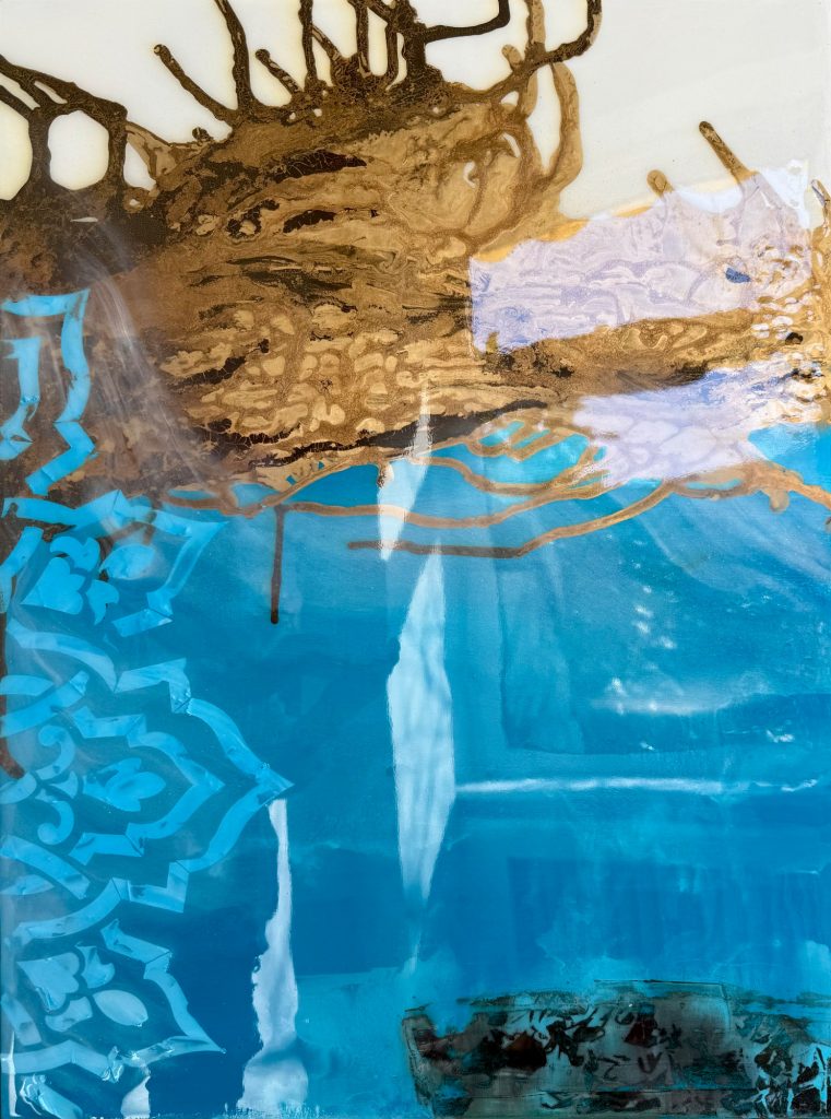 Die Strukturen stehen für Aufbruch, Entfaltung, Erdung und Bewegung – für innere Prozesse, die sich ihren Raum nehmen. Glänzende Oberflächen und goldene Akzente schaffen Momente der Reflexion und verleihen den Arbeiten Tiefe und Lebendigkeit. Kräftige Farben tragen Energie und Lebensfreude in sich und machen sie sichtbar.