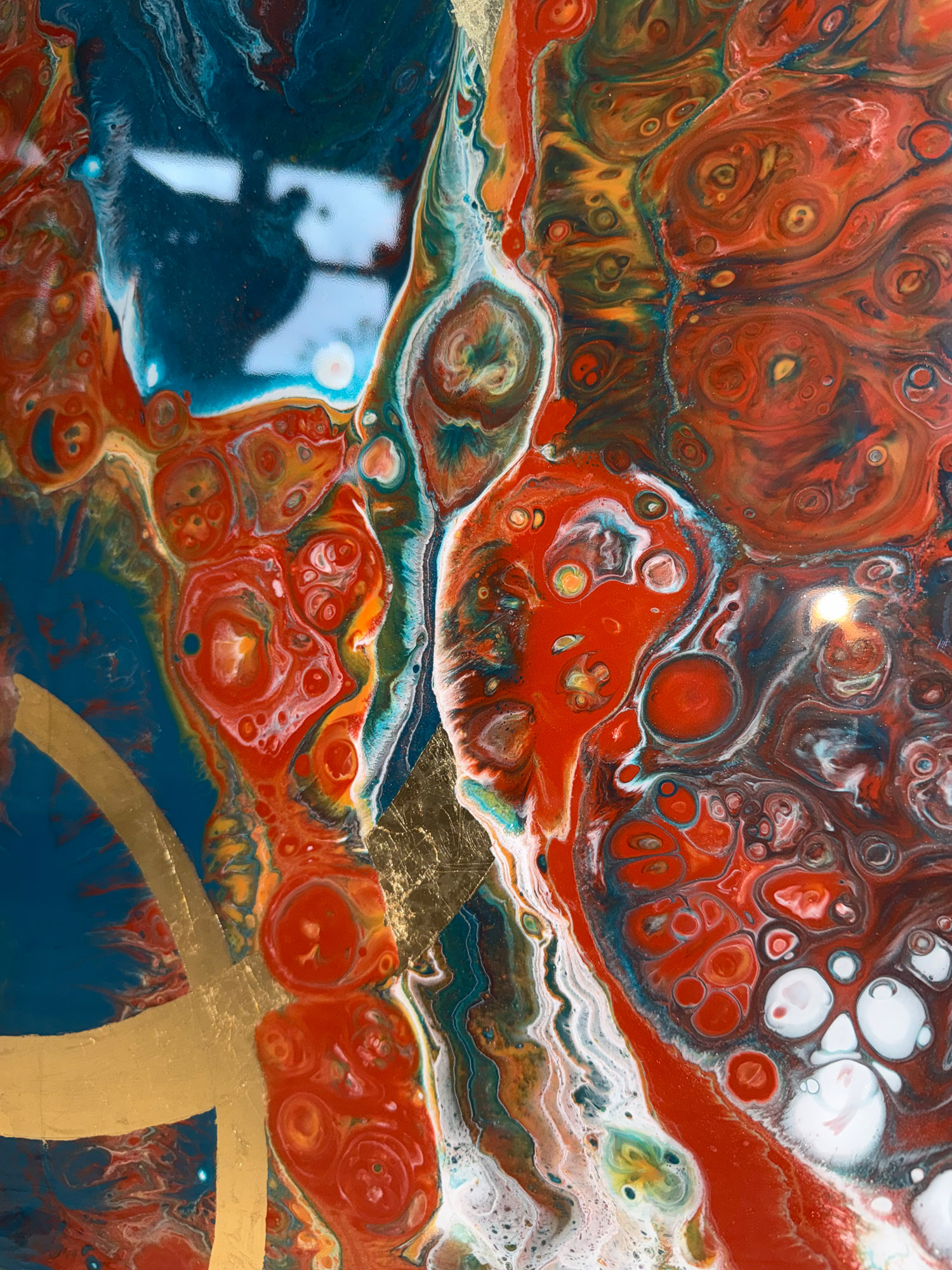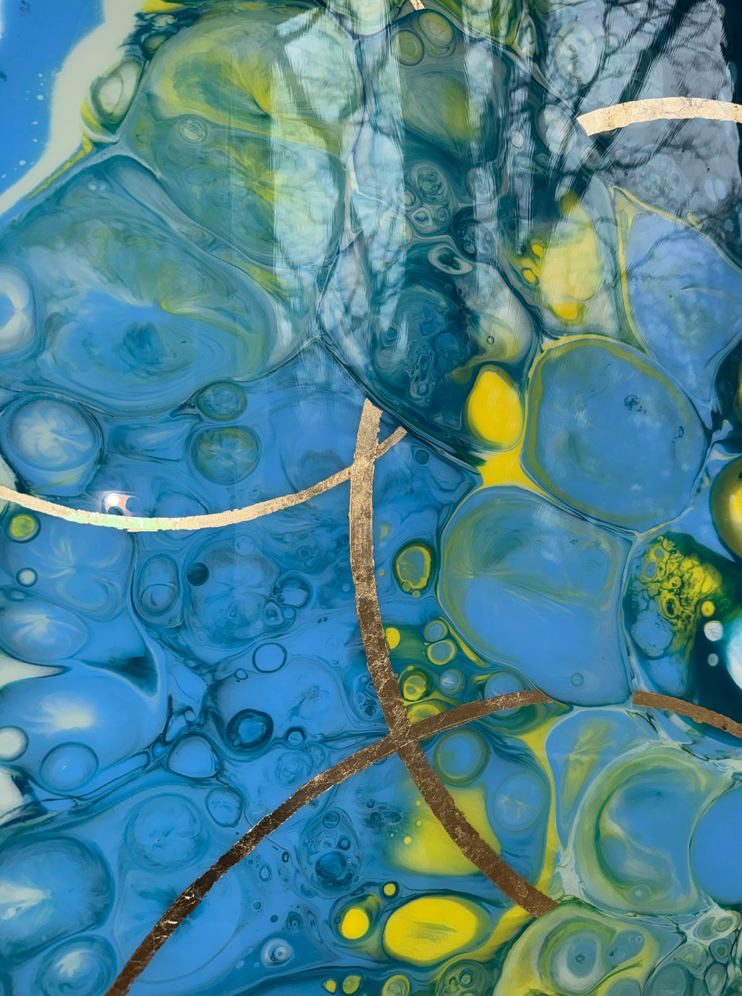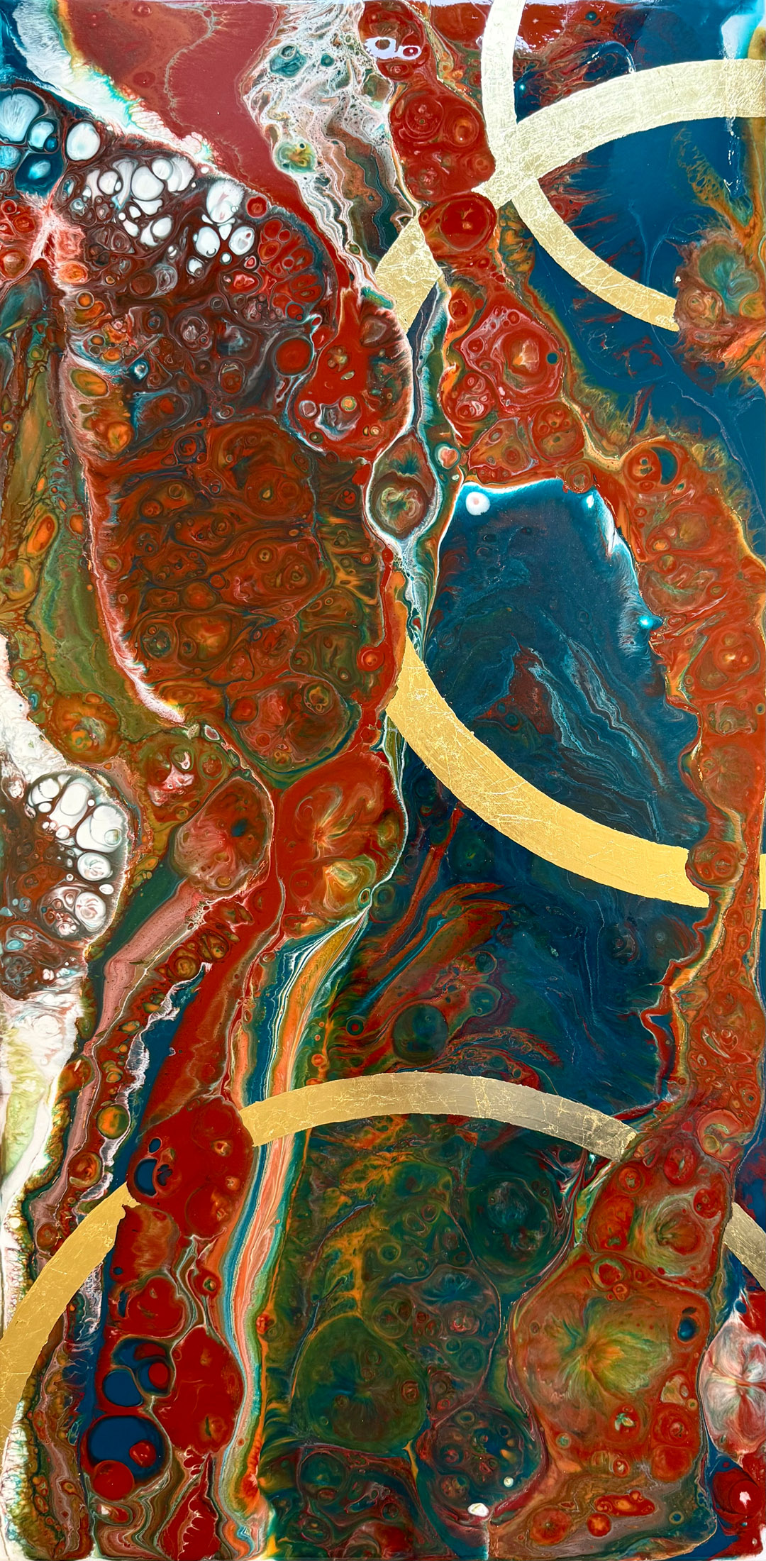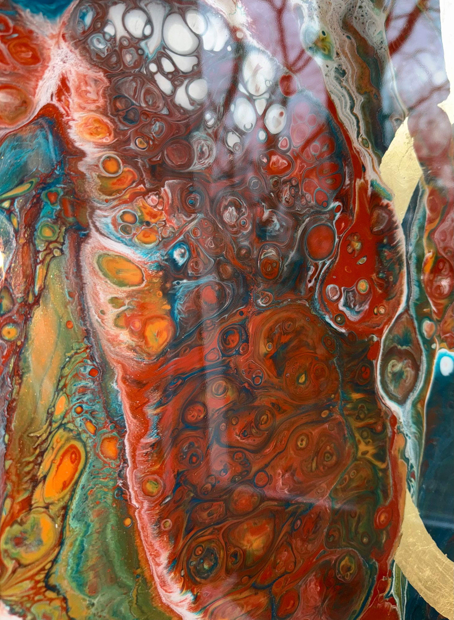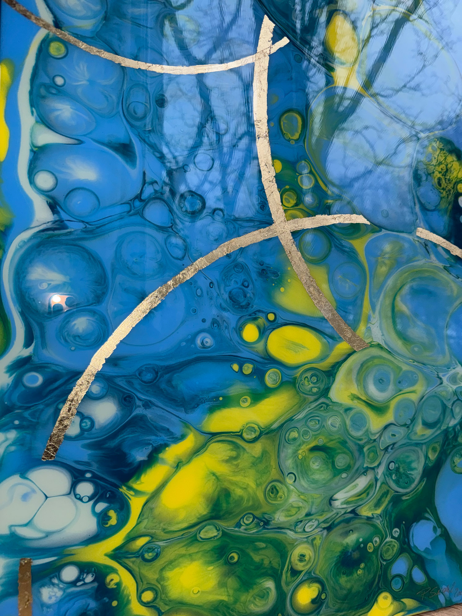 Die Strukturen stehen für Aufbruch, Entfaltung, Erdung und Bewegung – für innere Prozesse, die sich ihren Raum nehmen. Glänzende Oberflächen und goldene Akzente schaffen Momente der Reflexion und verleihen den Arbeiten Tiefe und Lebendigkeit. Kräftige Farben tragen Energie und Lebensfreude in sich und machen sie sichtbar.