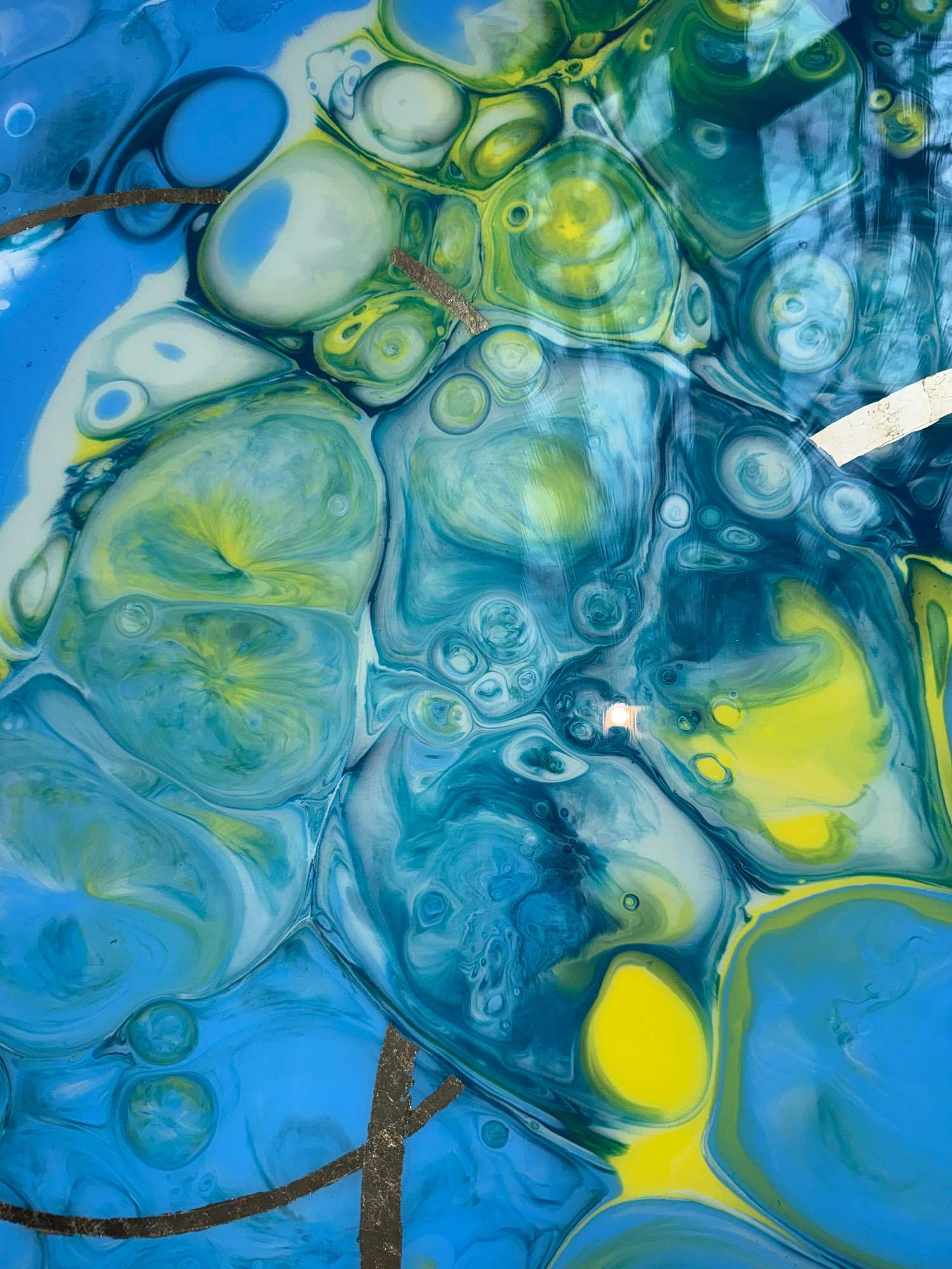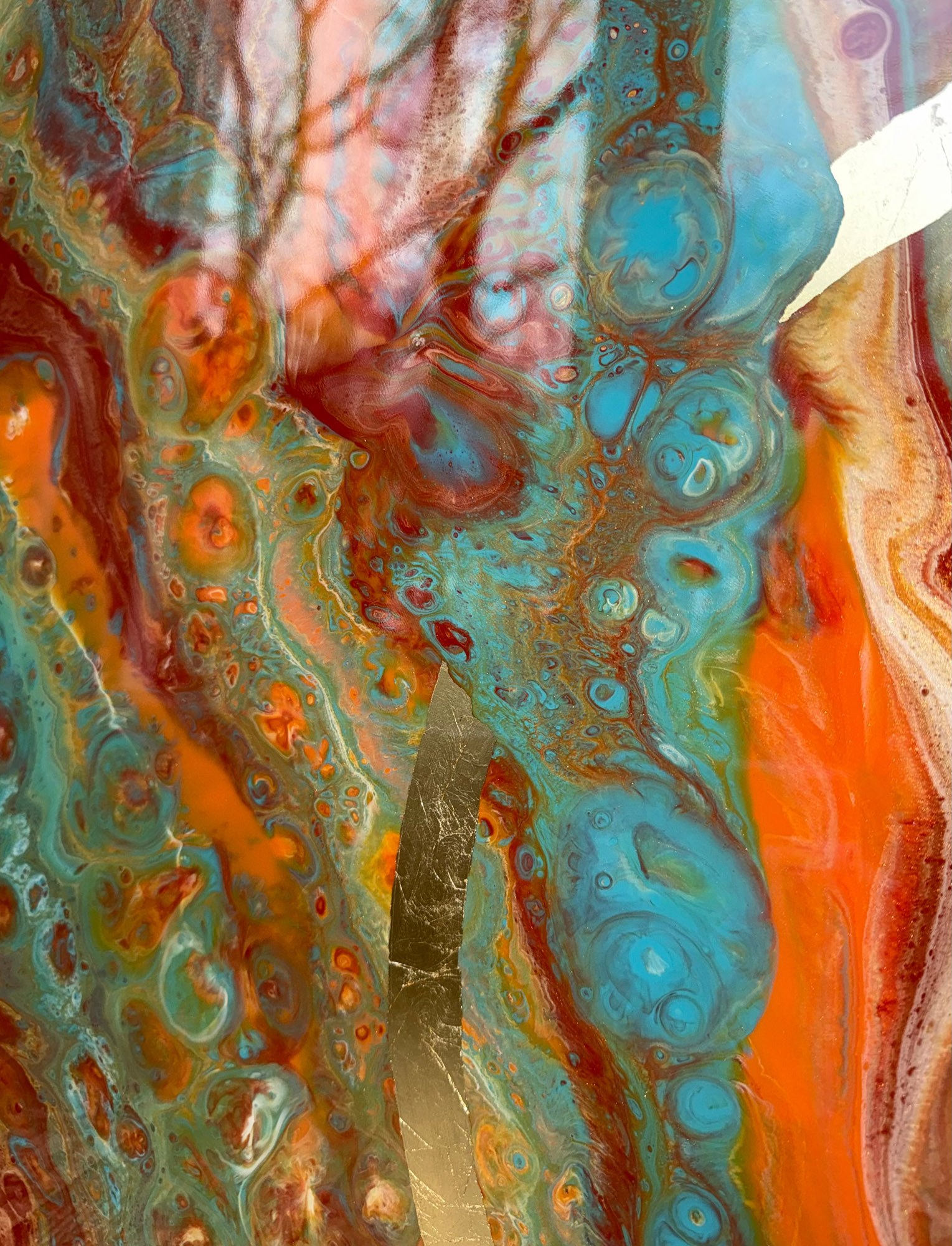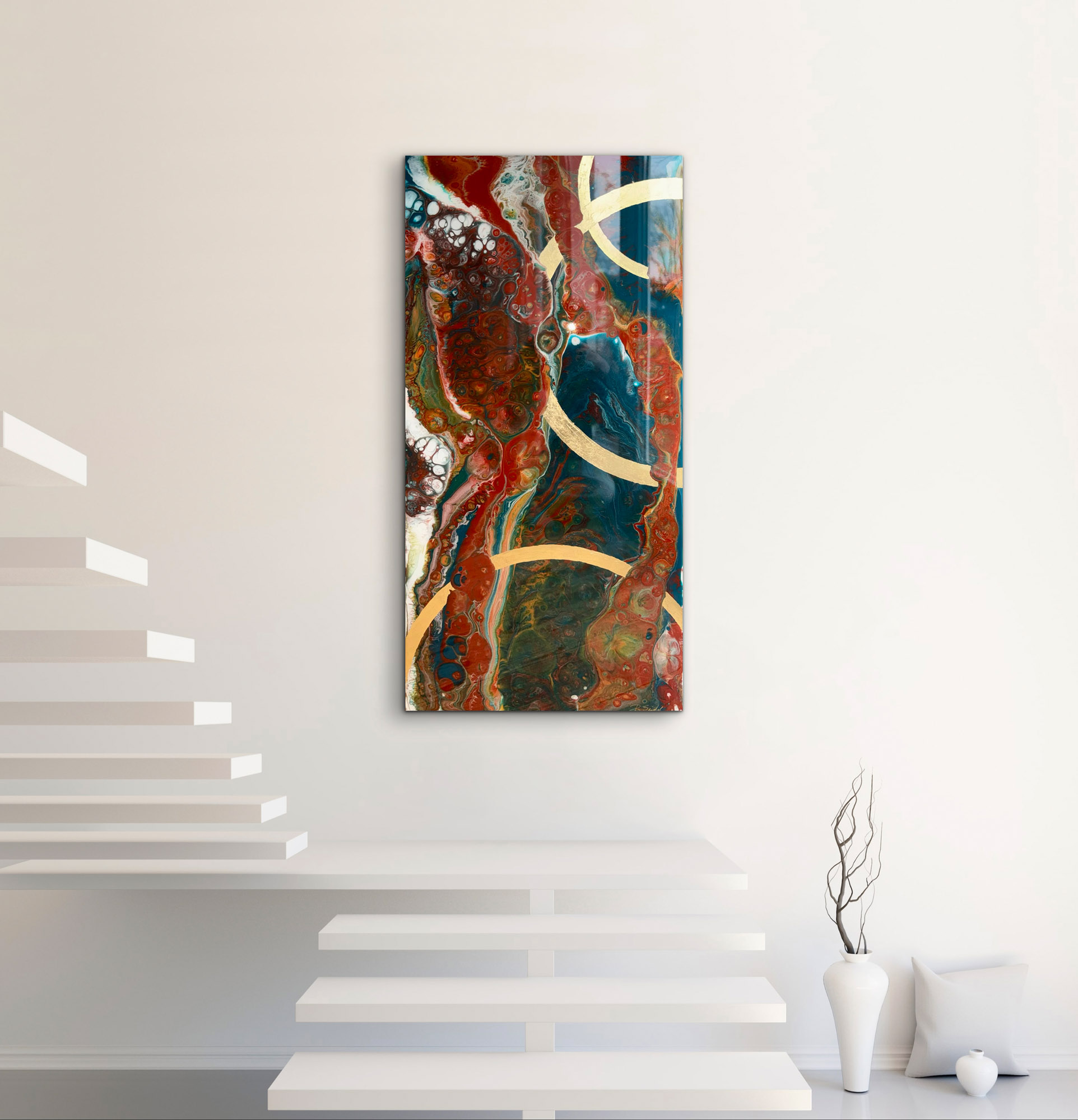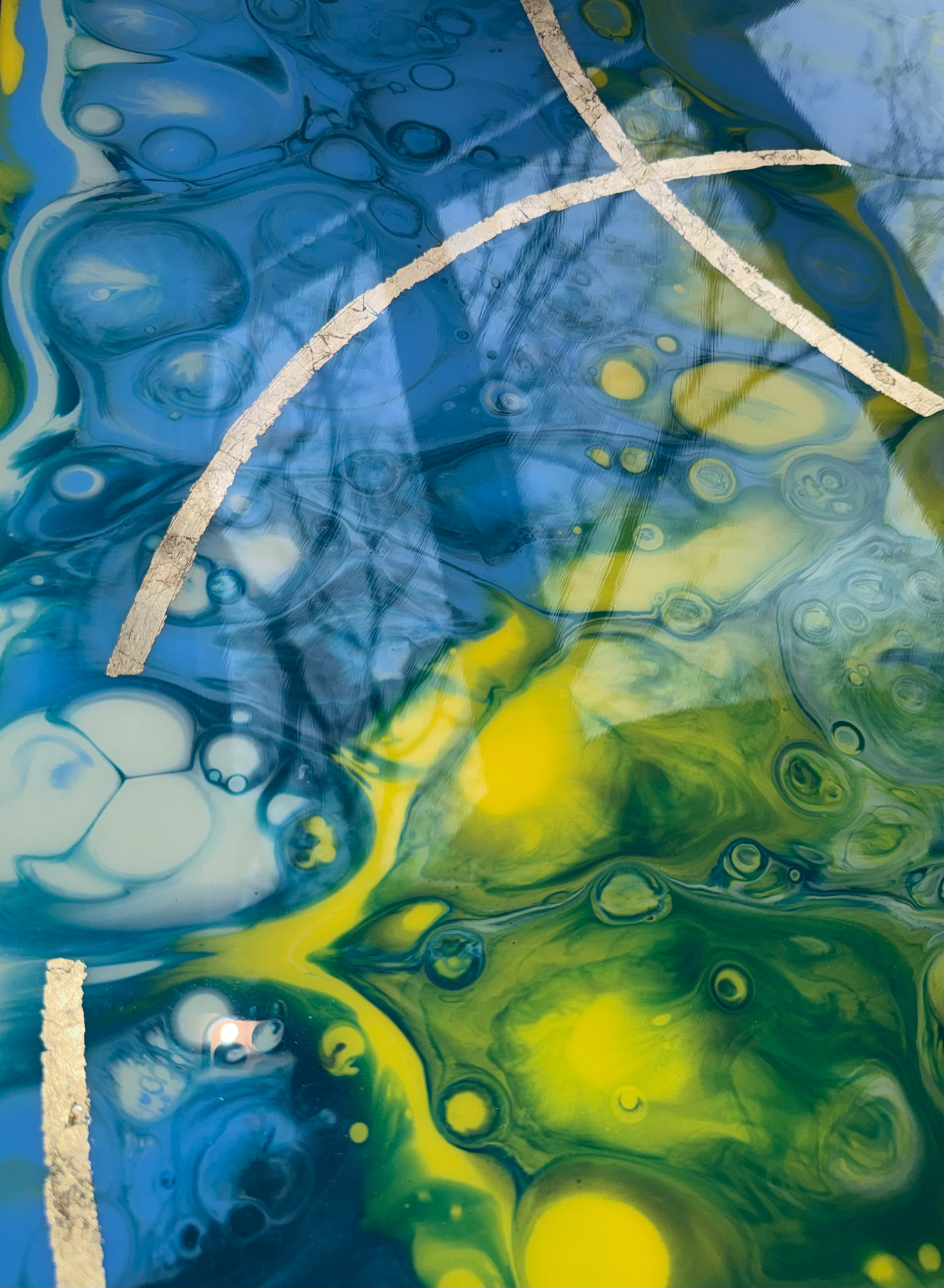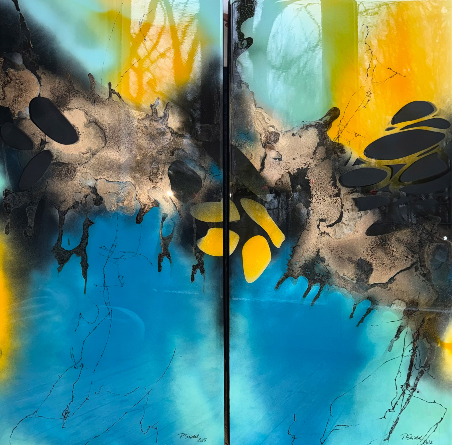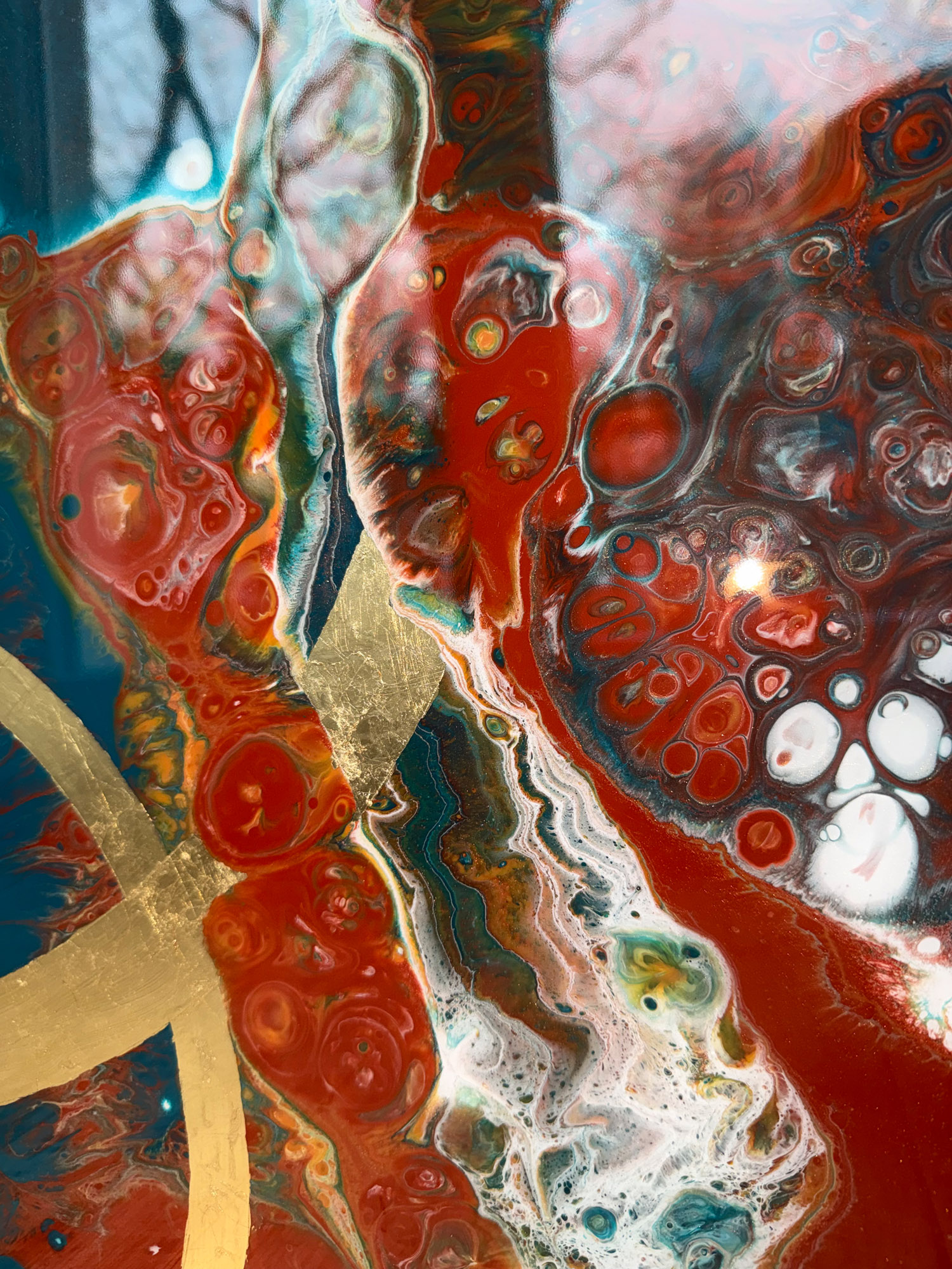 Die Strukturen stehen für Aufbruch, Entfaltung, Erdung und Bewegung – für innere Prozesse, die sich ihren Raum nehmen. Glänzende Oberflächen und goldene Akzente schaffen Momente der Reflexion und verleihen den Arbeiten Tiefe und Lebendigkeit. Kräftige Farben tragen Energie und Lebensfreude in sich und machen sie sichtbar.
