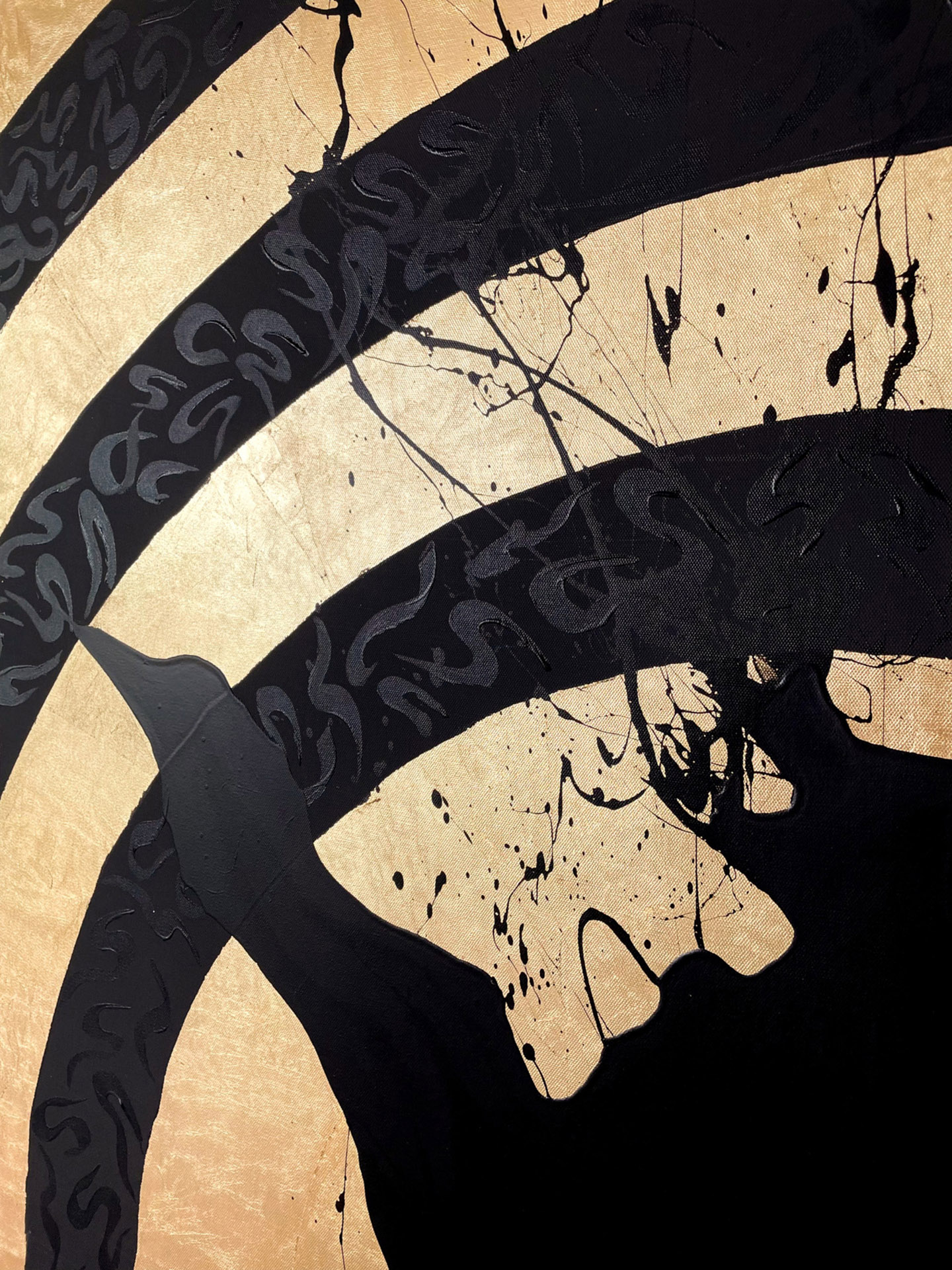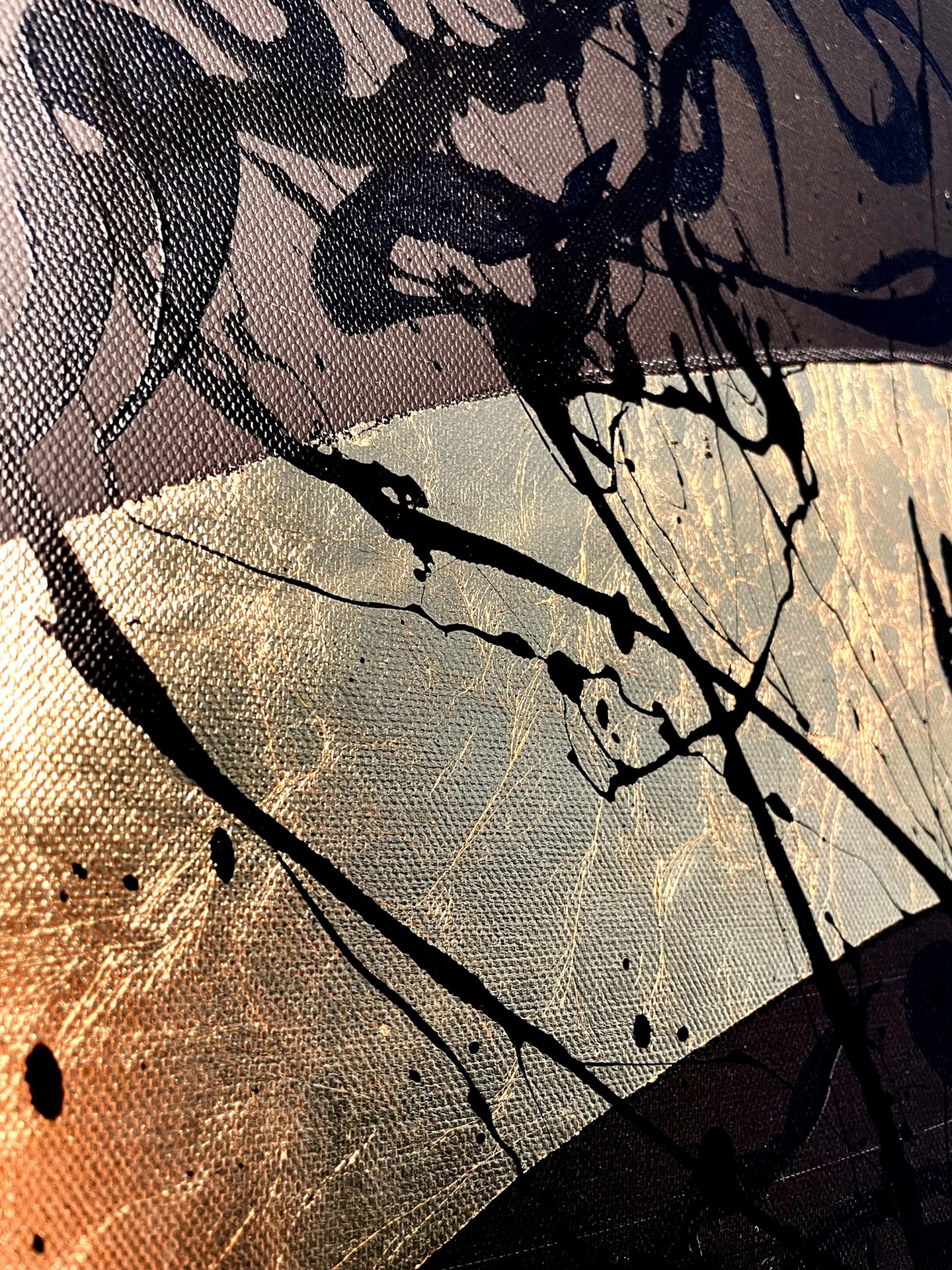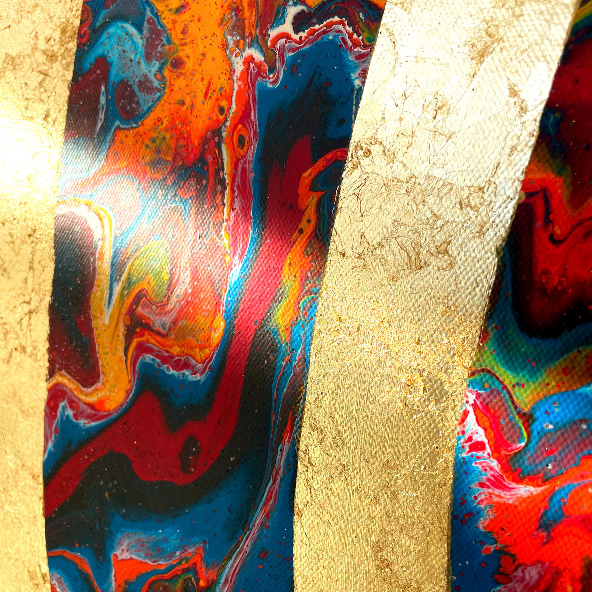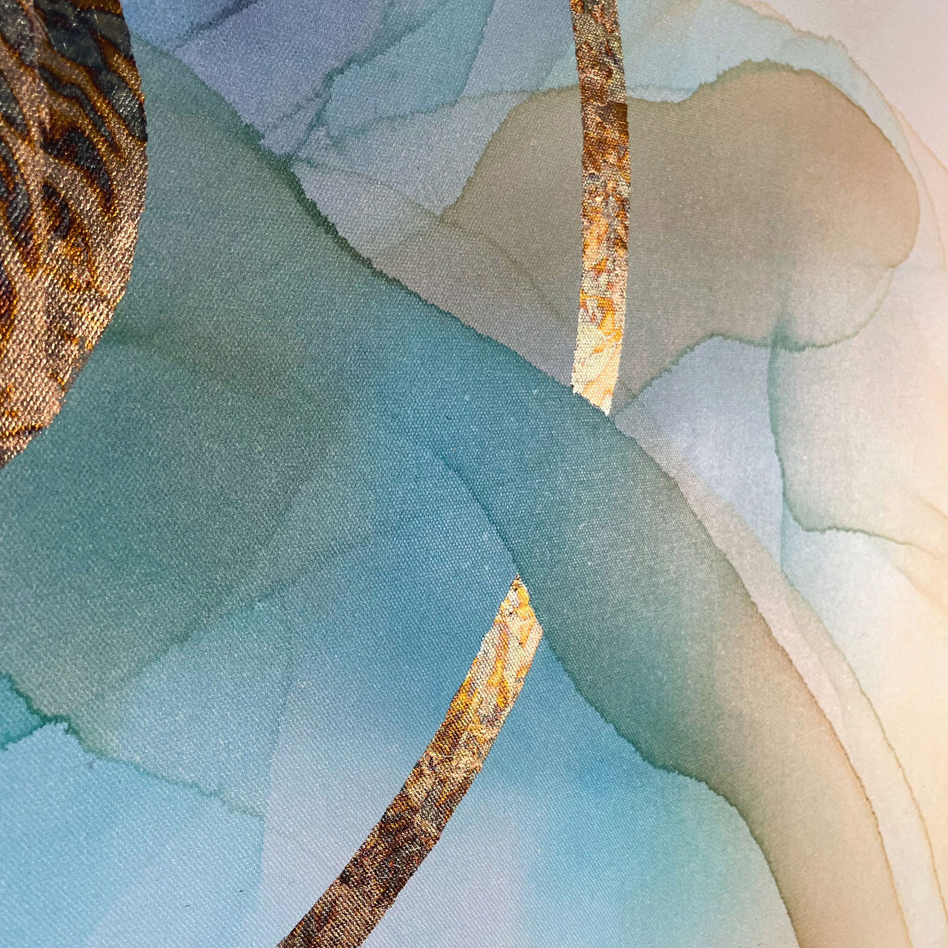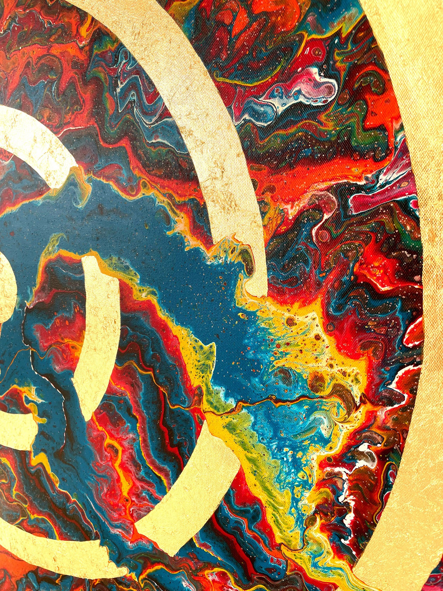 … Die meisten meiner Kompositionen sind geprägt von einem immer wiederkehrenden Merkmal, einem Symbol der Zeitlosigkeit und des Wohlstands – Gold. Ich verarbeite Gold als majestätischen Hintergrund, der die Augen des Betrachters verzaubert, oder in feinen Details, die wie funkelnde Reflexionen im Licht tanzen. Dieses edle Metall, ein Zeichen für Glanz und Beständigkeit, verschmilzt mit den fließenden Farben und den komplexen Strukturen meiner Werke.