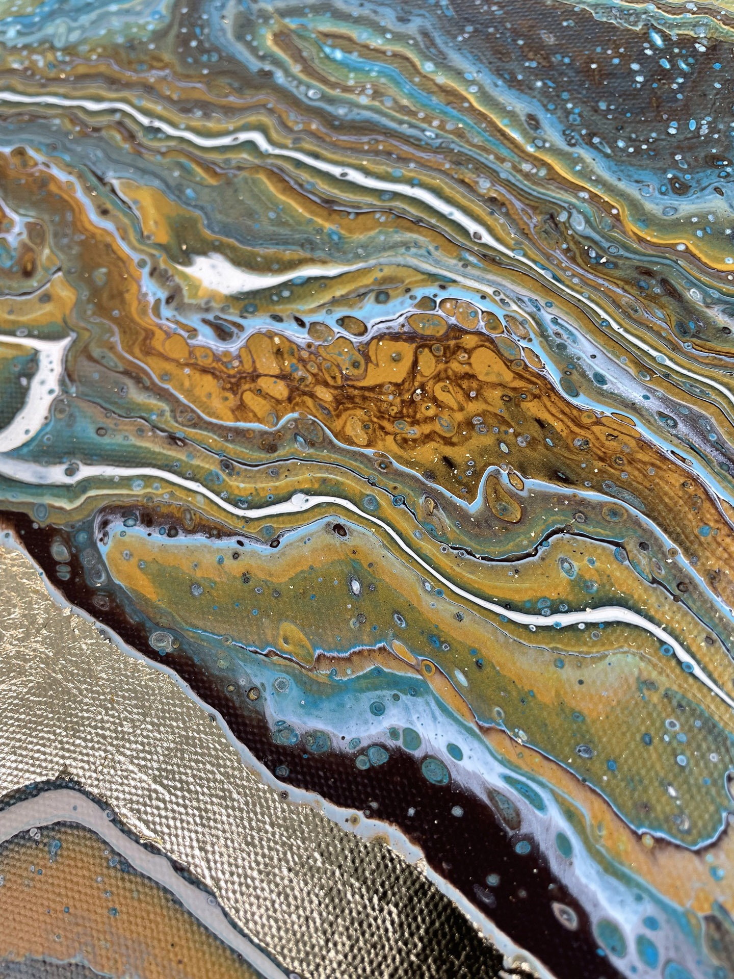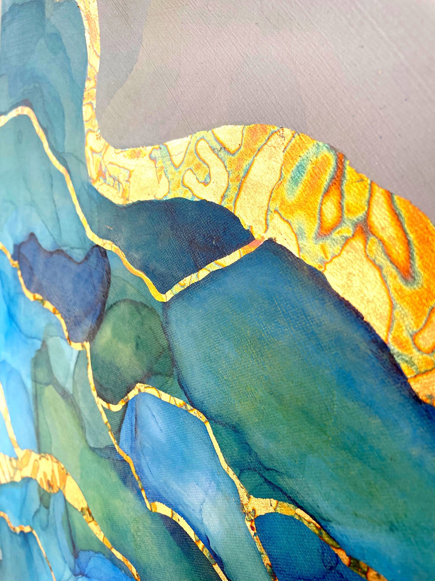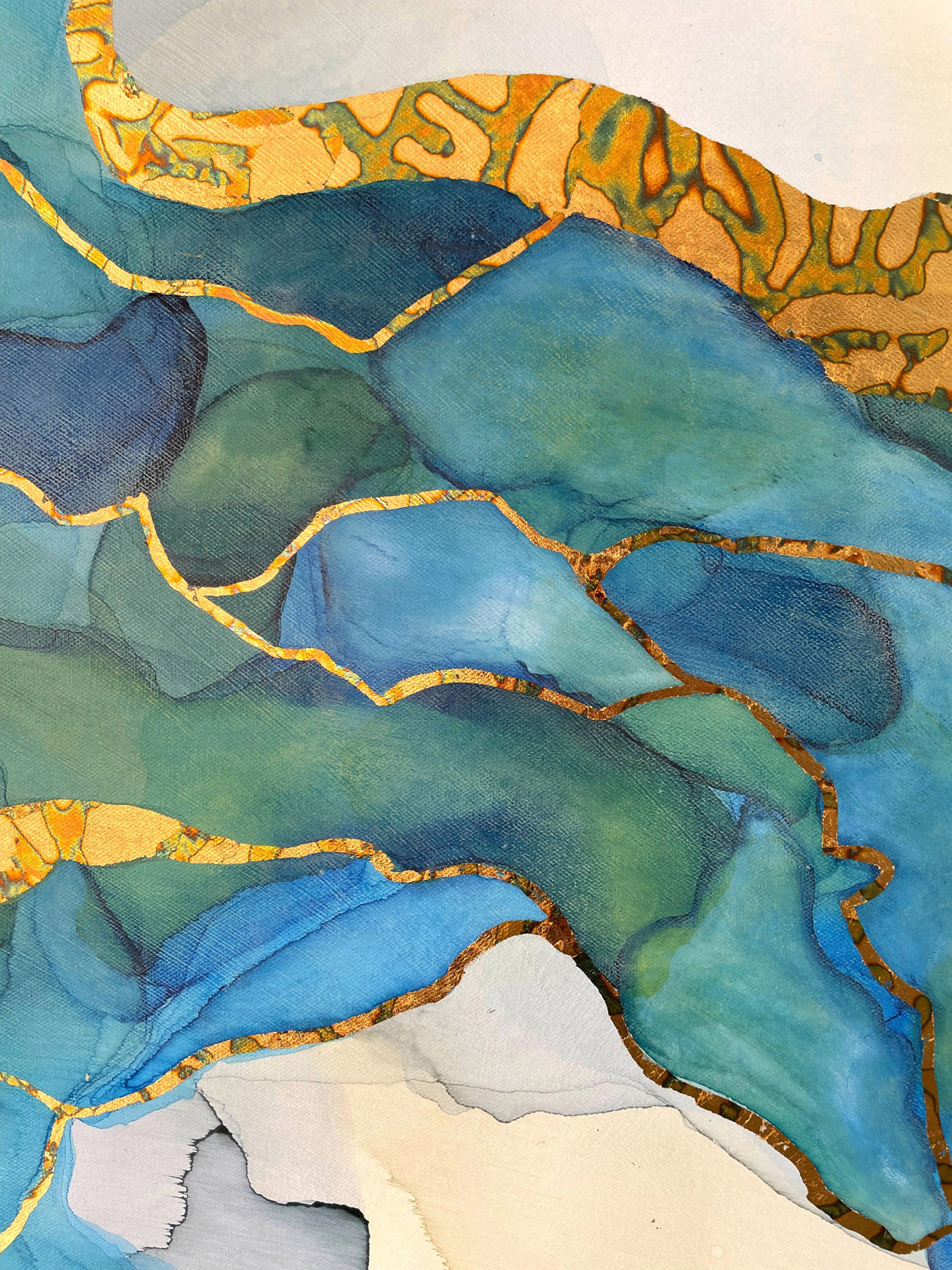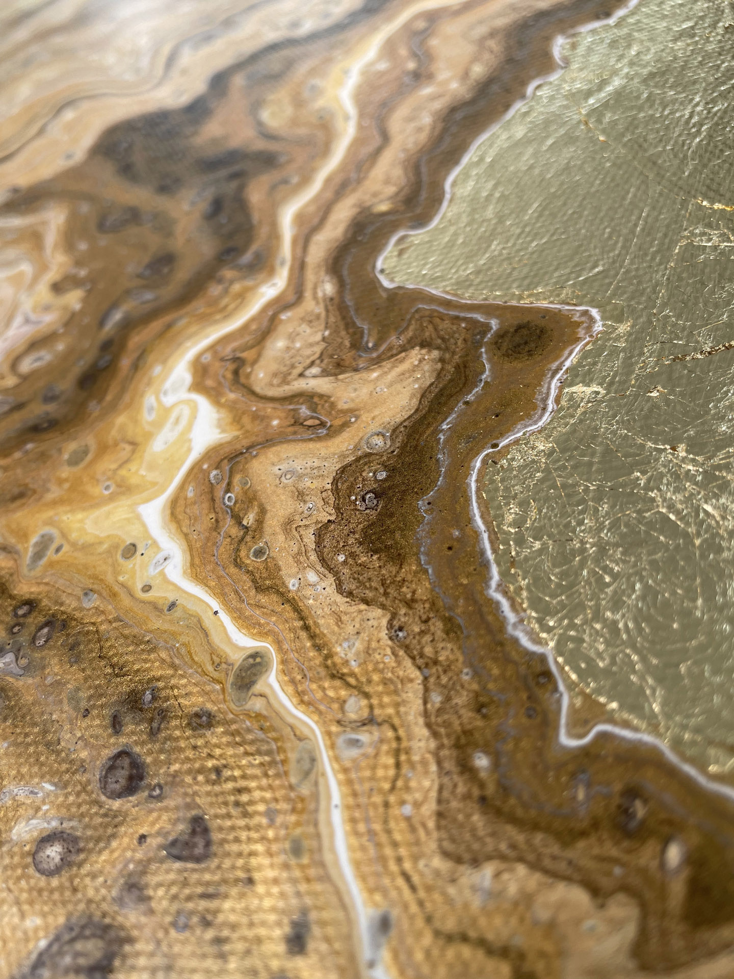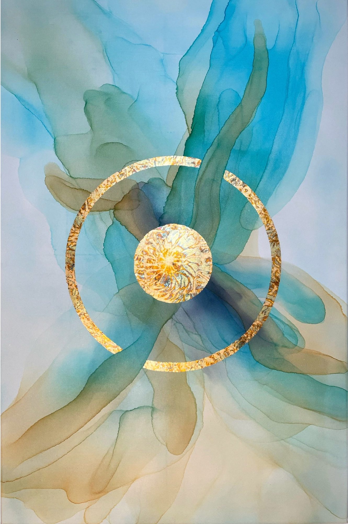 … Die meisten meiner Kompositionen sind geprägt von einem immer wiederkehrenden Merkmal, einem Symbol der Zeitlosigkeit und des Wohlstands – Gold. Ich verarbeite Gold als majestätischen Hintergrund, der die Augen des Betrachters verzaubert, oder in feinen Details, die wie funkelnde Reflexionen im Licht tanzen. Dieses edle Metall, ein Zeichen für Glanz und Beständigkeit, verschmilzt mit den fließenden Farben und den komplexen Strukturen meiner Werke.