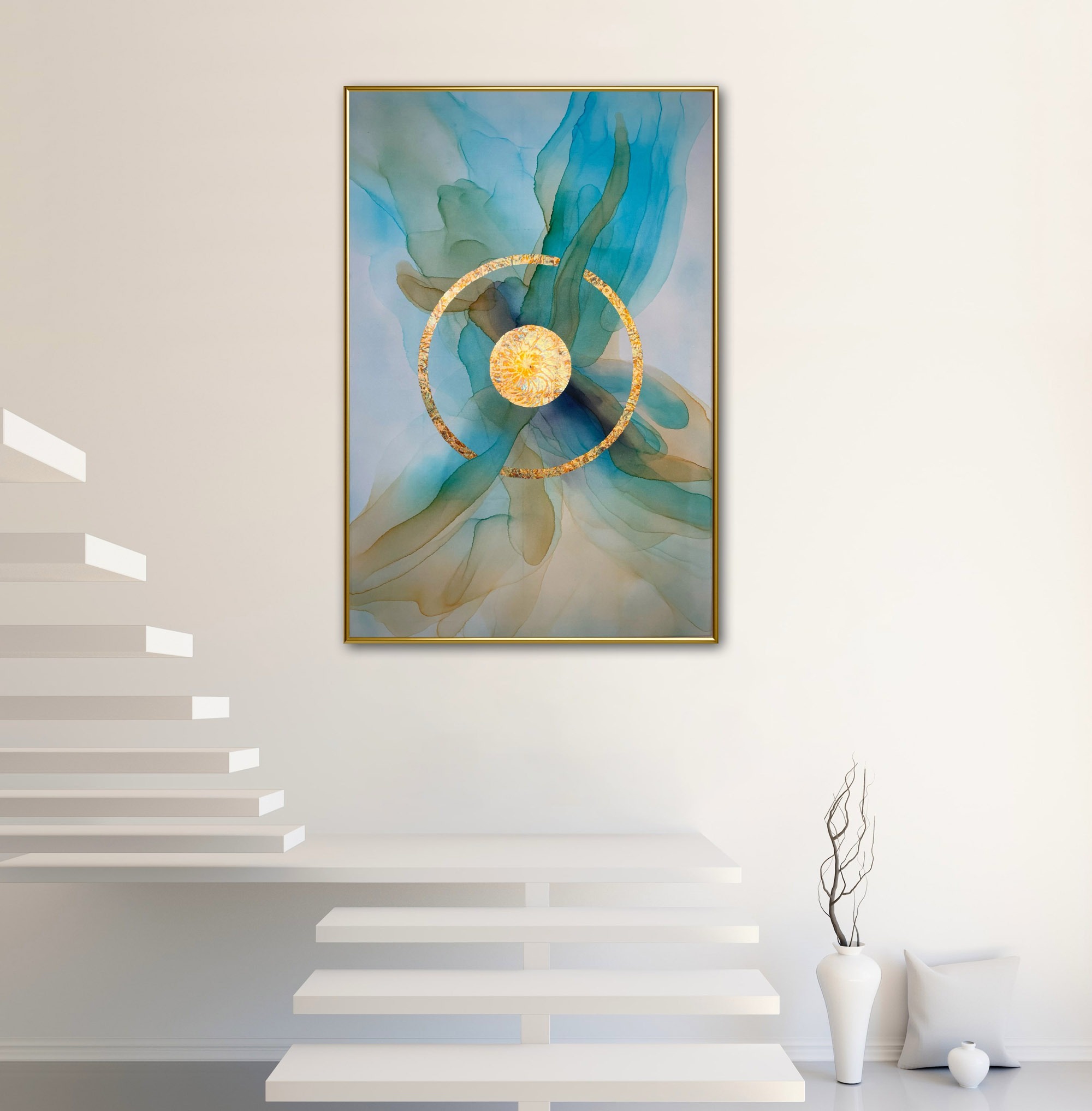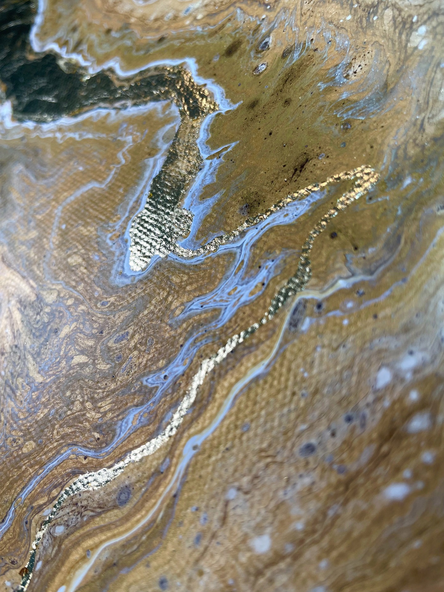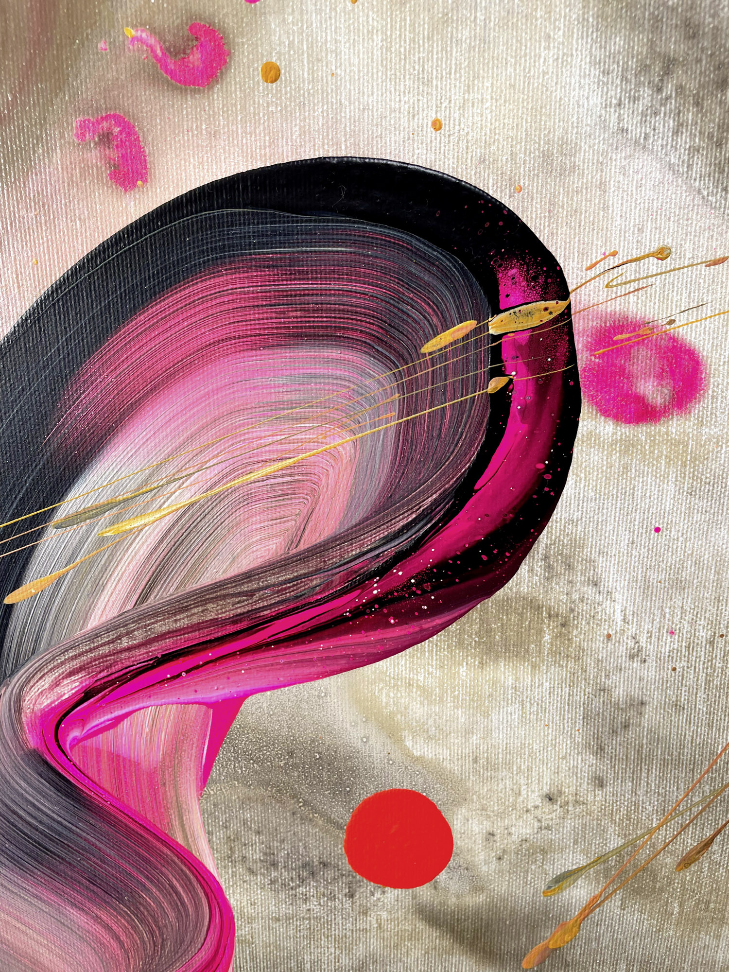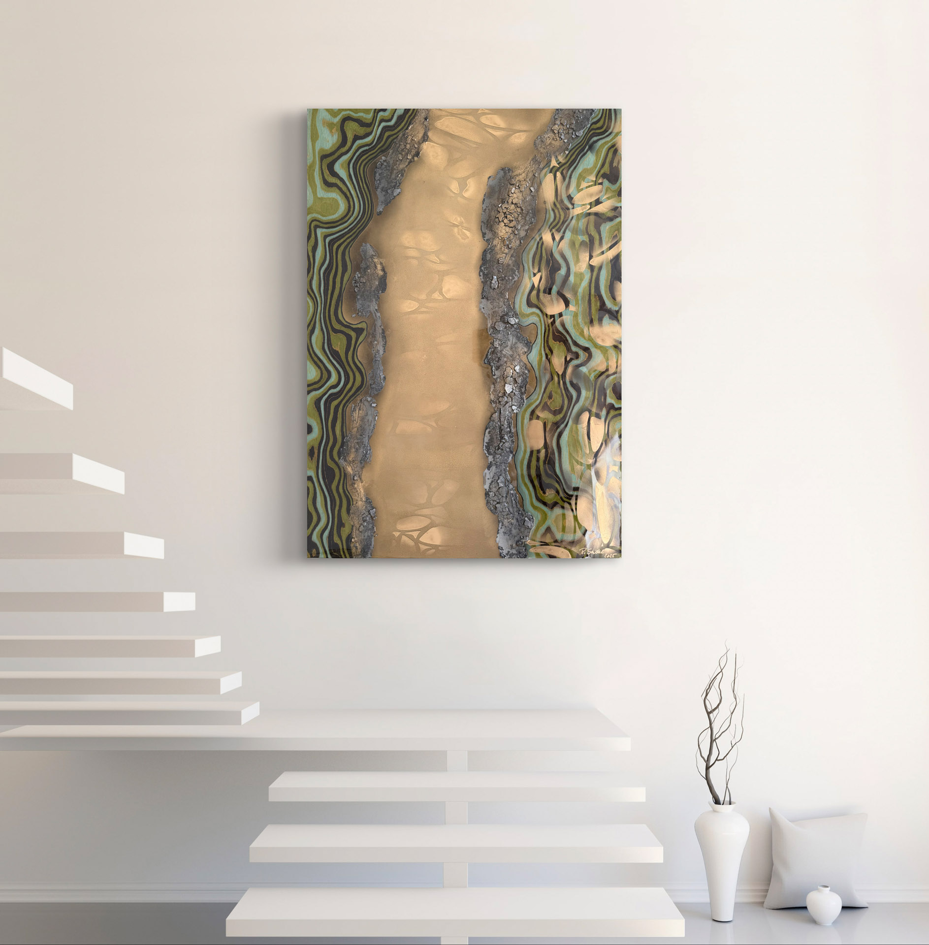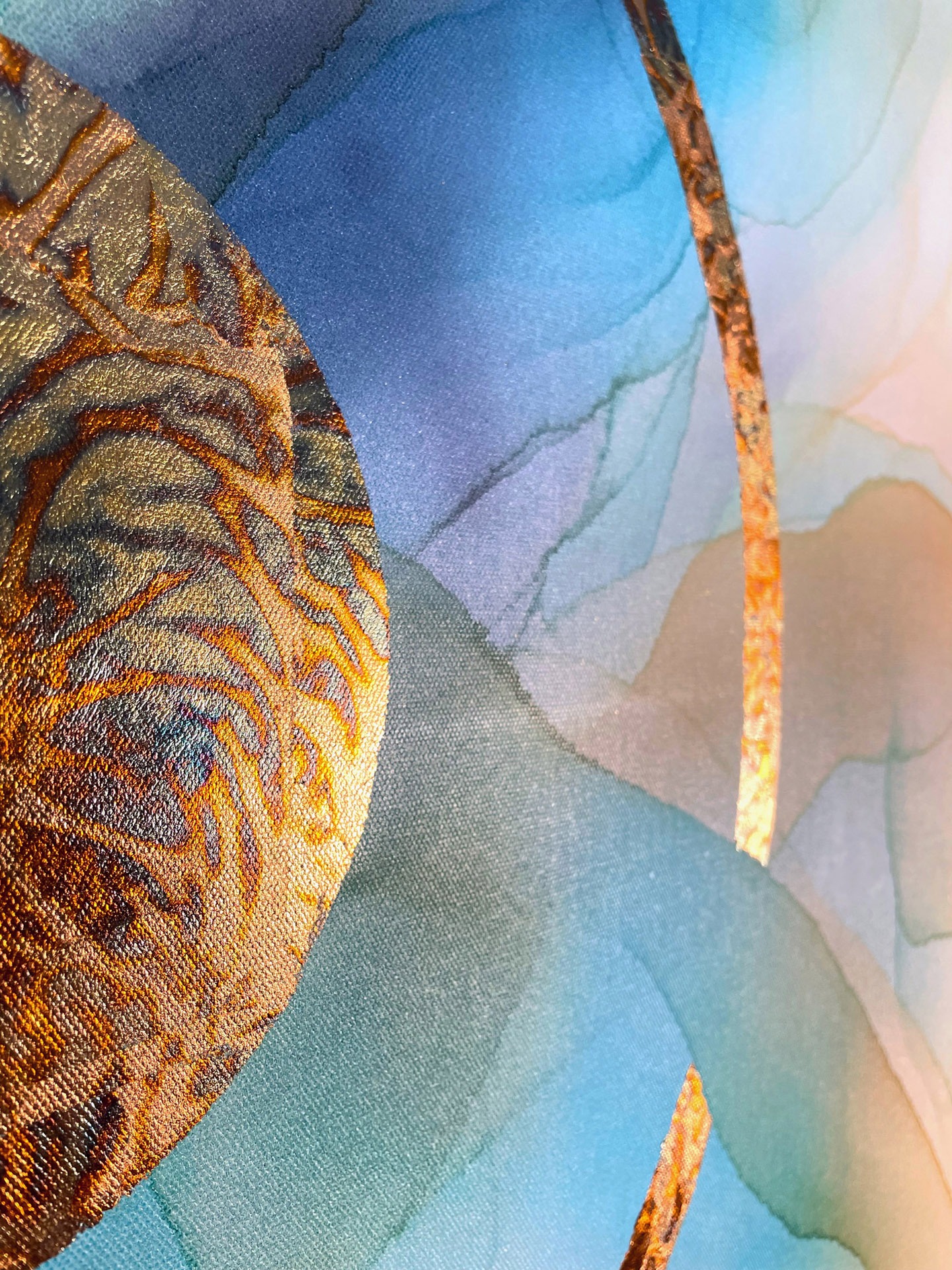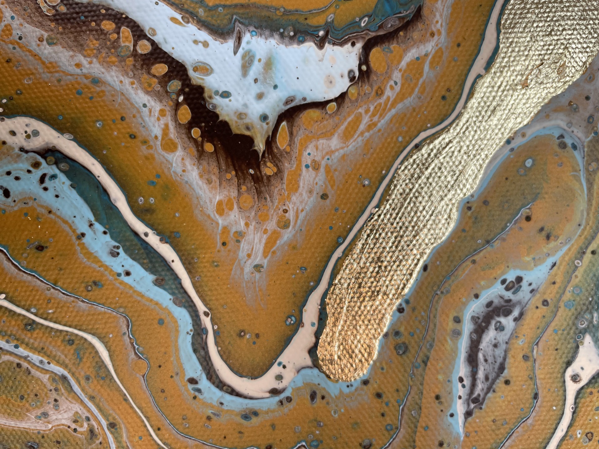 … Die meisten meiner Kompositionen sind geprägt von einem immer wiederkehrenden Merkmal, einem Symbol der Zeitlosigkeit und des Wohlstands – Gold. Ich verarbeite Gold als majestätischen Hintergrund, der die Augen des Betrachters verzaubert, oder in feinen Details, die wie funkelnde Reflexionen im Licht tanzen. Dieses edle Metall, ein Zeichen für Glanz und Beständigkeit, verschmilzt mit den fließenden Farben und den komplexen Strukturen meiner Werke.