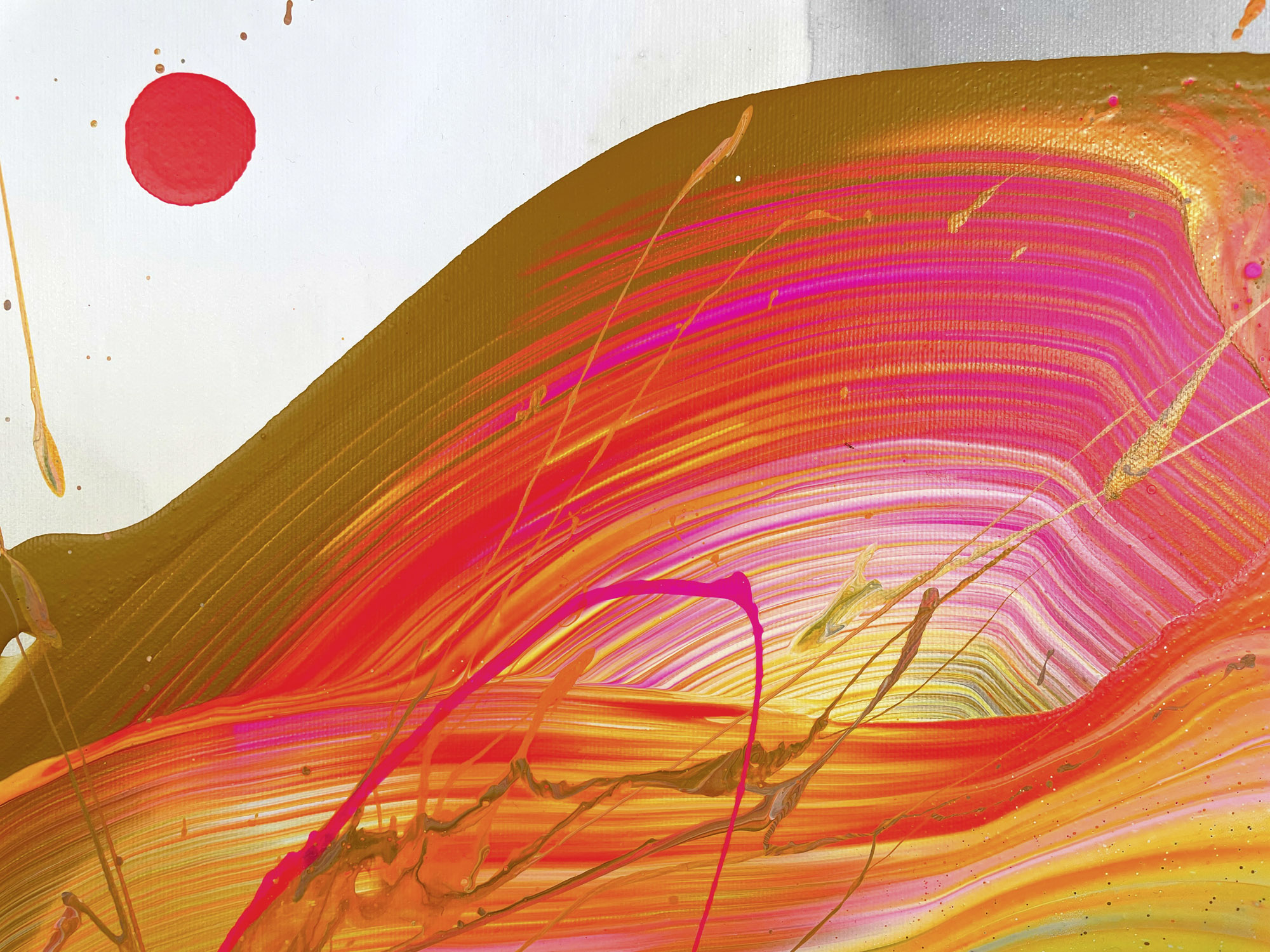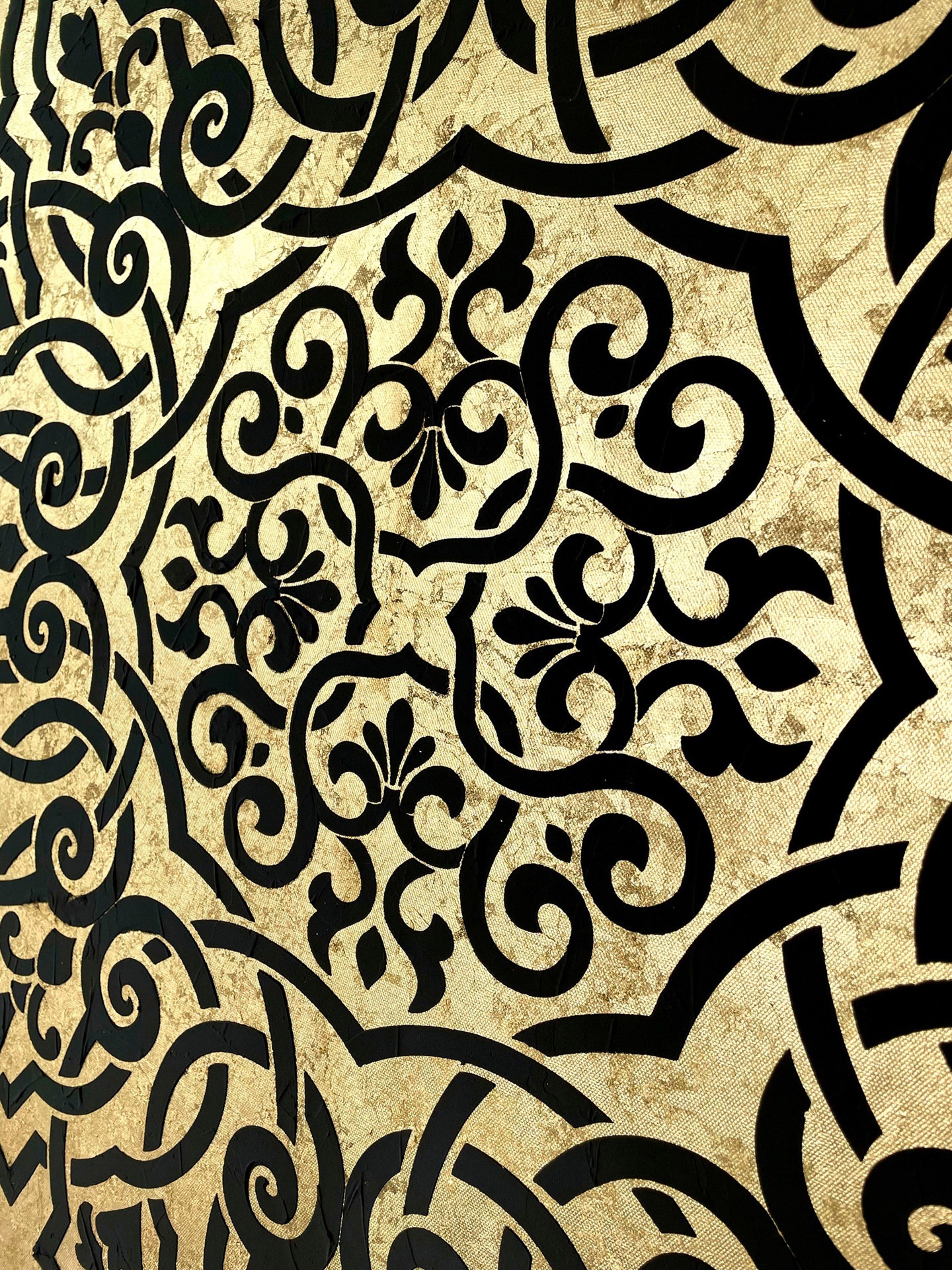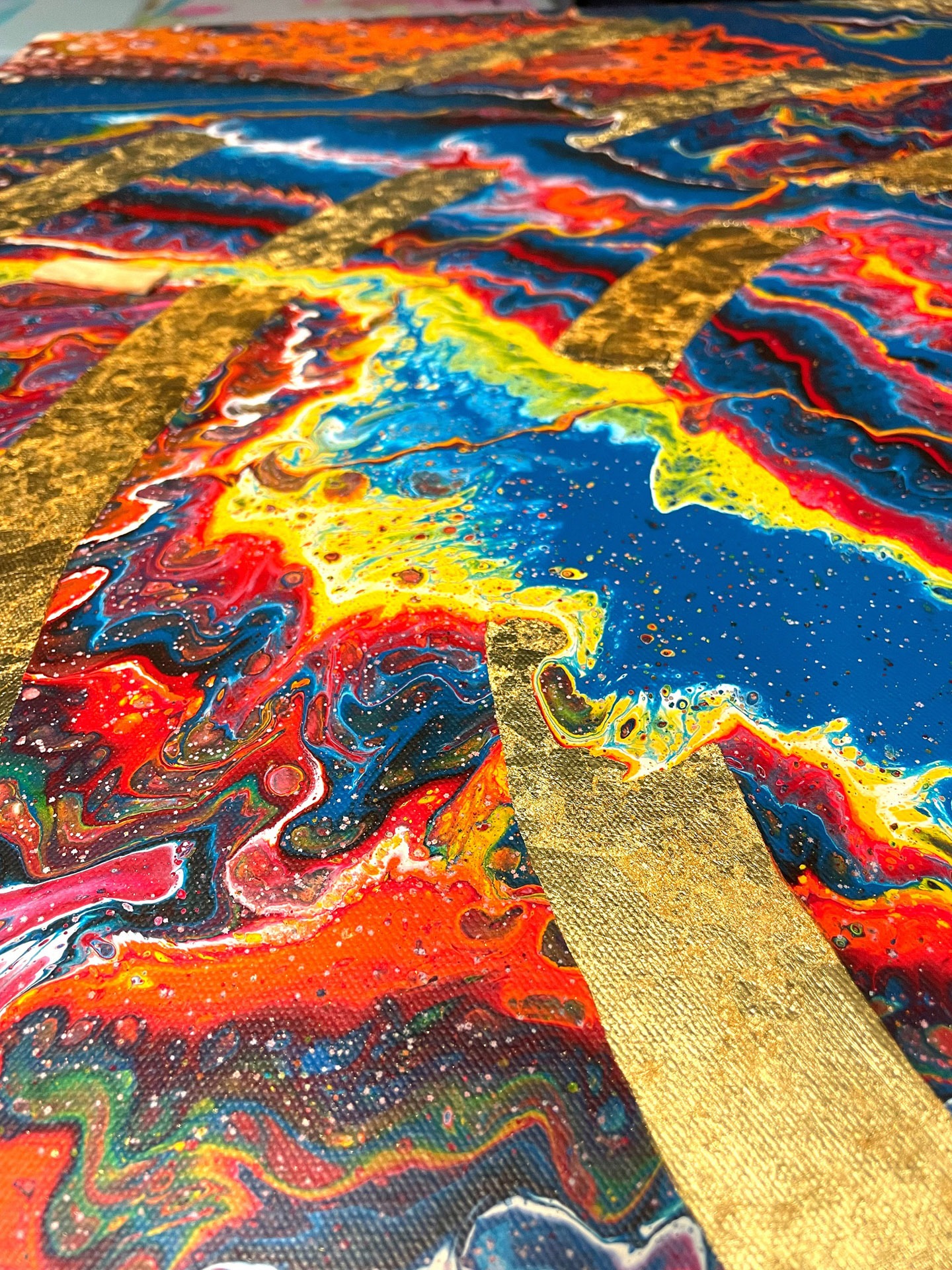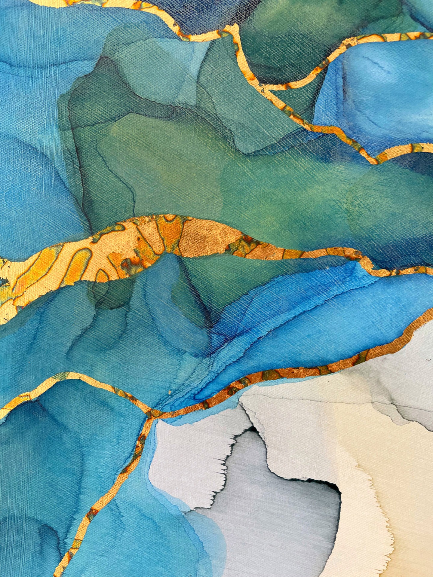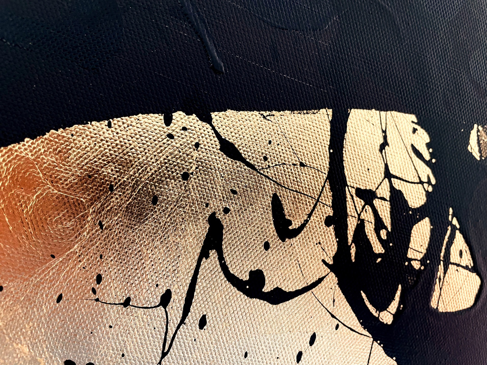 … Die meisten meiner Kompositionen sind geprägt von einem immer wiederkehrenden Merkmal, einem Symbol der Zeitlosigkeit und des Wohlstands – Gold. Ich verarbeite Gold als majestätischen Hintergrund, der die Augen des Betrachters verzaubert, oder in feinen Details, die wie funkelnde Reflexionen im Licht tanzen. Dieses edle Metall, ein Zeichen für Glanz und Beständigkeit, verschmilzt mit den fließenden Farben und den komplexen Strukturen meiner Werke.