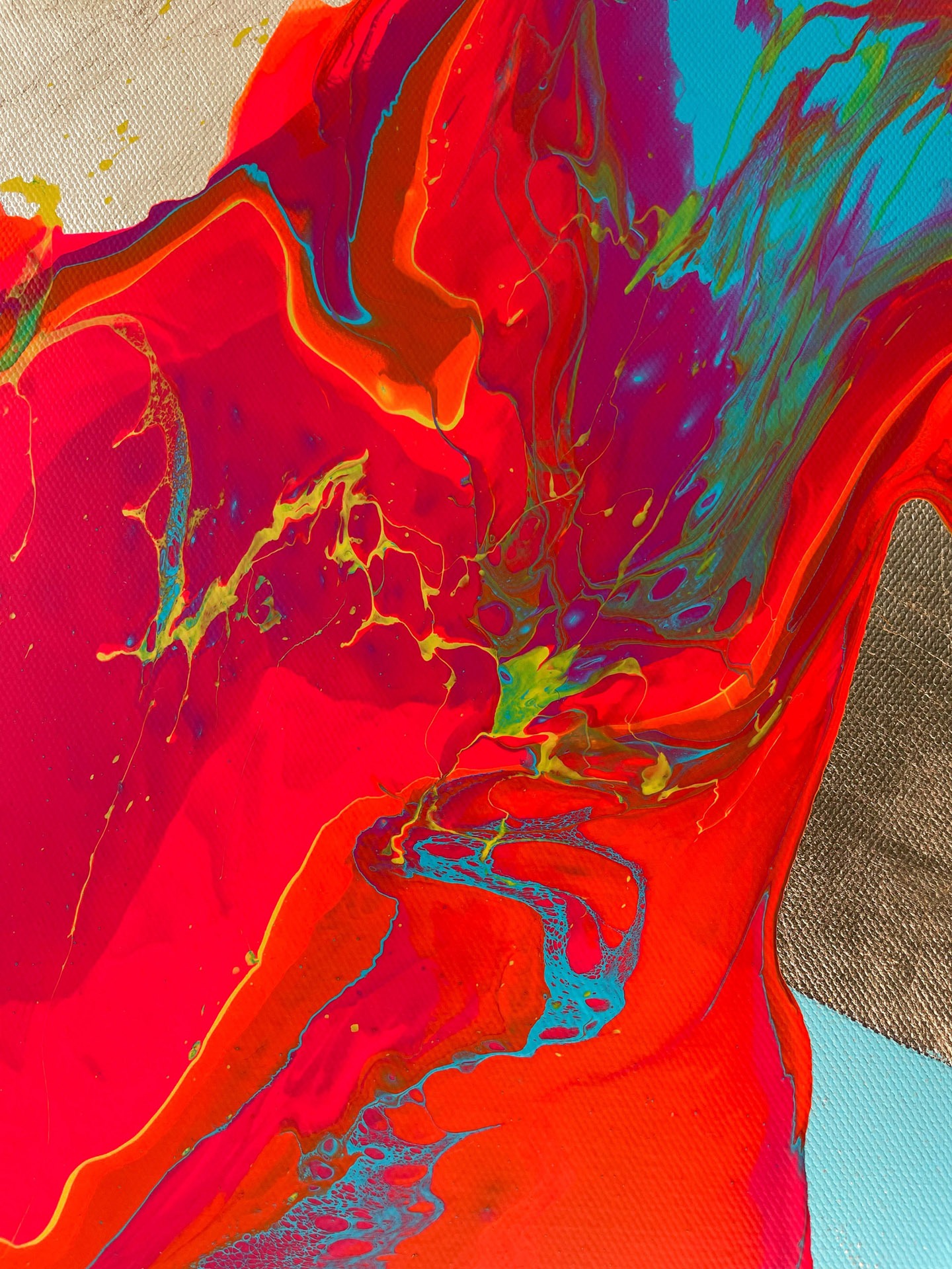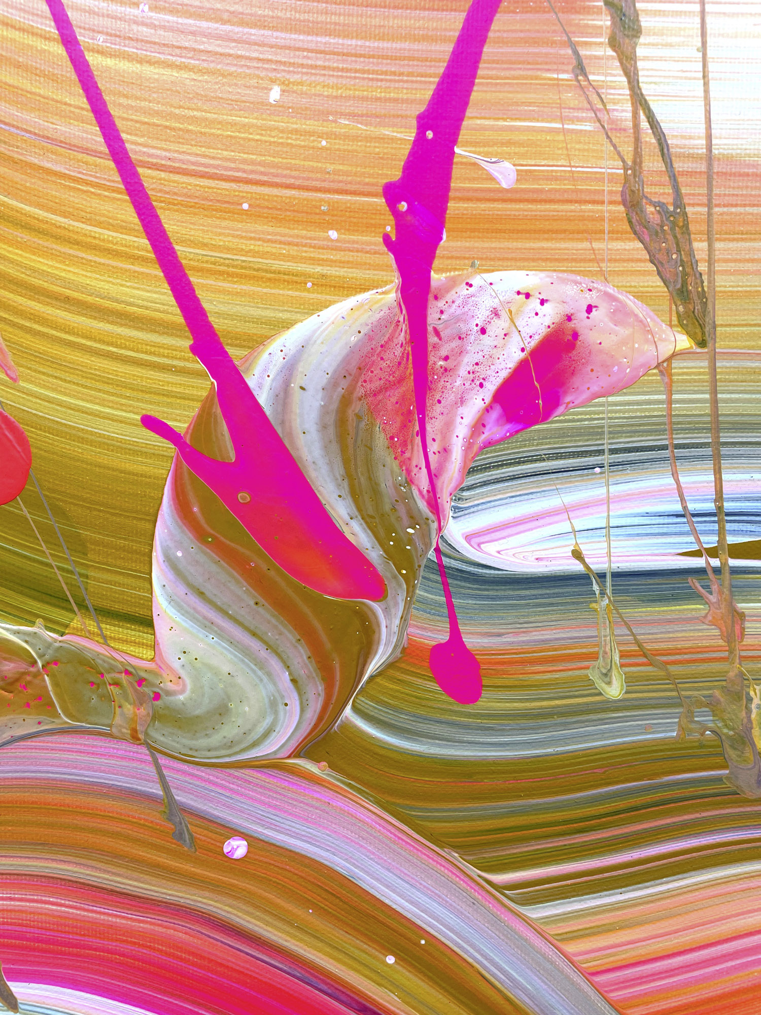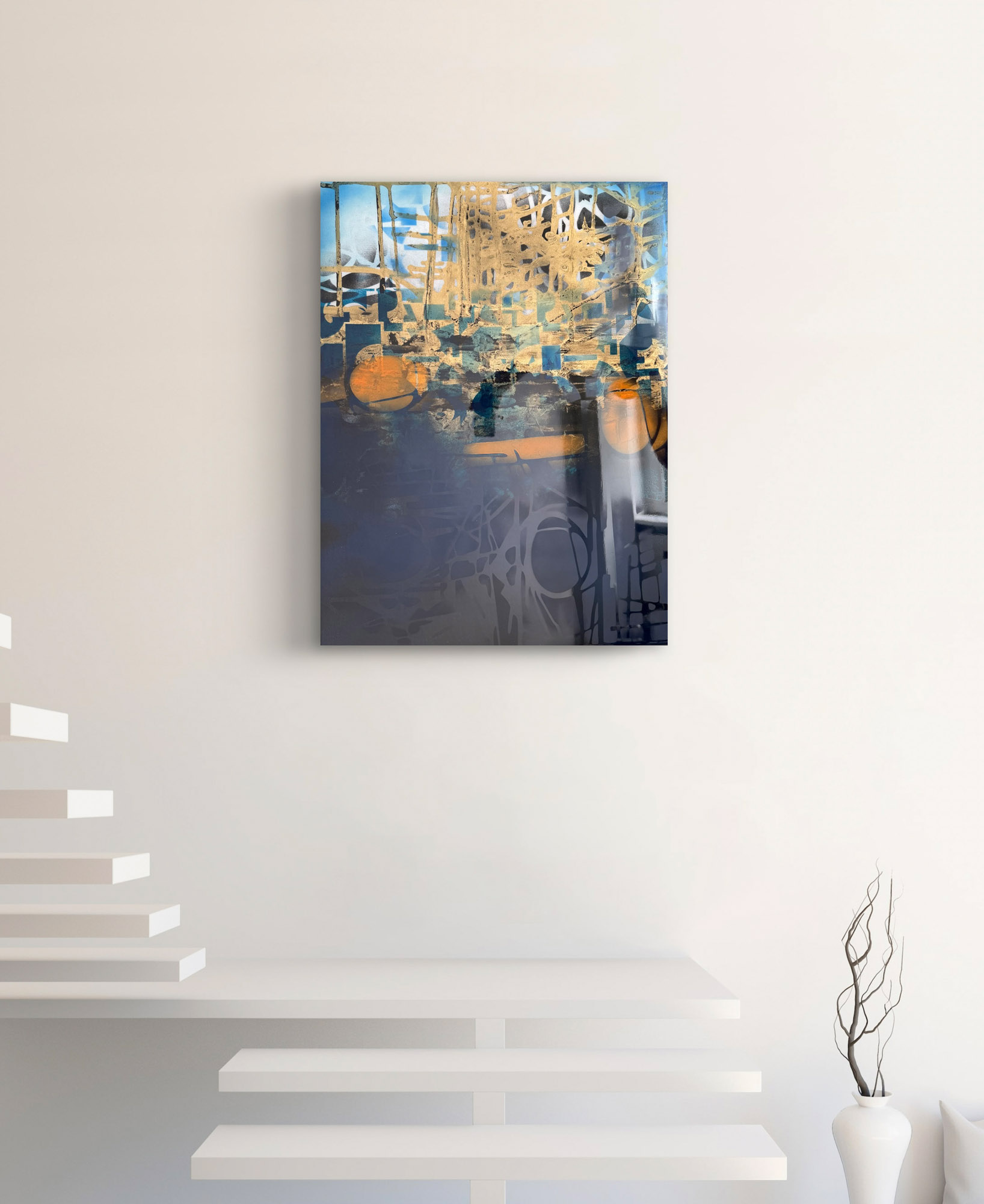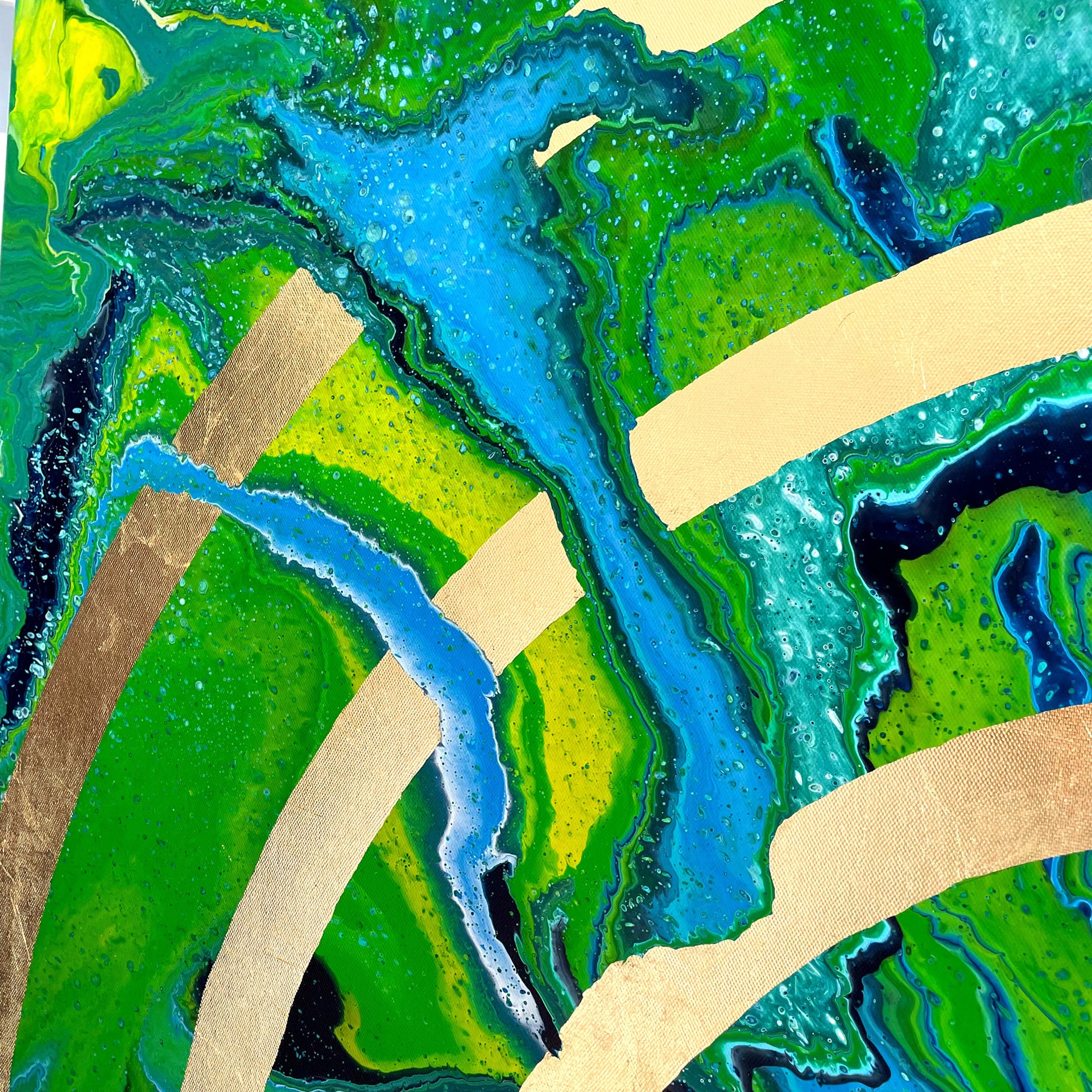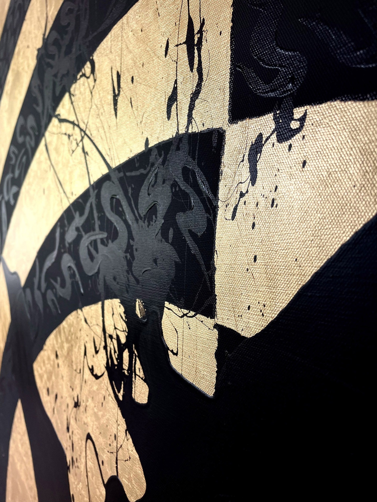 … Die meisten meiner Kompositionen sind geprägt von einem immer wiederkehrenden Merkmal, einem Symbol der Zeitlosigkeit und des Wohlstands – Gold. Ich verarbeite Gold als majestätischen Hintergrund, der die Augen des Betrachters verzaubert, oder in feinen Details, die wie funkelnde Reflexionen im Licht tanzen. Dieses edle Metall, ein Zeichen für Glanz und Beständigkeit, verschmilzt mit den fließenden Farben und den komplexen Strukturen meiner Werke.