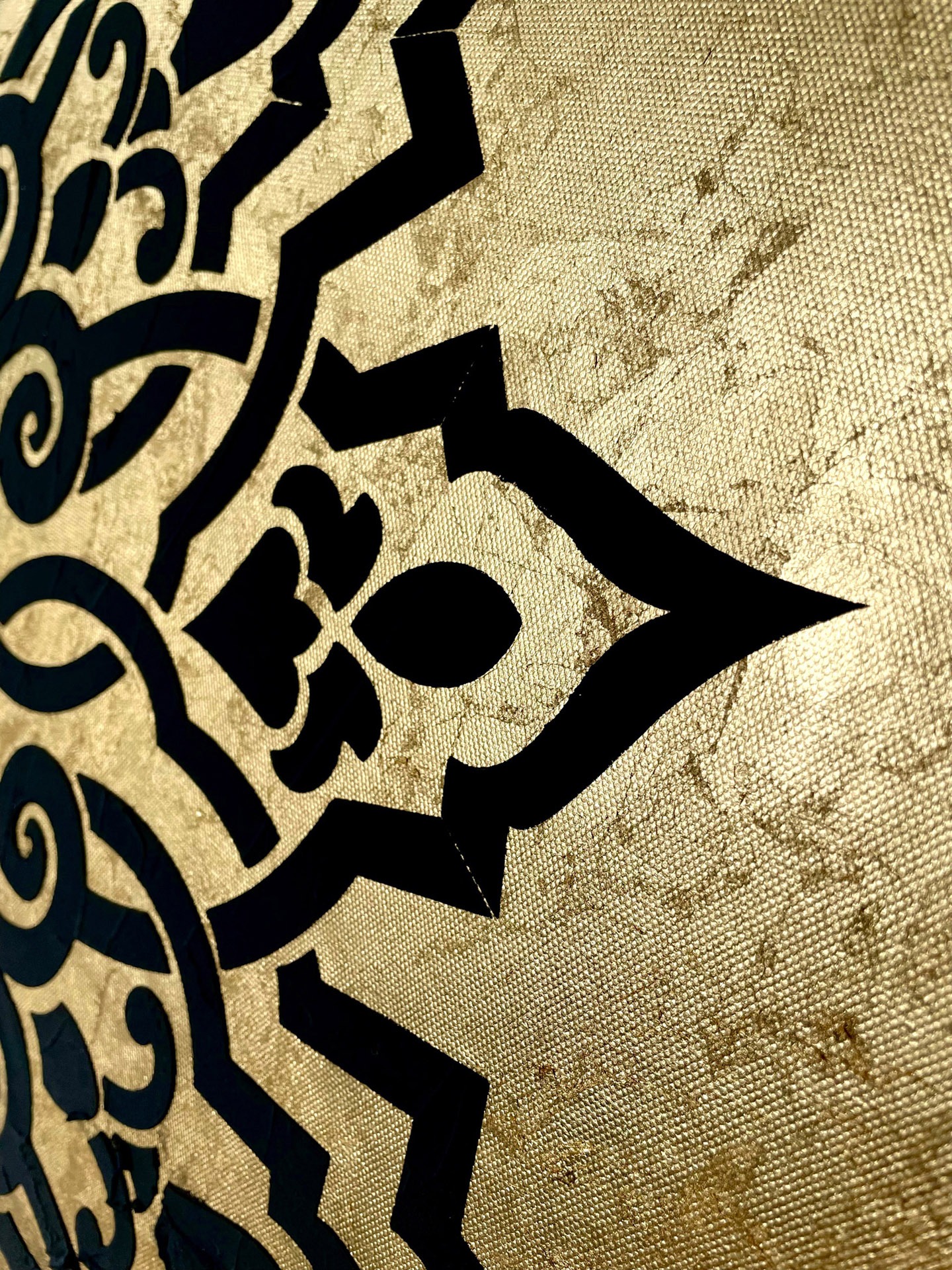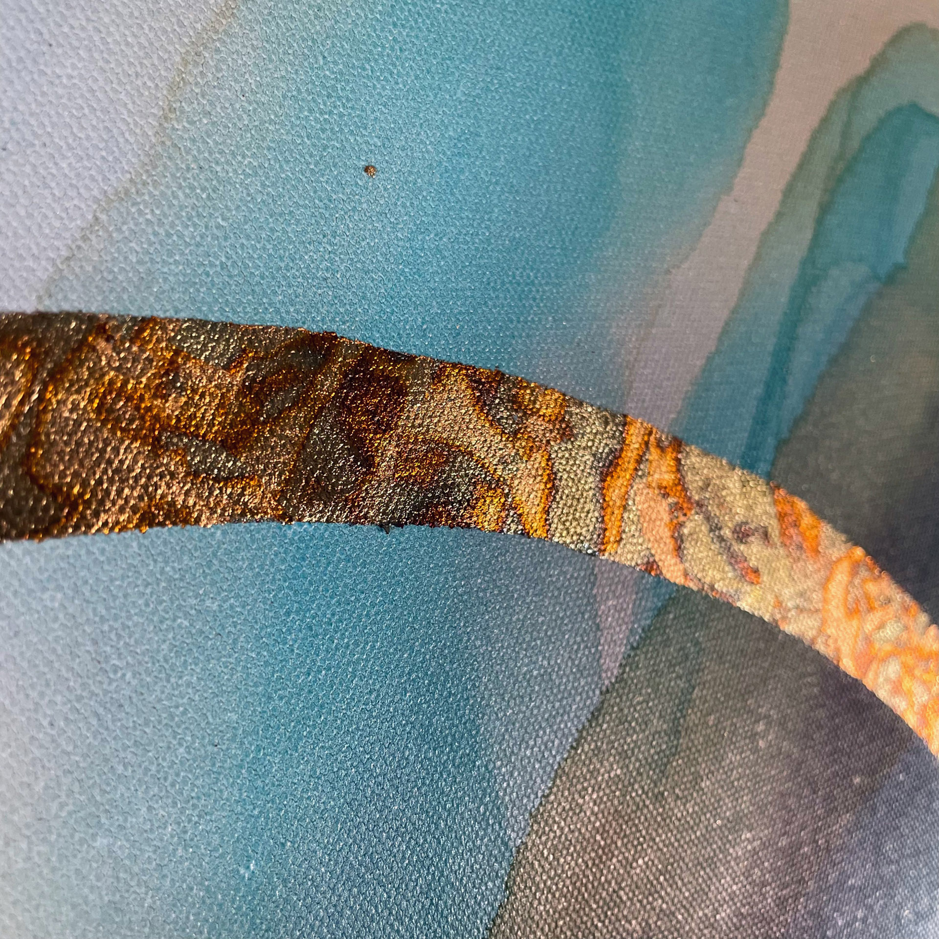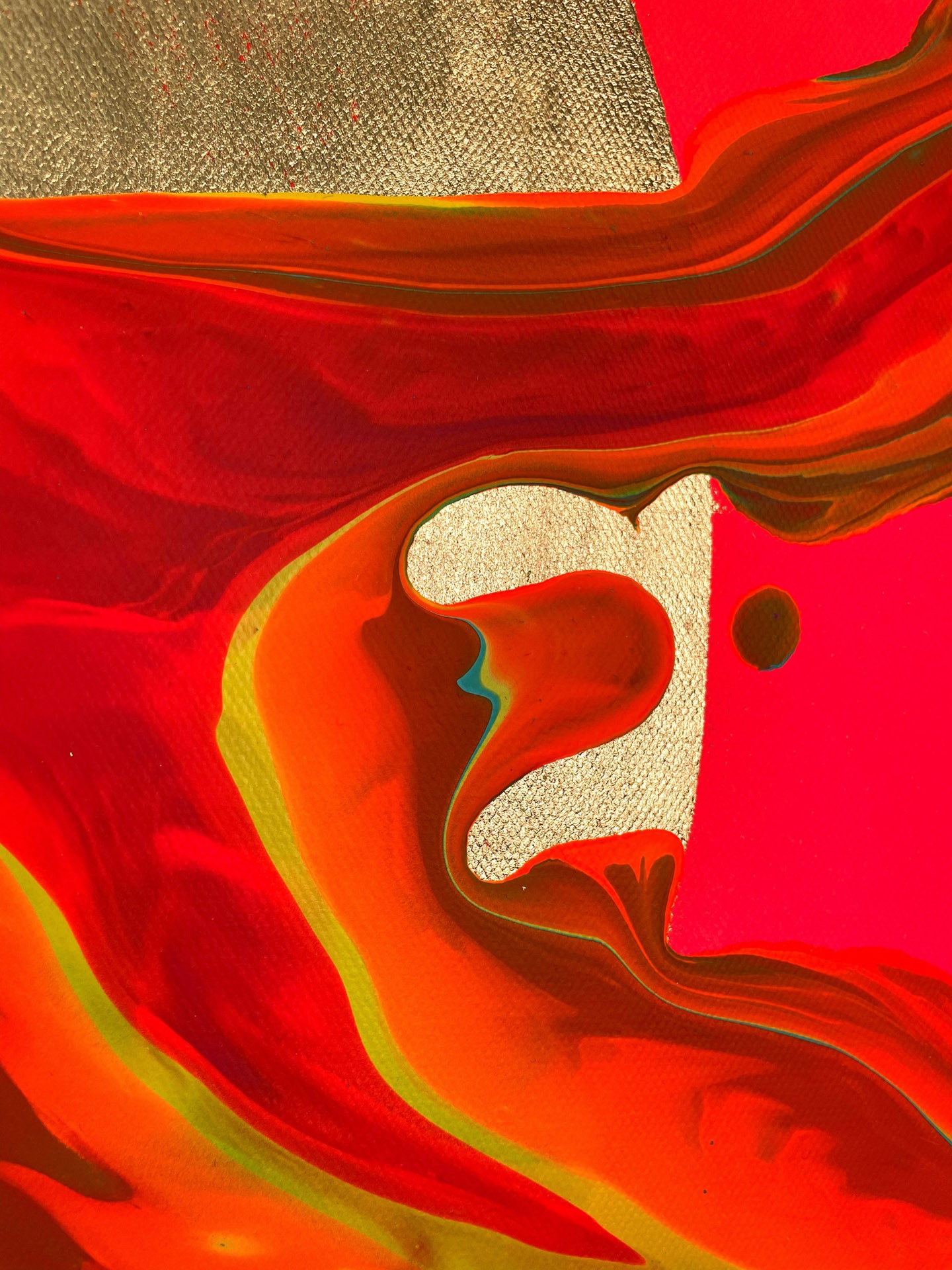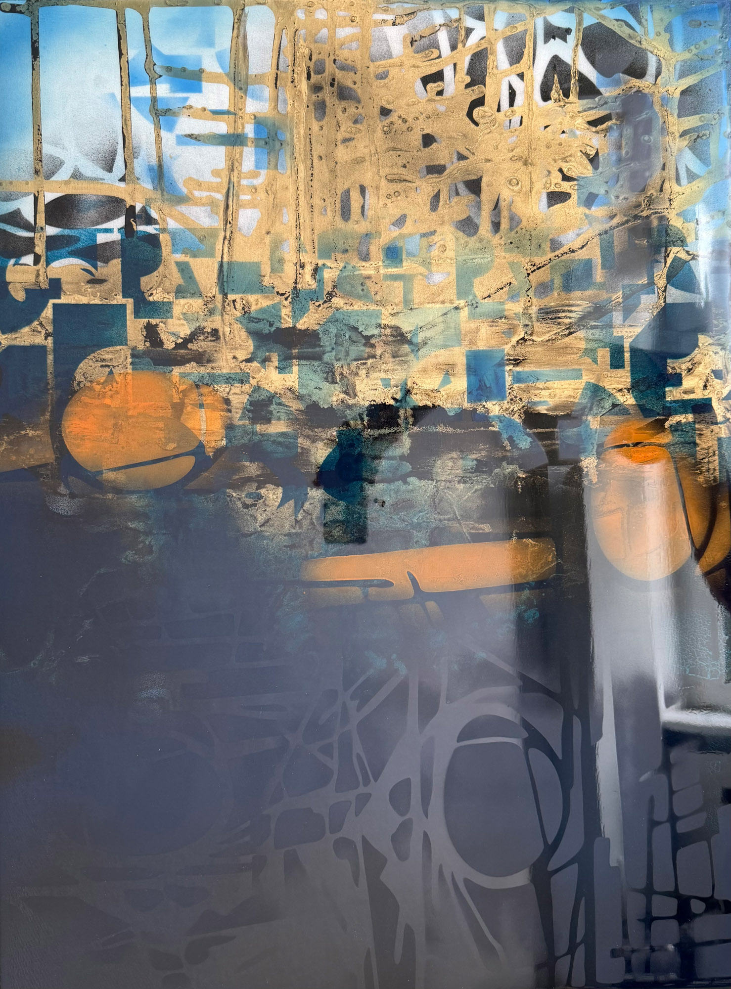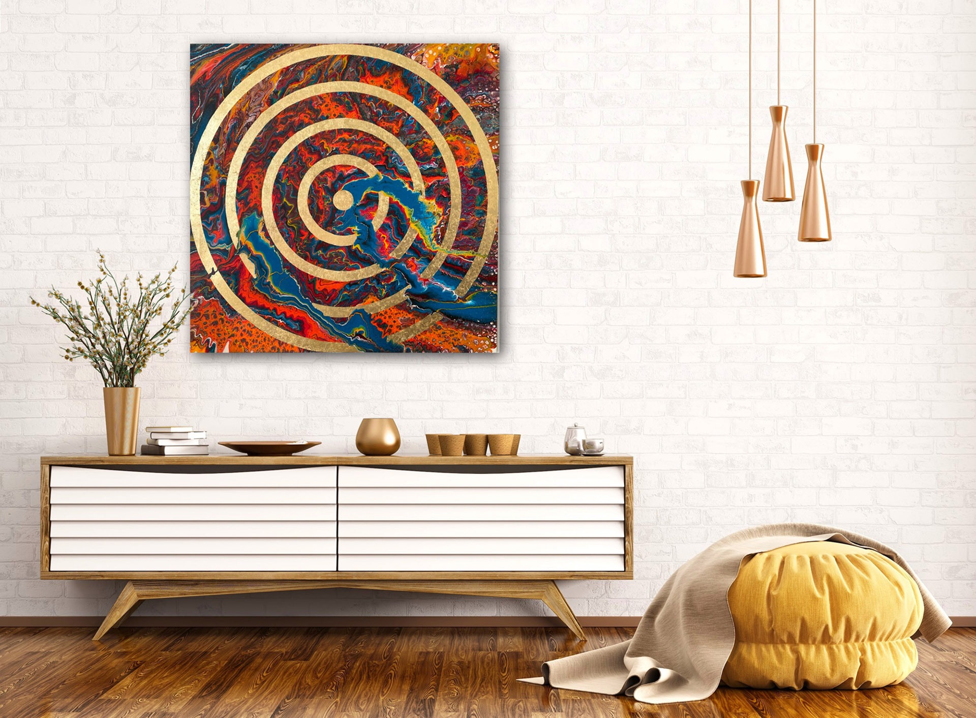 … Die meisten meiner Kompositionen sind geprägt von einem immer wiederkehrenden Merkmal, einem Symbol der Zeitlosigkeit und des Wohlstands – Gold. Ich verarbeite Gold als majestätischen Hintergrund, der die Augen des Betrachters verzaubert, oder in feinen Details, die wie funkelnde Reflexionen im Licht tanzen. Dieses edle Metall, ein Zeichen für Glanz und Beständigkeit, verschmilzt mit den fließenden Farben und den komplexen Strukturen meiner Werke.