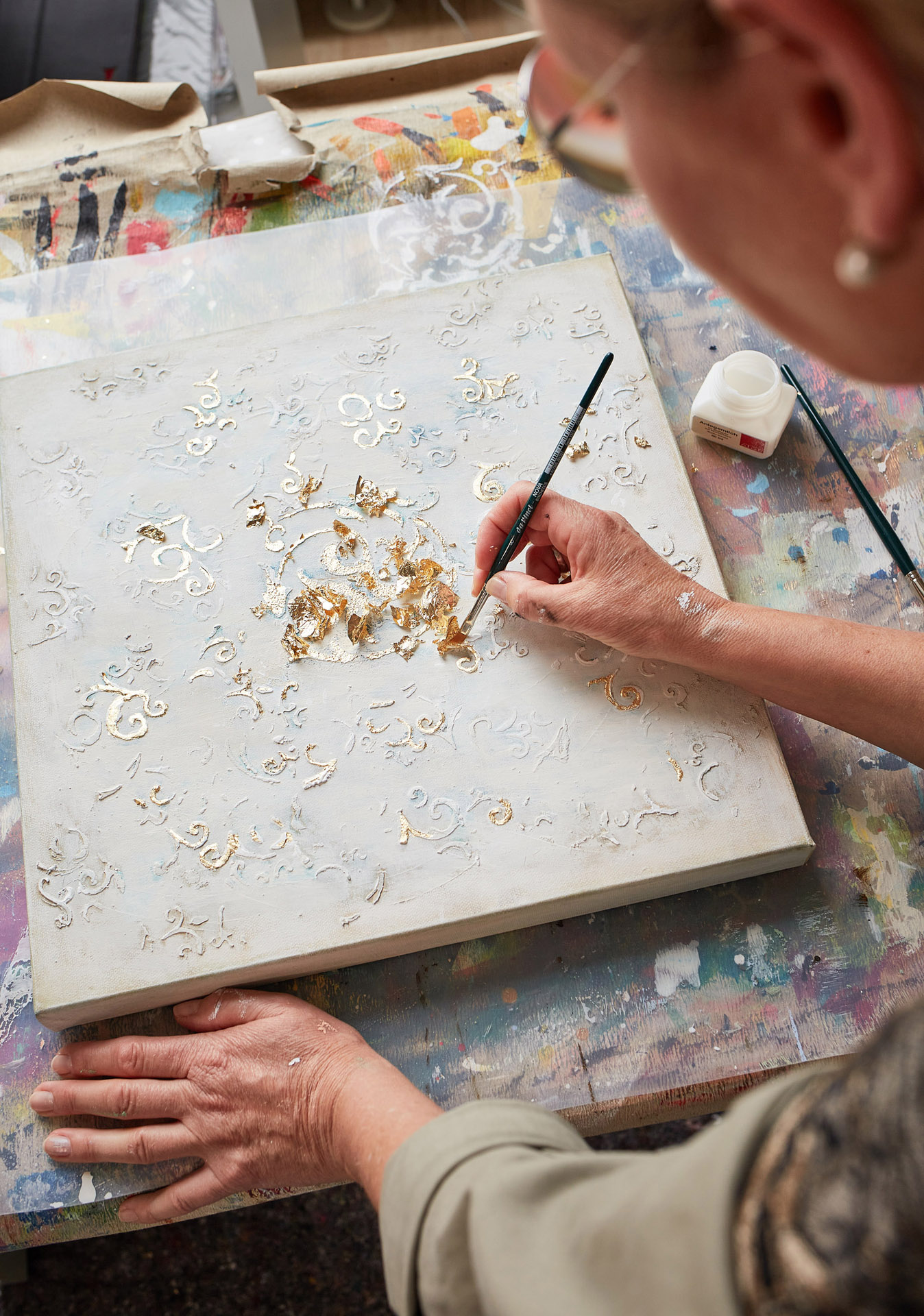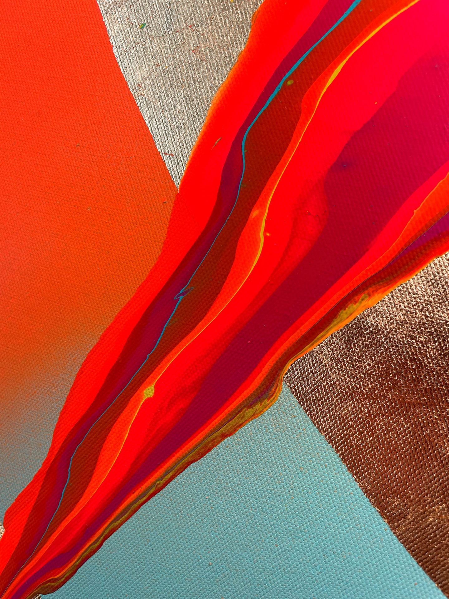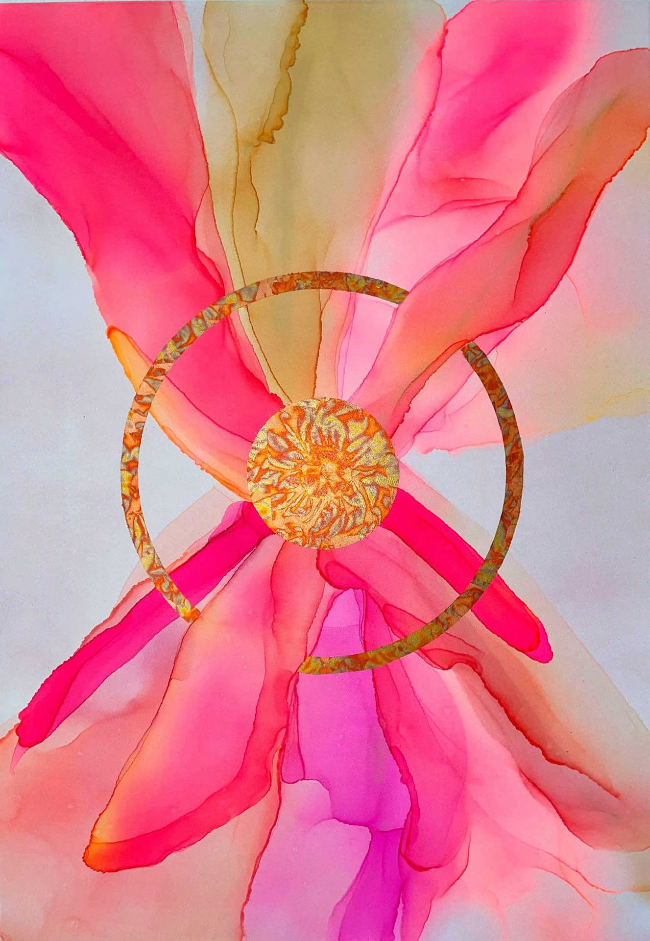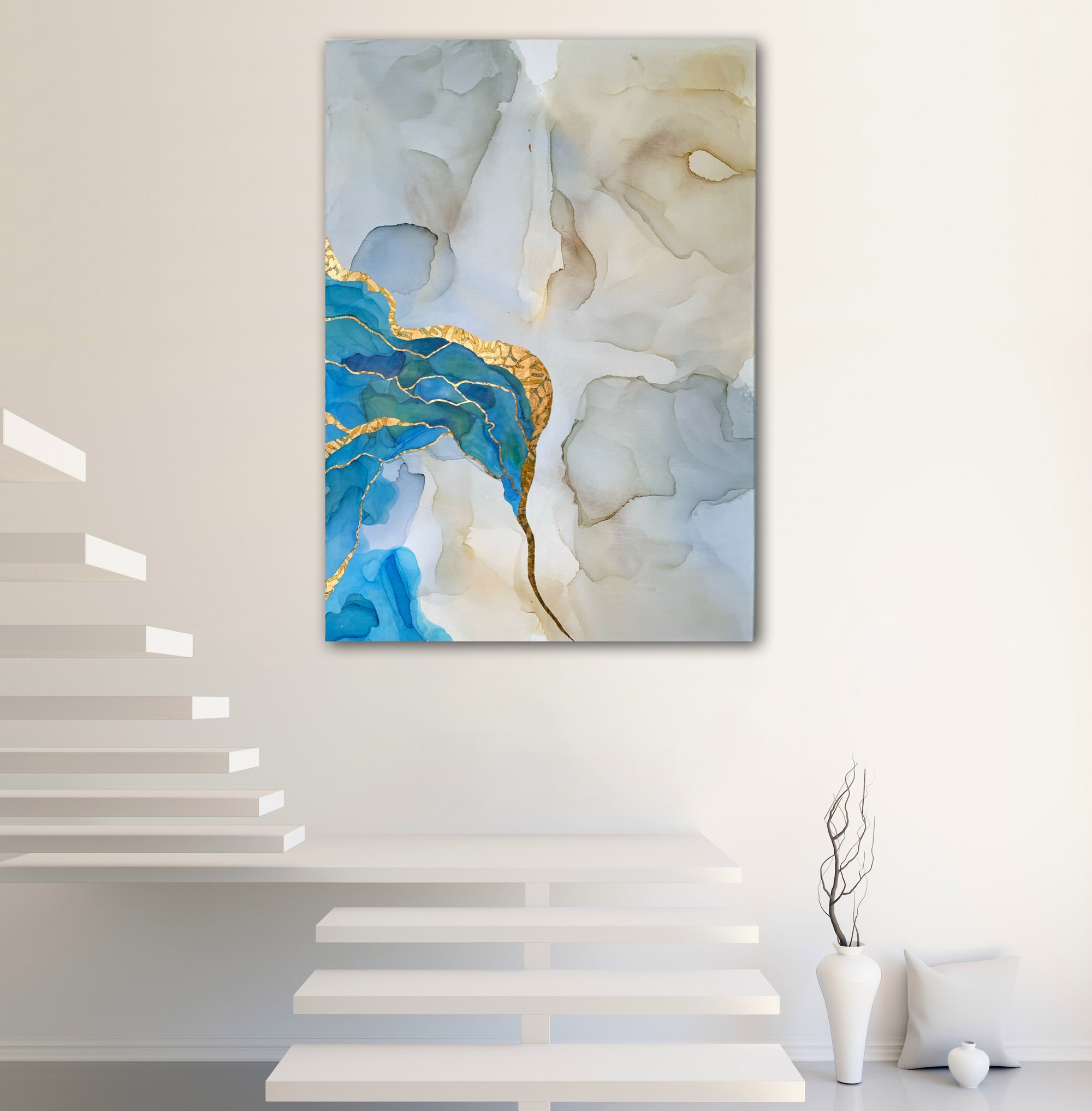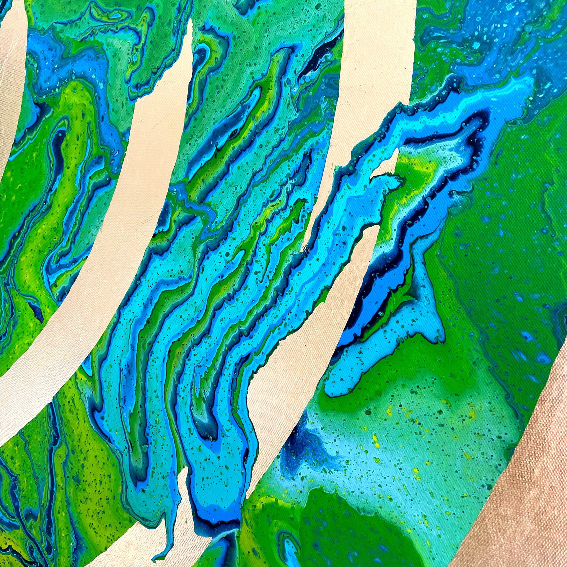 … Die meisten meiner Kompositionen sind geprägt von einem immer wiederkehrenden Merkmal, einem Symbol der Zeitlosigkeit und des Wohlstands – Gold. Ich verarbeite Gold als majestätischen Hintergrund, der die Augen des Betrachters verzaubert, oder in feinen Details, die wie funkelnde Reflexionen im Licht tanzen. Dieses edle Metall, ein Zeichen für Glanz und Beständigkeit, verschmilzt mit den fließenden Farben und den komplexen Strukturen meiner Werke.