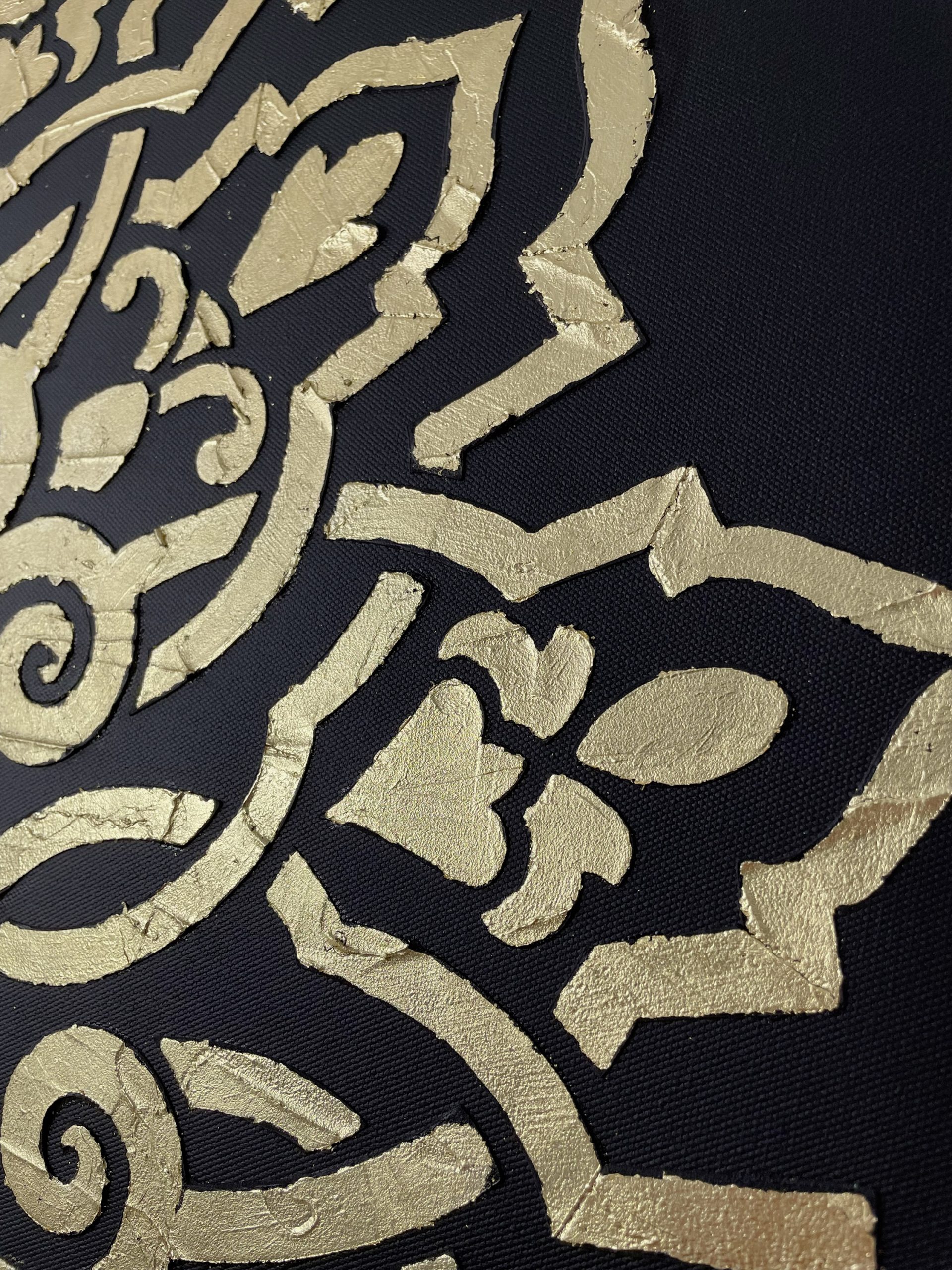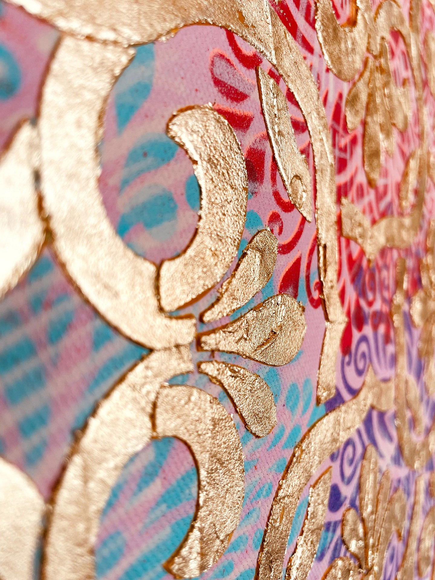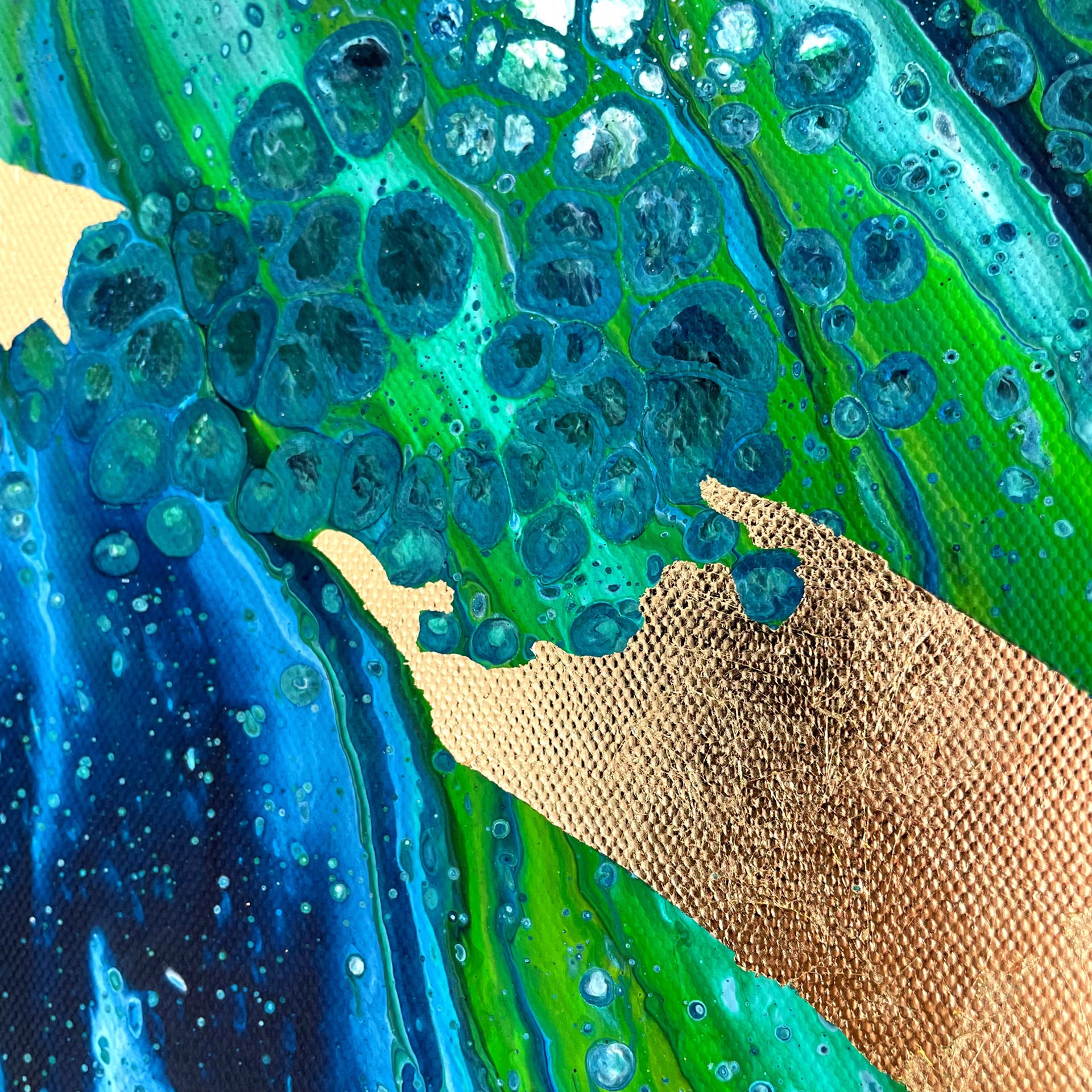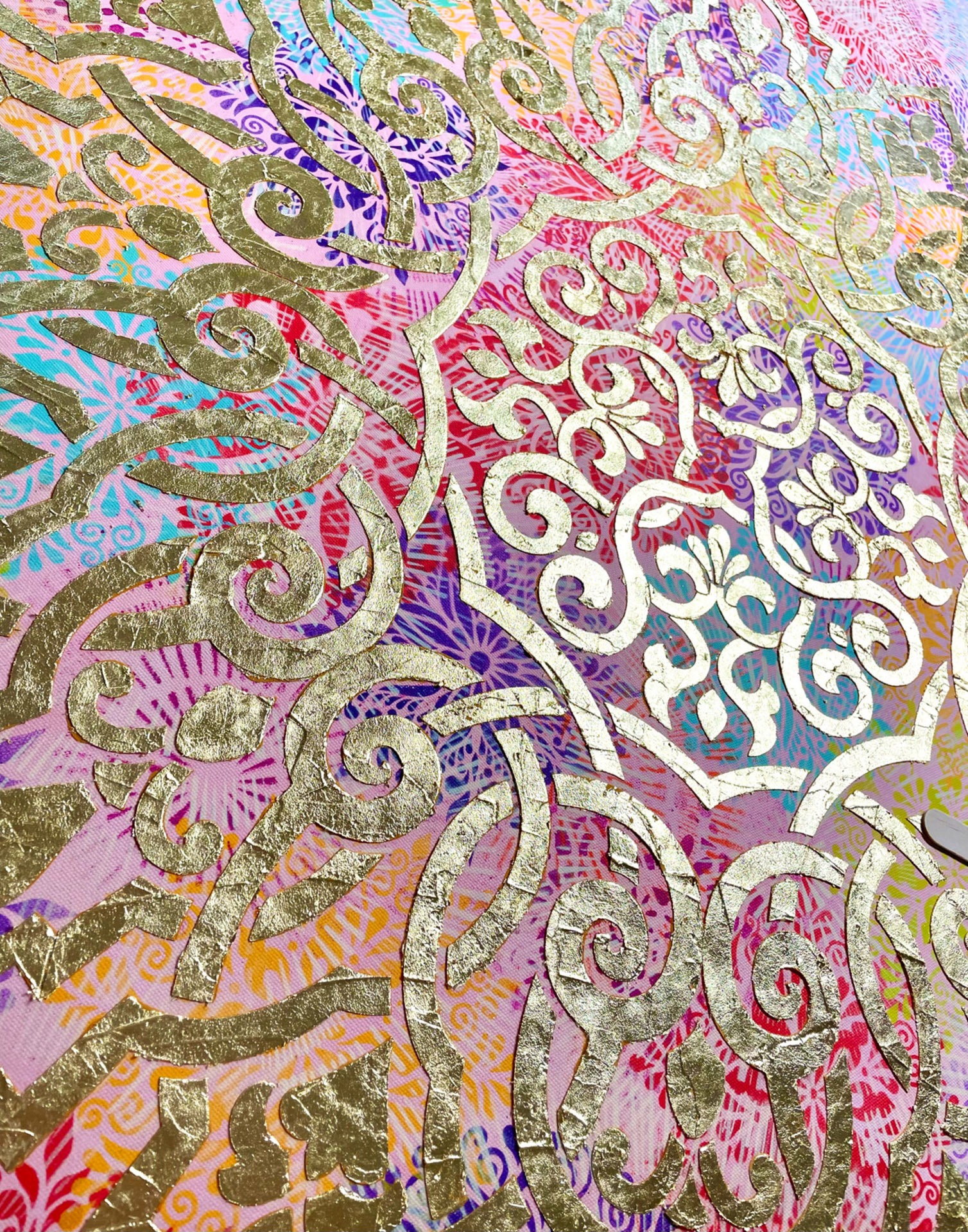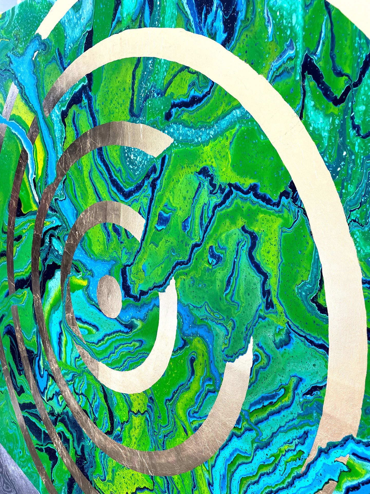 … Die meisten meiner Kompositionen sind geprägt von einem immer wiederkehrenden Merkmal, einem Symbol der Zeitlosigkeit und des Wohlstands – Gold. Ich verarbeite Gold als majestätischen Hintergrund, der die Augen des Betrachters verzaubert, oder in feinen Details, die wie funkelnde Reflexionen im Licht tanzen. Dieses edle Metall, ein Zeichen für Glanz und Beständigkeit, verschmilzt mit den fließenden Farben und den komplexen Strukturen meiner Werke.