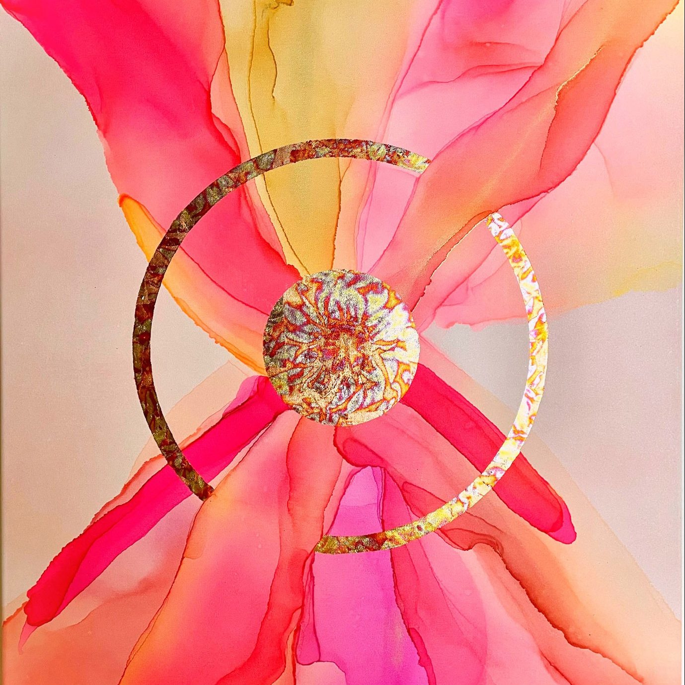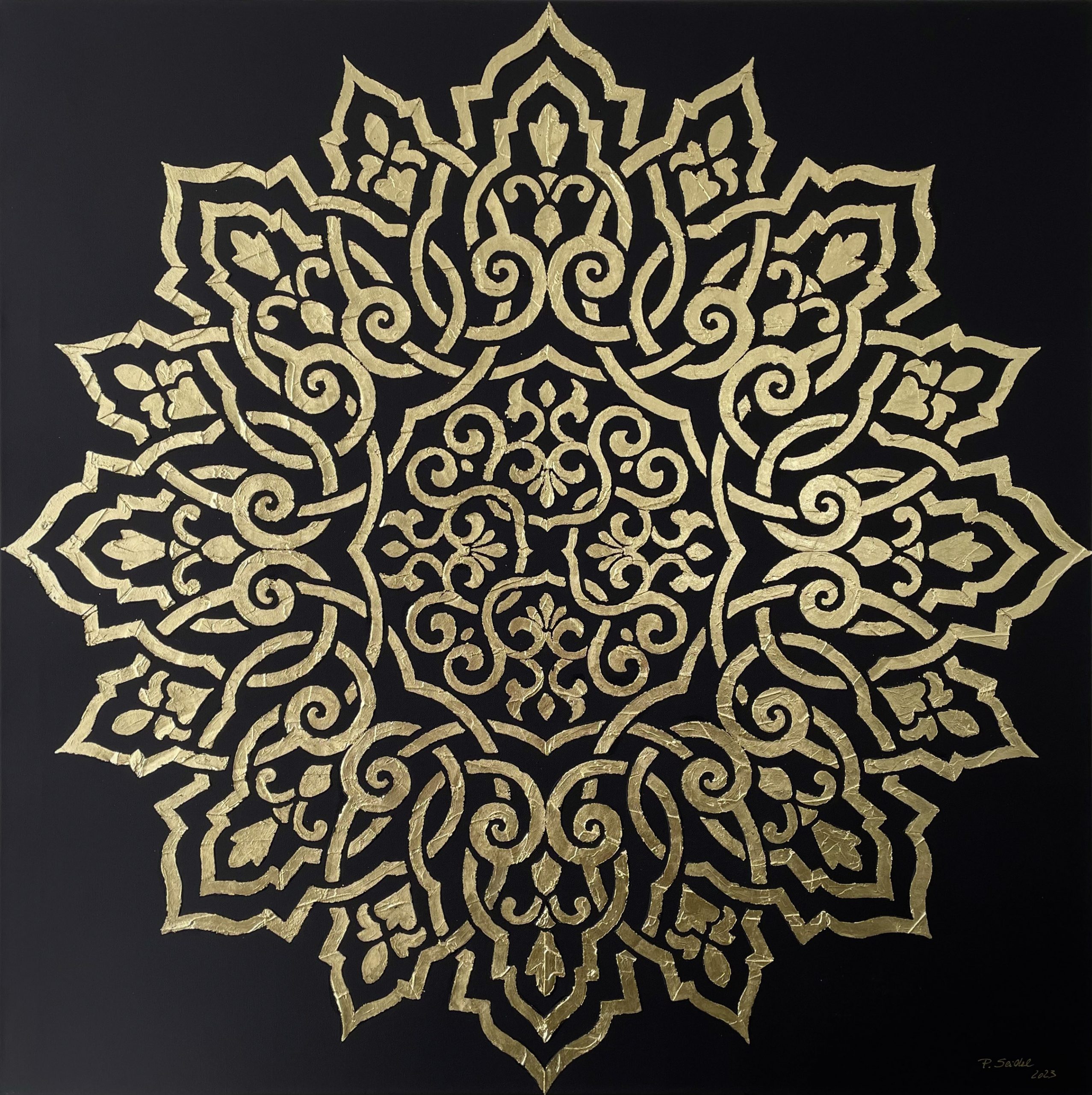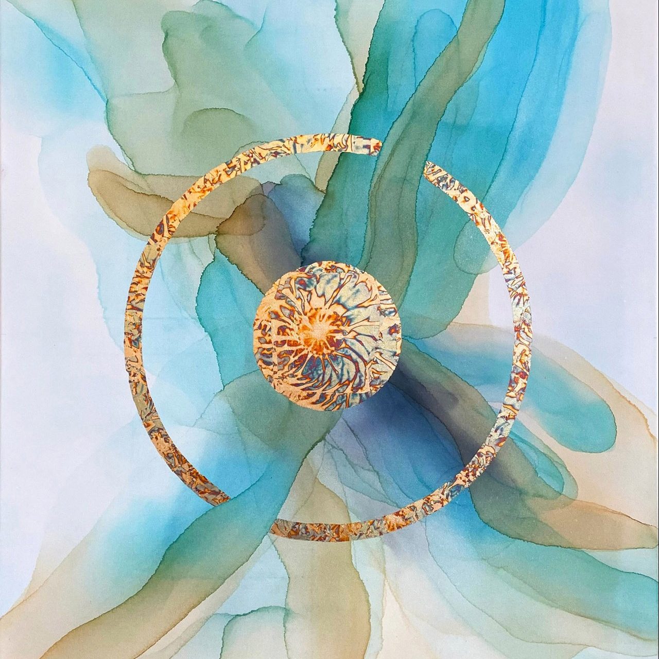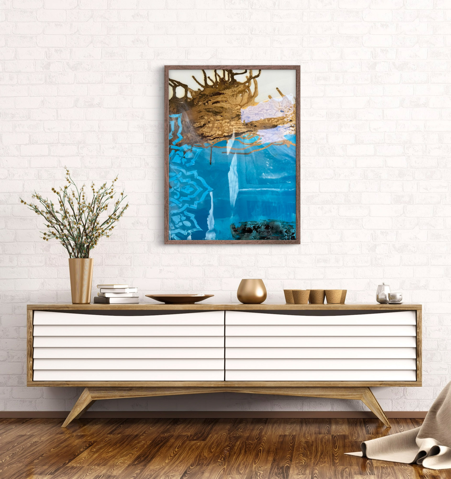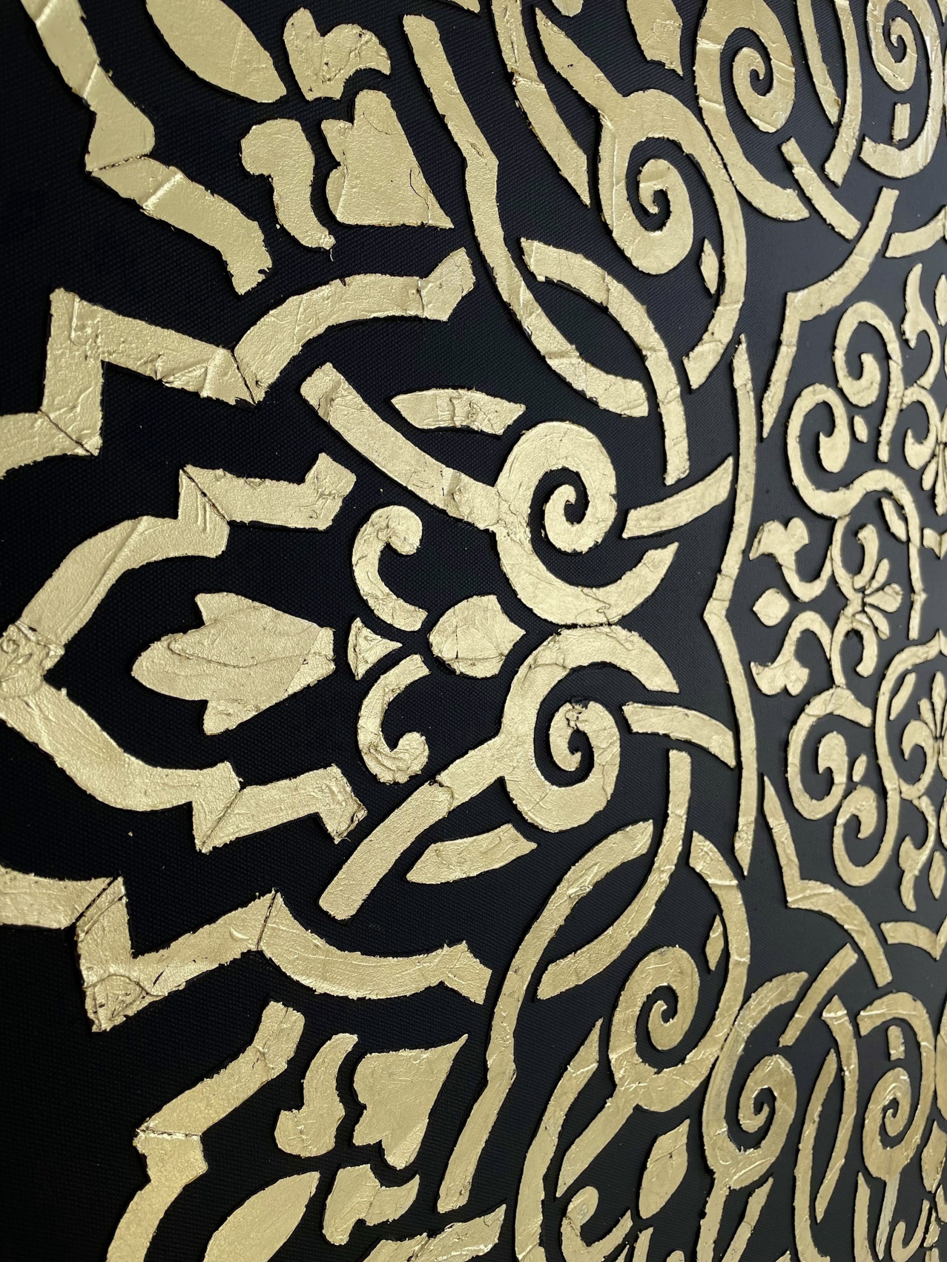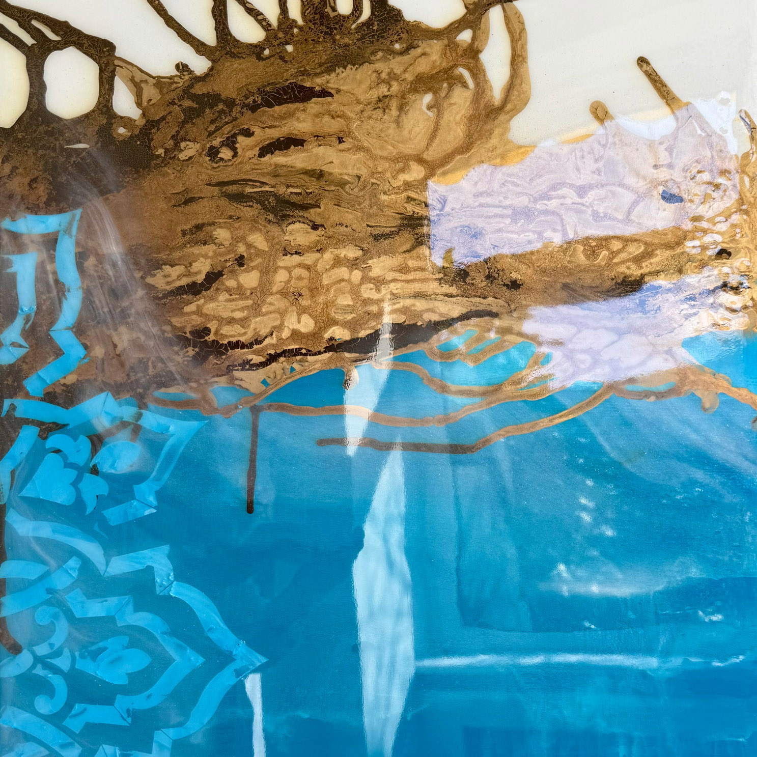 … Die meisten meiner Kompositionen sind geprägt von einem immer wiederkehrenden Merkmal, einem Symbol der Zeitlosigkeit und des Wohlstands – Gold. Ich verarbeite Gold als majestätischen Hintergrund, der die Augen des Betrachters verzaubert, oder in feinen Details, die wie funkelnde Reflexionen im Licht tanzen. Dieses edle Metall, ein Zeichen für Glanz und Beständigkeit, verschmilzt mit den fließenden Farben und den komplexen Strukturen meiner Werke.