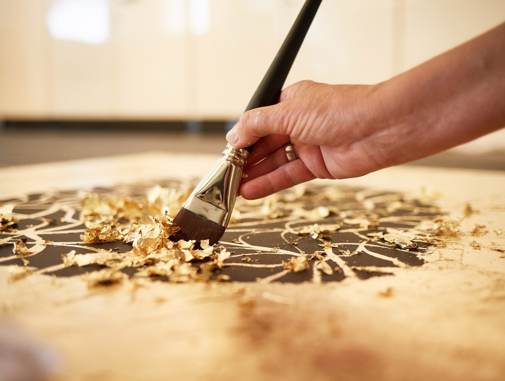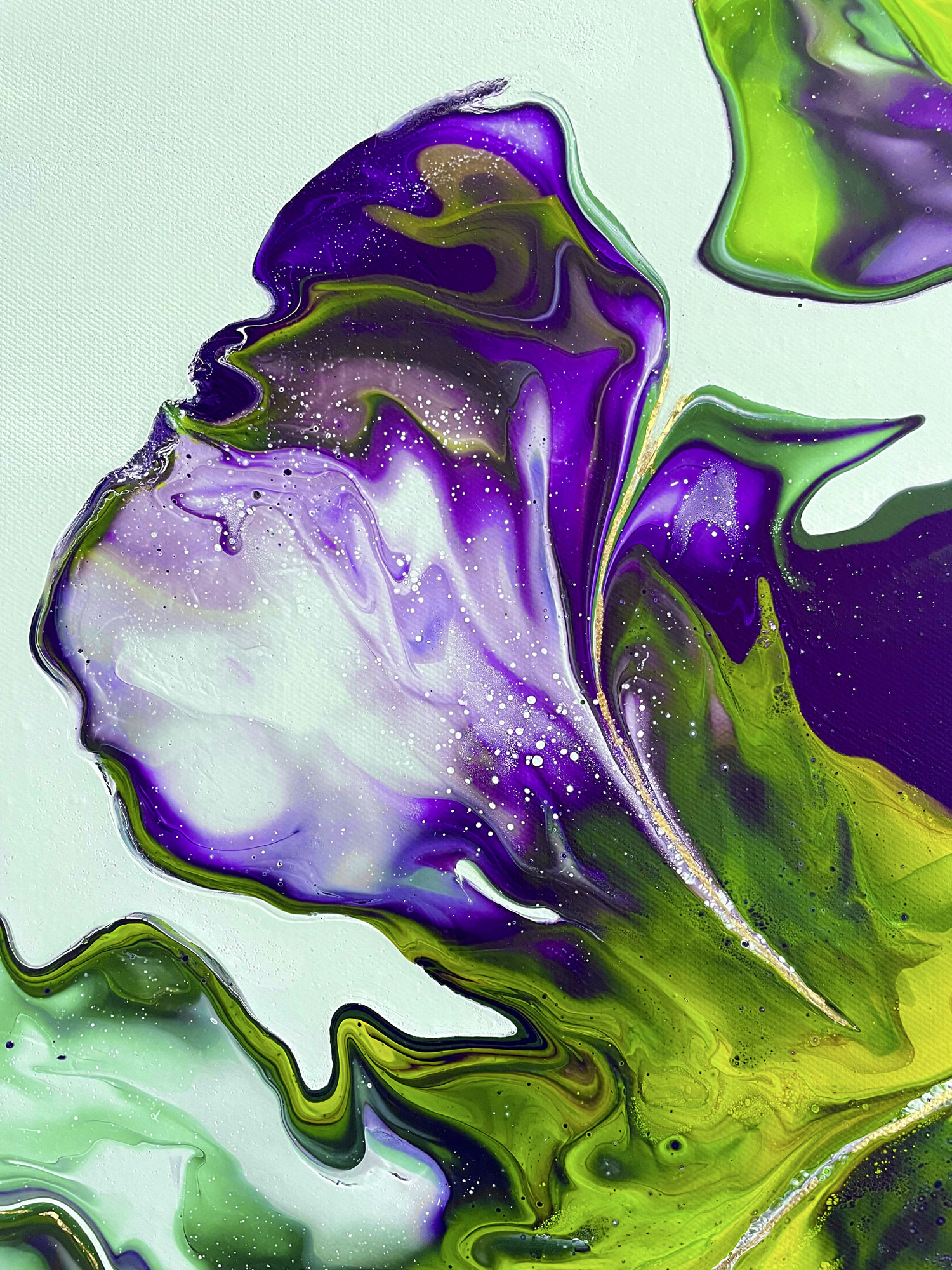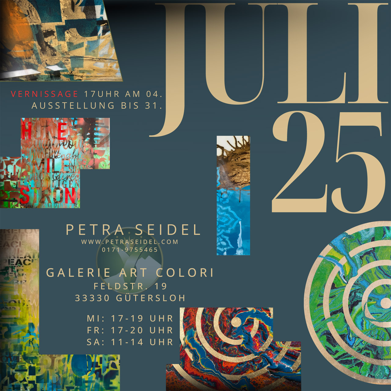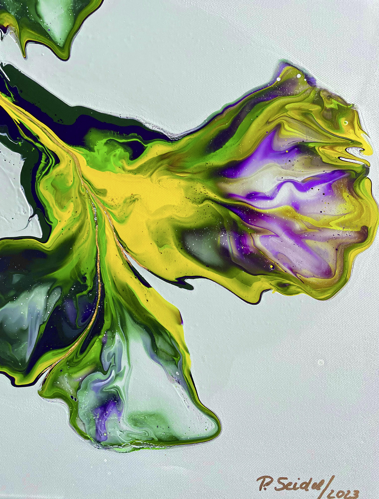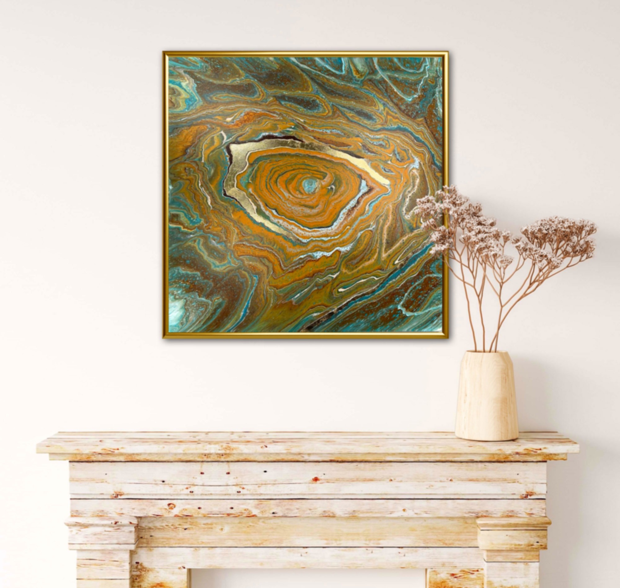 … Die meisten meiner Kompositionen sind geprägt von einem immer wiederkehrenden Merkmal, einem Symbol der Zeitlosigkeit und des Wohlstands – Gold. Ich verarbeite Gold als majestätischen Hintergrund, der die Augen des Betrachters verzaubert, oder in feinen Details, die wie funkelnde Reflexionen im Licht tanzen. Dieses edle Metall, ein Zeichen für Glanz und Beständigkeit, verschmilzt mit den fließenden Farben und den komplexen Strukturen meiner Werke.
