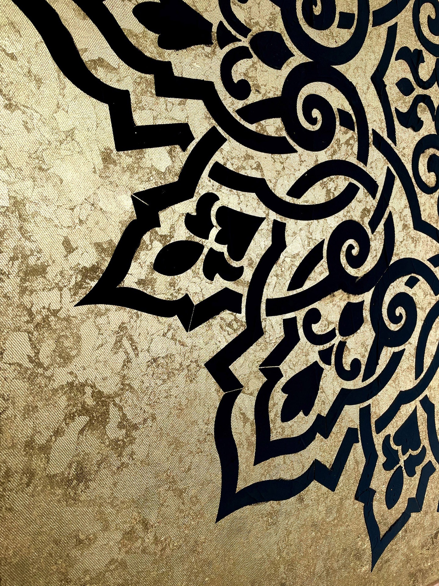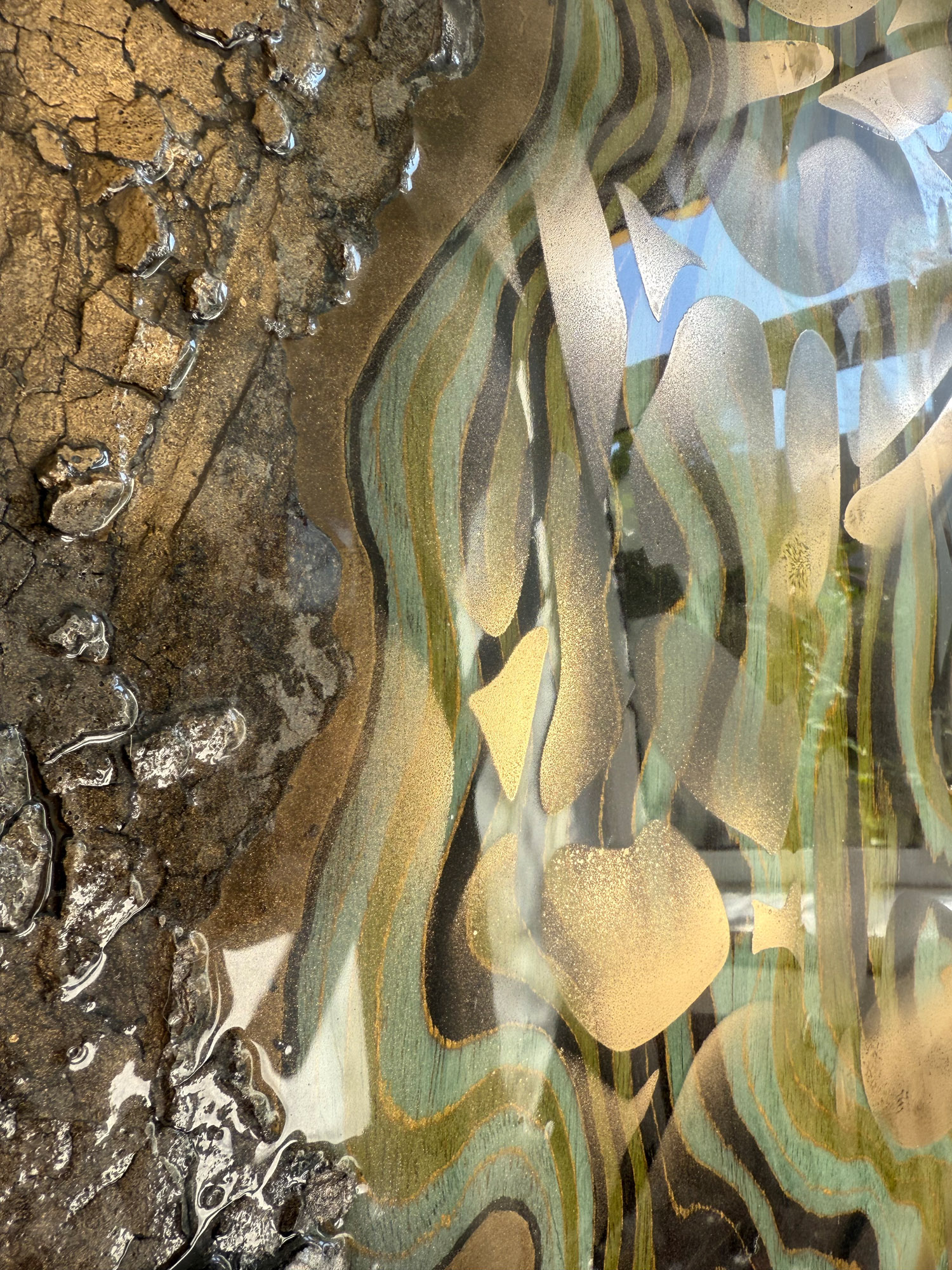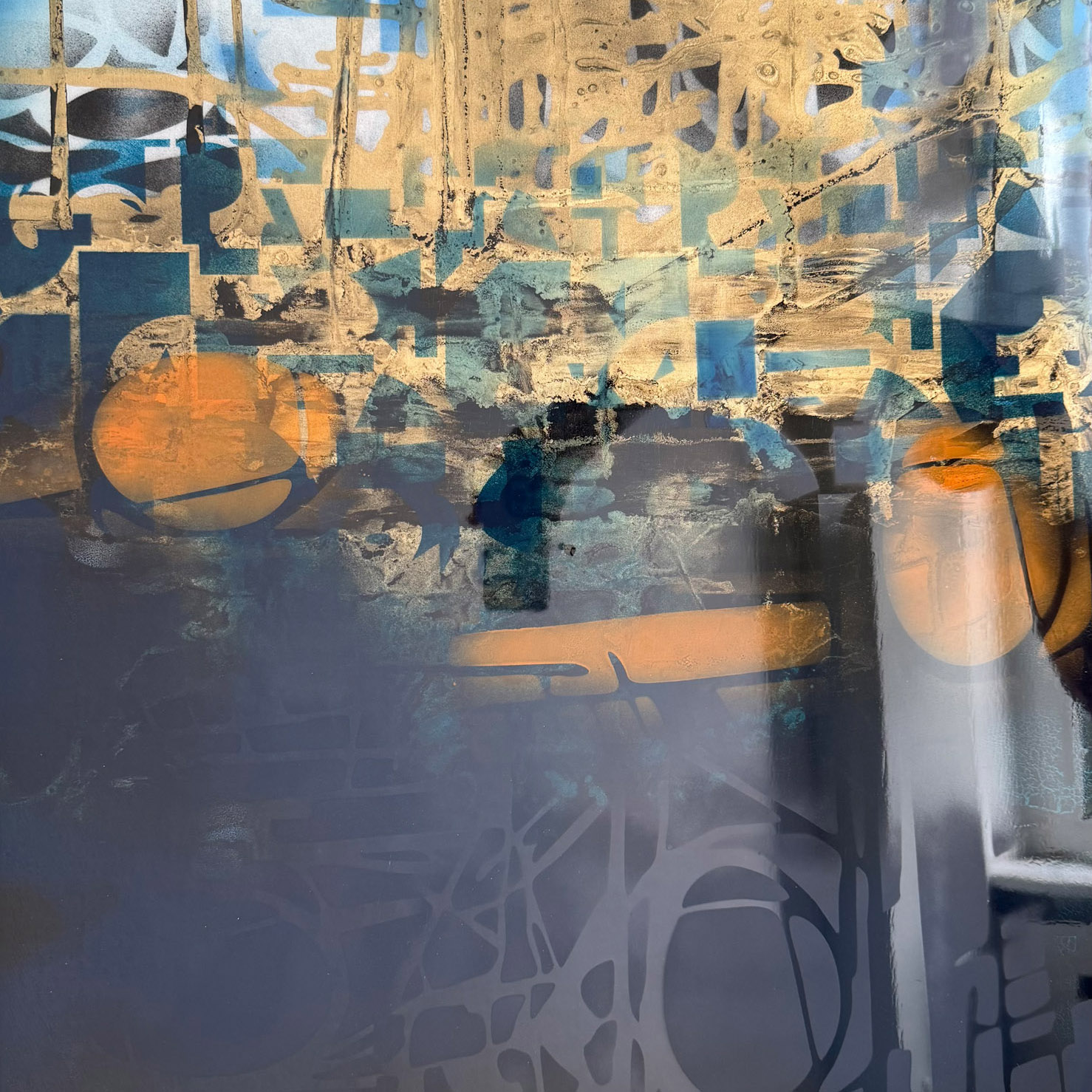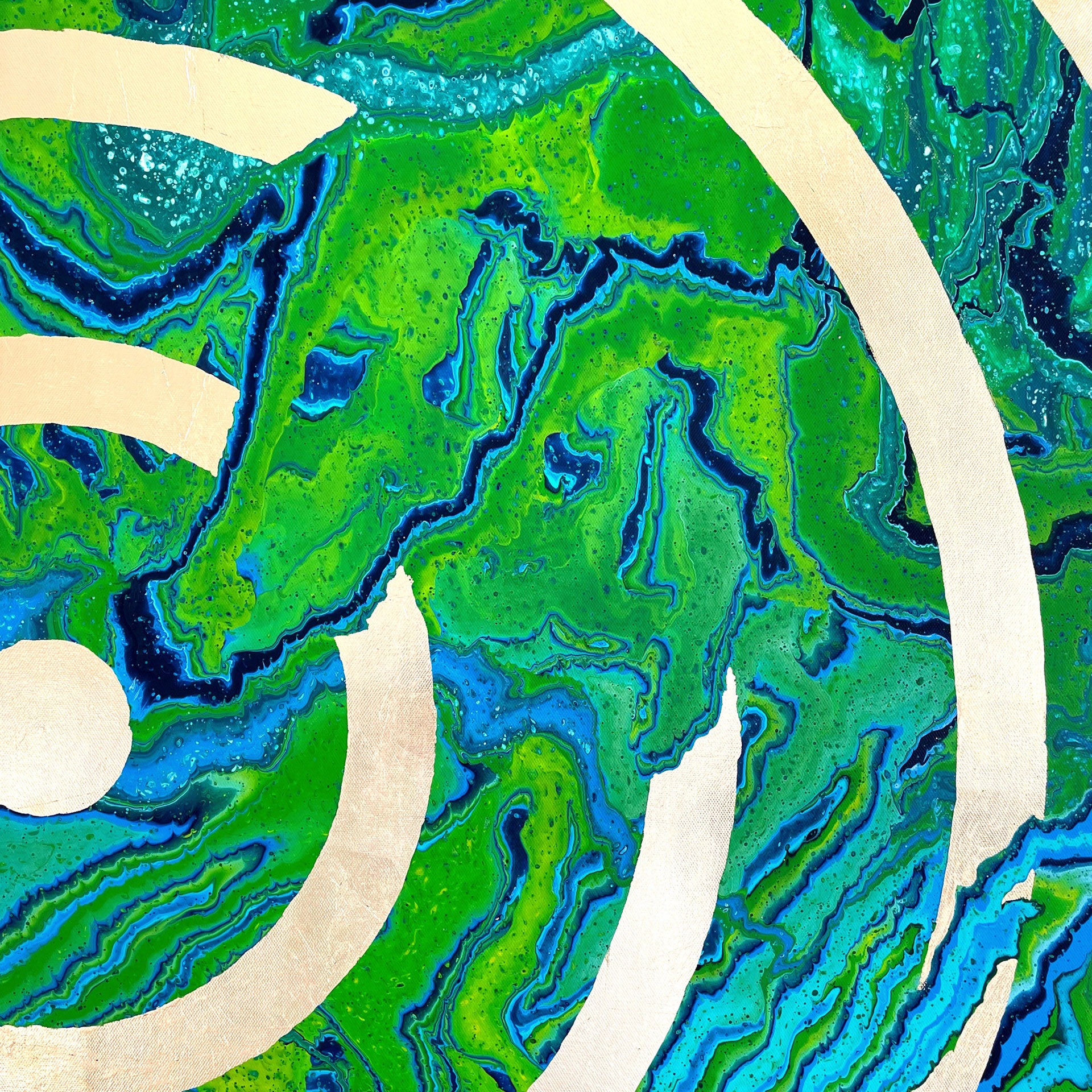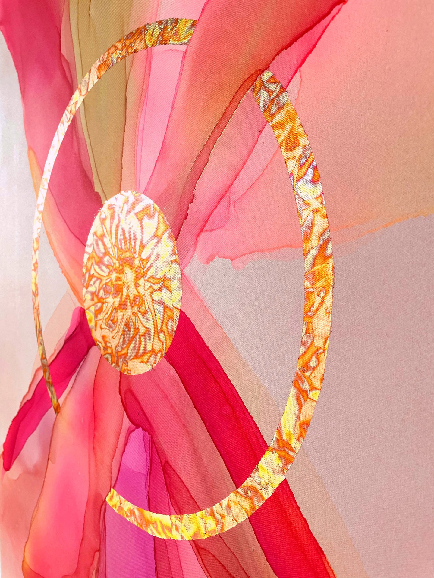 … Die meisten meiner Kompositionen sind geprägt von einem immer wiederkehrenden Merkmal, einem Symbol der Zeitlosigkeit und des Wohlstands – Gold. Ich verarbeite Gold als majestätischen Hintergrund, der die Augen des Betrachters verzaubert, oder in feinen Details, die wie funkelnde Reflexionen im Licht tanzen. Dieses edle Metall, ein Zeichen für Glanz und Beständigkeit, verschmilzt mit den fließenden Farben und den komplexen Strukturen meiner Werke.