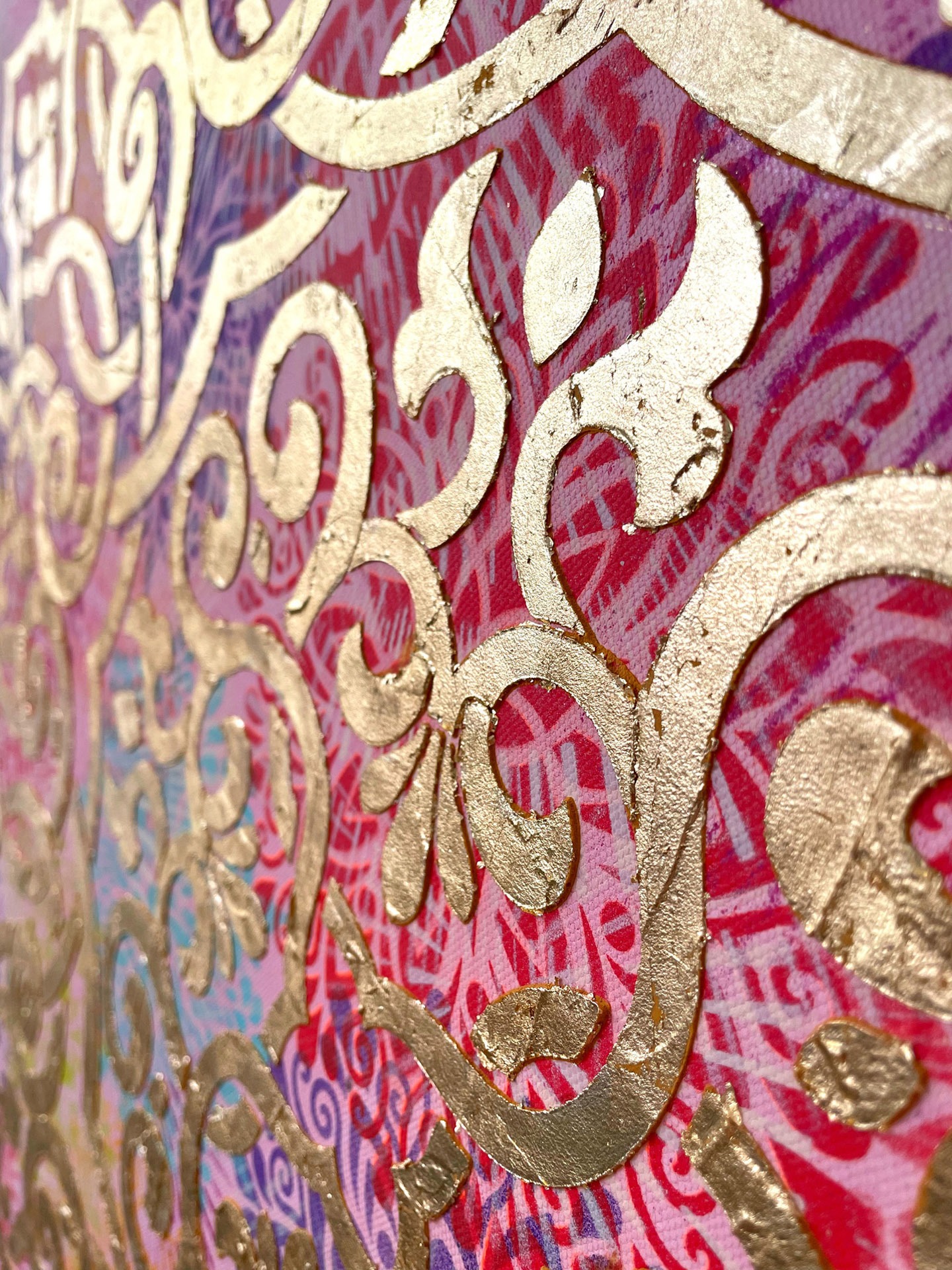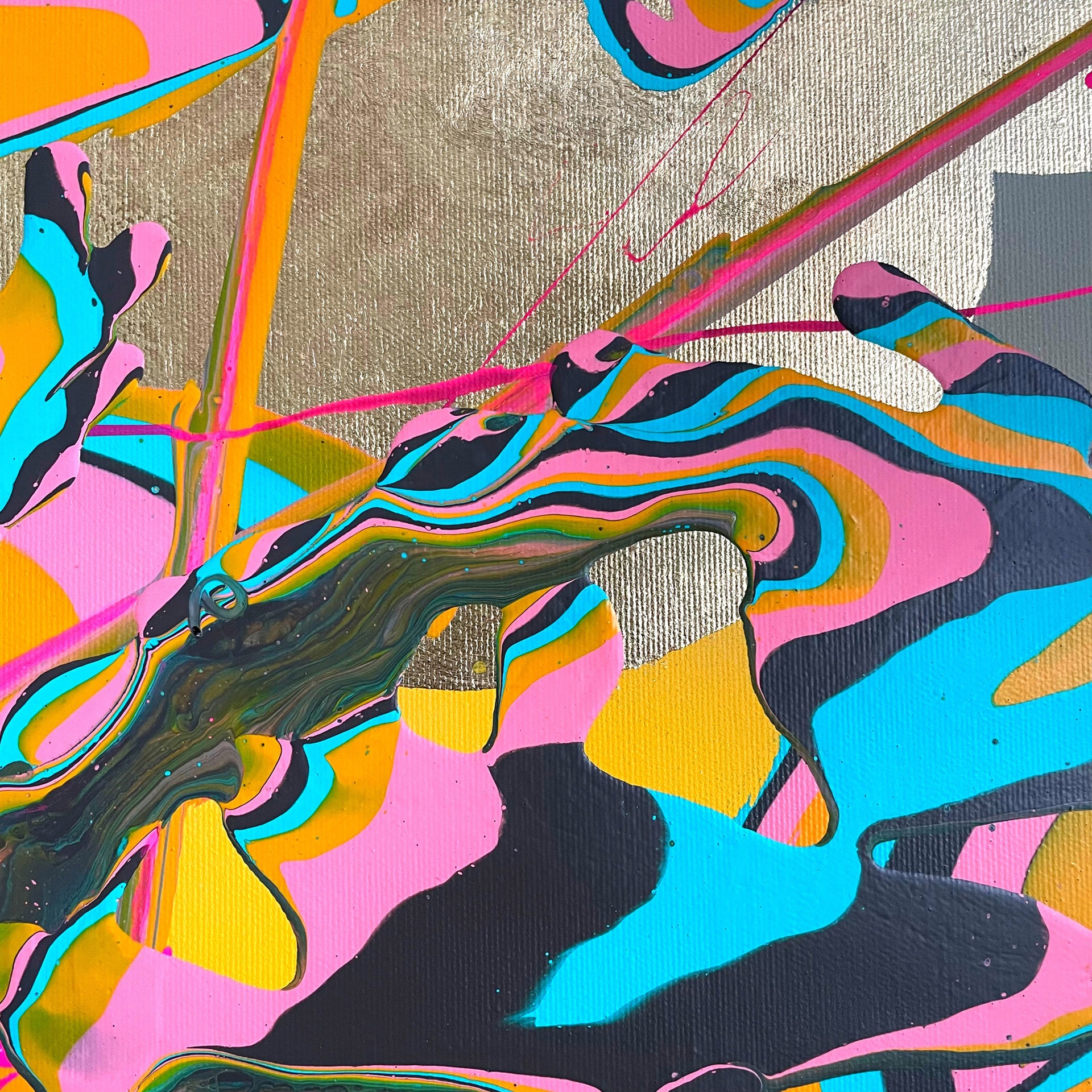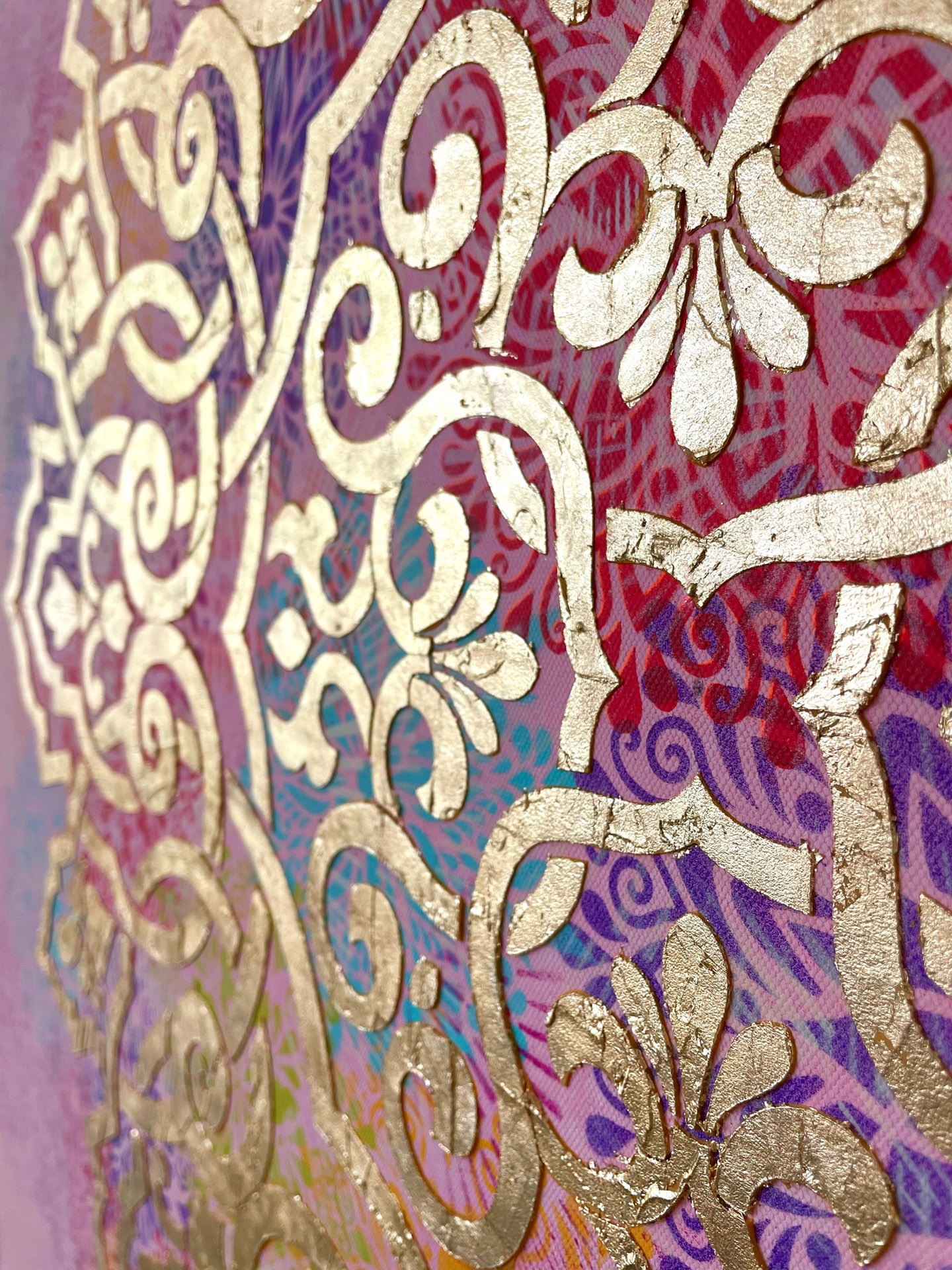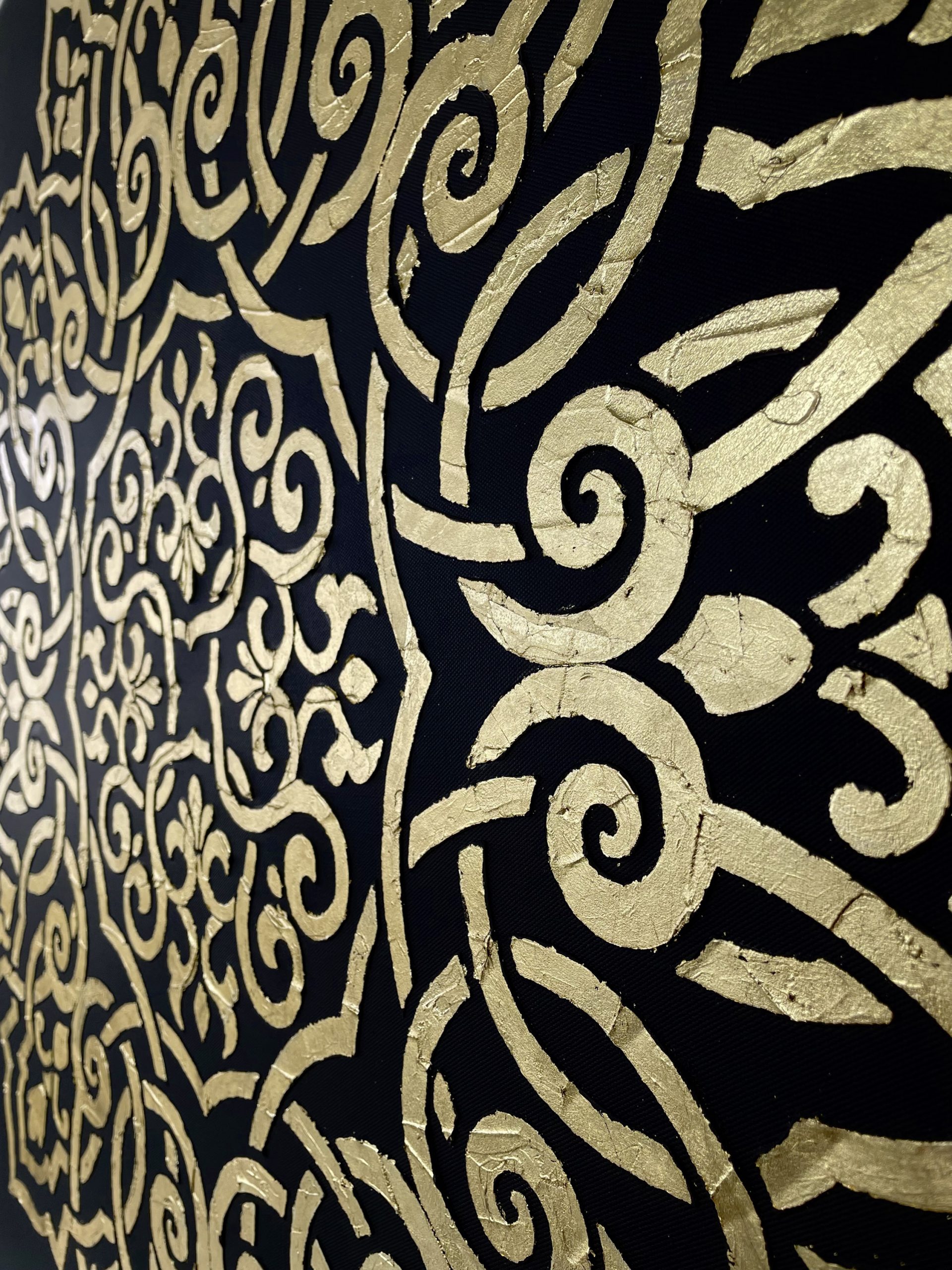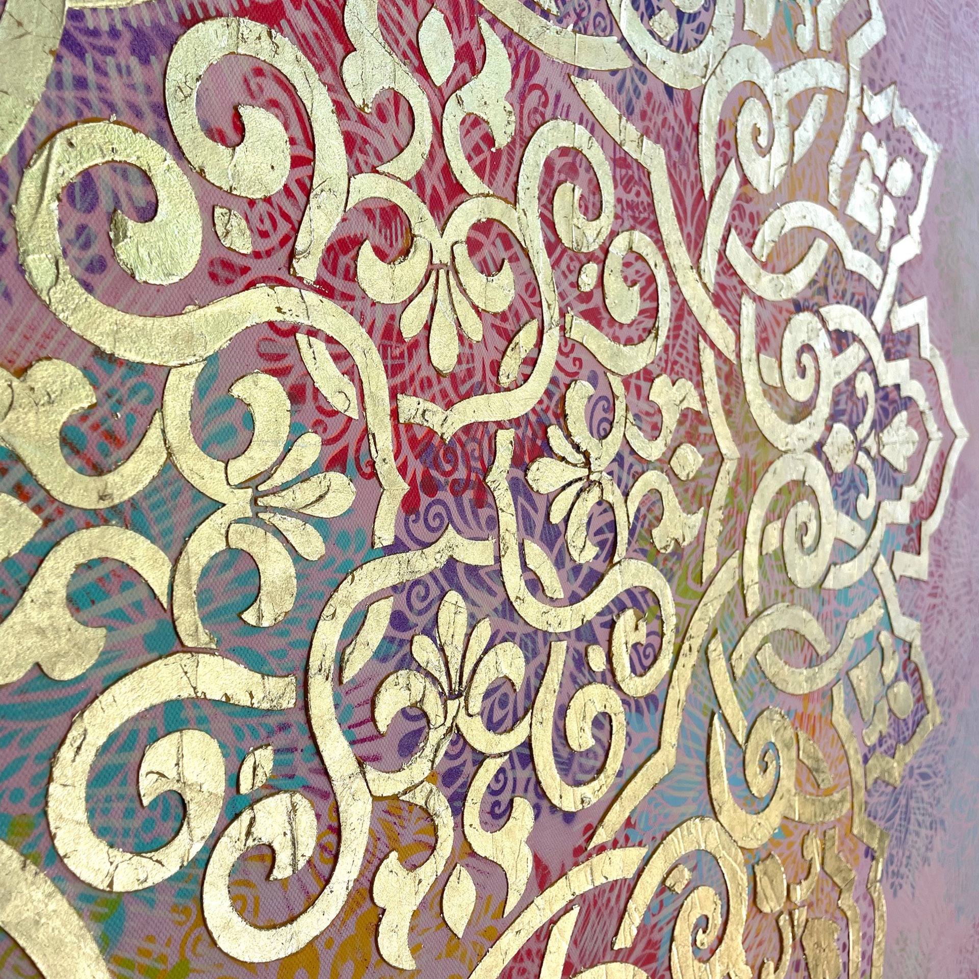… Die meisten meiner Kompositionen sind geprägt von einem immer wiederkehrenden Merkmal, einem Symbol der Zeitlosigkeit und des Wohlstands – Gold. Ich verarbeite Gold als majestätischen Hintergrund, der die Augen des Betrachters verzaubert, oder in feinen Details, die wie funkelnde Reflexionen im Licht tanzen. Dieses edle Metall, ein Zeichen für Glanz und Beständigkeit, verschmilzt mit den fließenden Farben und den komplexen Strukturen meiner Werke.