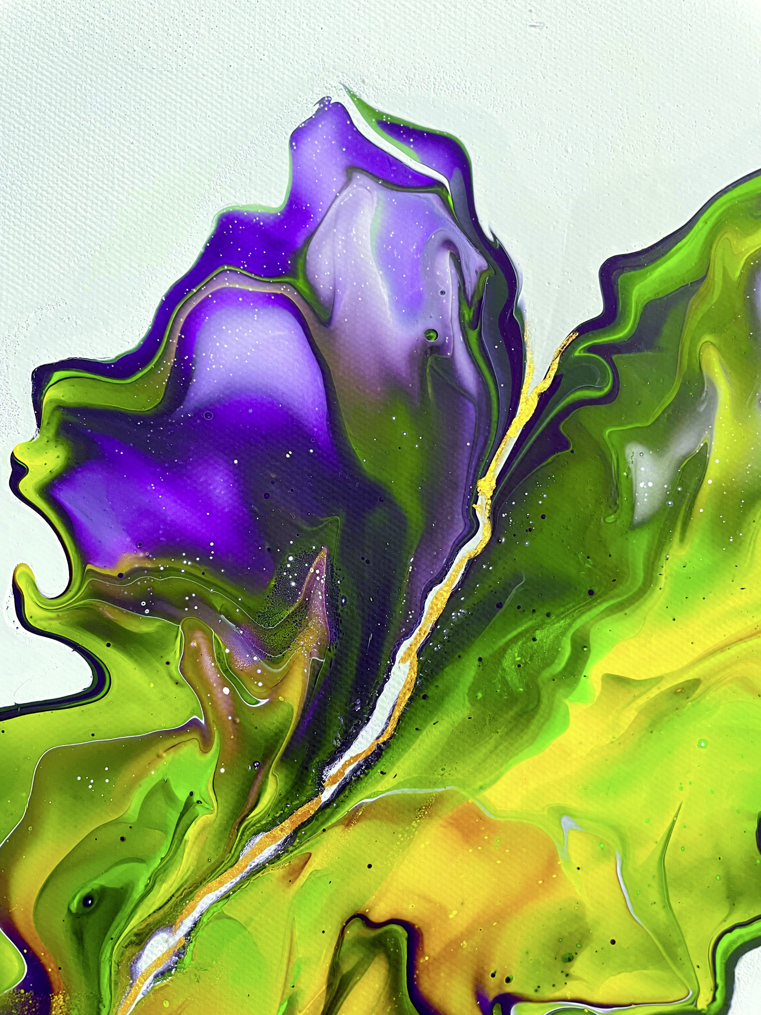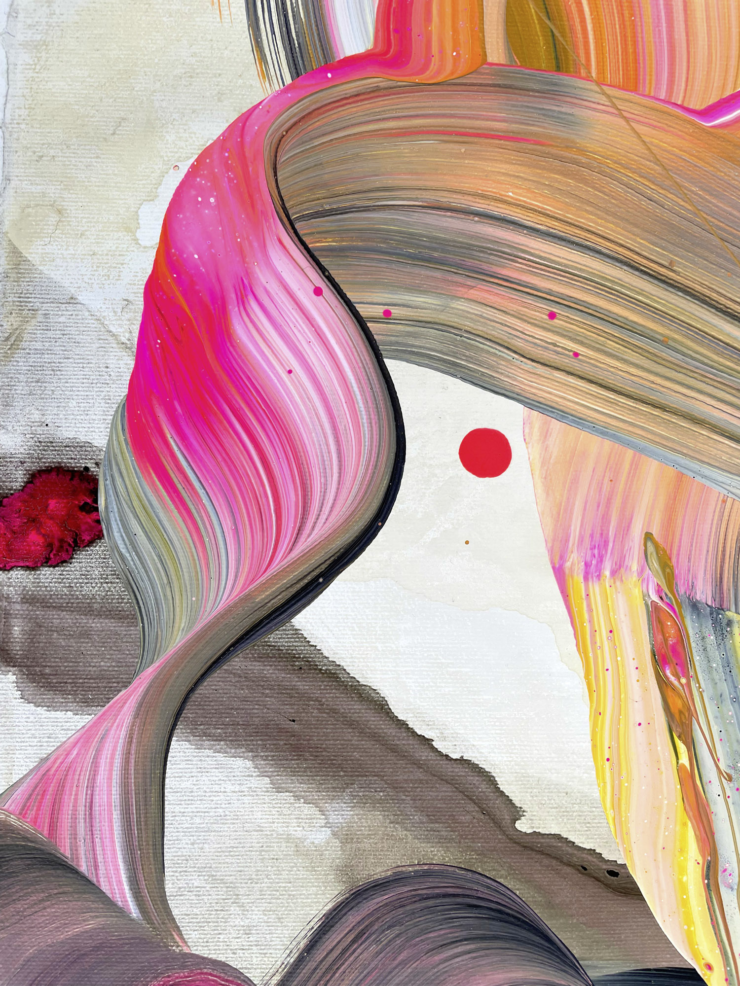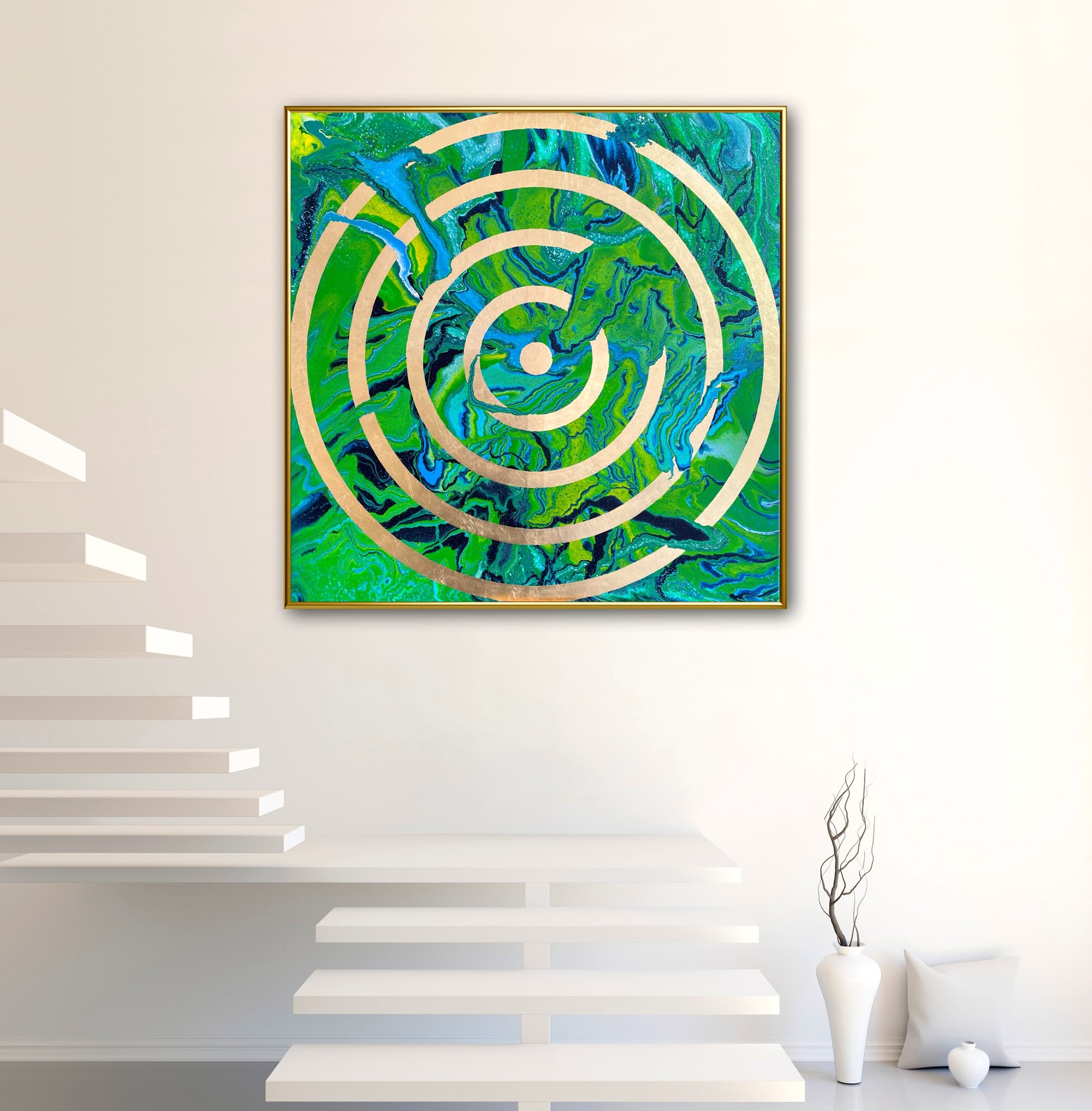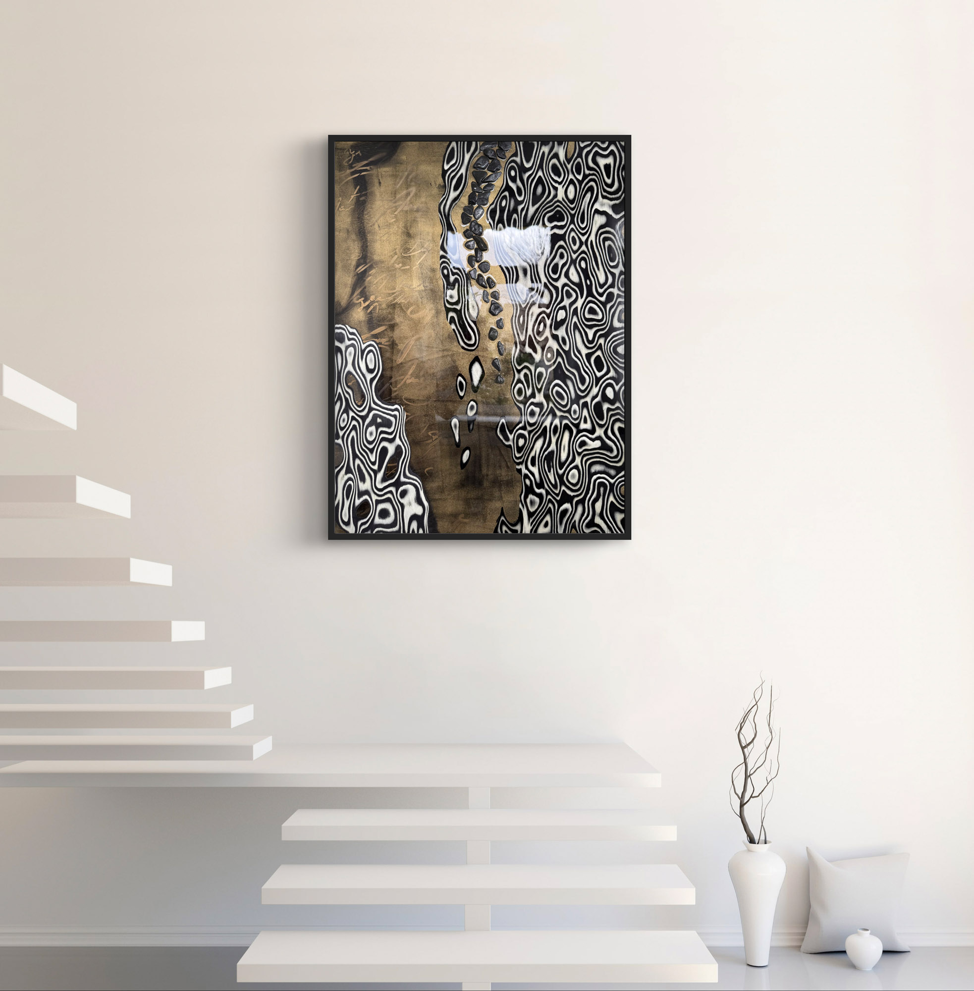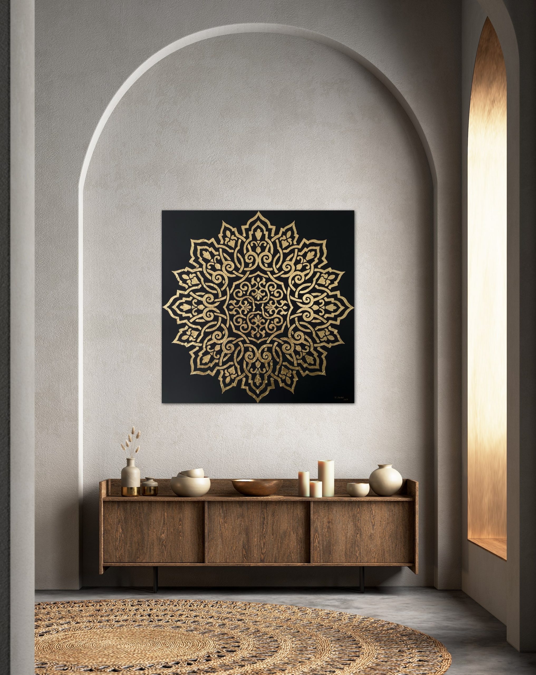 … Die meisten meiner Kompositionen sind geprägt von einem immer wiederkehrenden Merkmal, einem Symbol der Zeitlosigkeit und des Wohlstands – Gold. Ich verarbeite Gold als majestätischen Hintergrund, der die Augen des Betrachters verzaubert, oder in feinen Details, die wie funkelnde Reflexionen im Licht tanzen. Dieses edle Metall, ein Zeichen für Glanz und Beständigkeit, verschmilzt mit den fließenden Farben und den komplexen Strukturen meiner Werke.