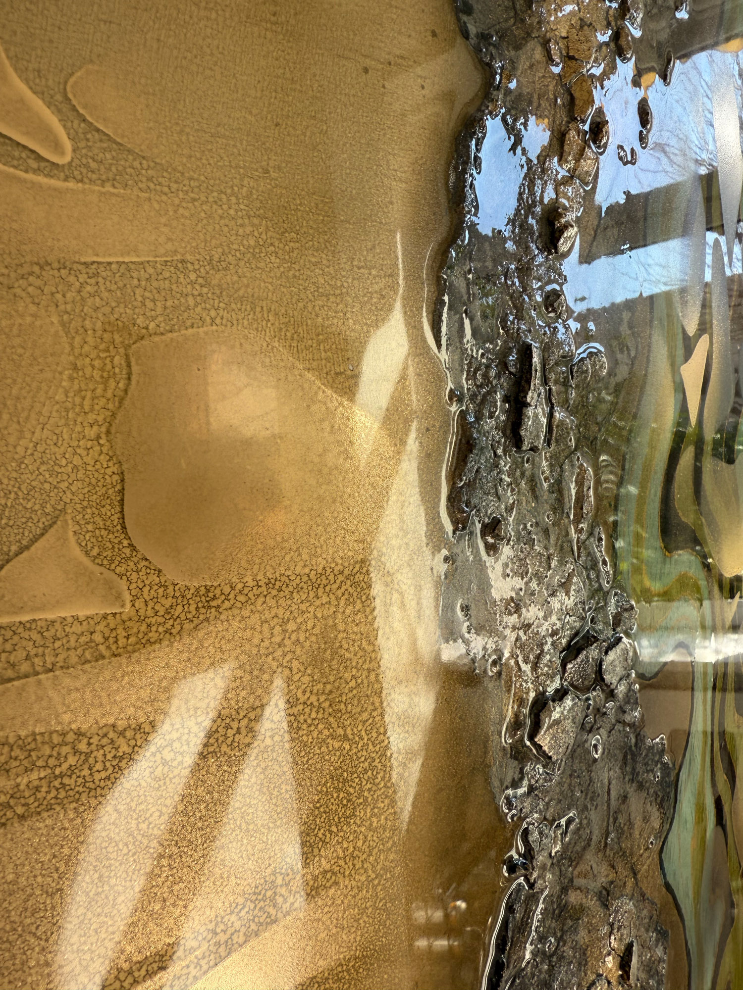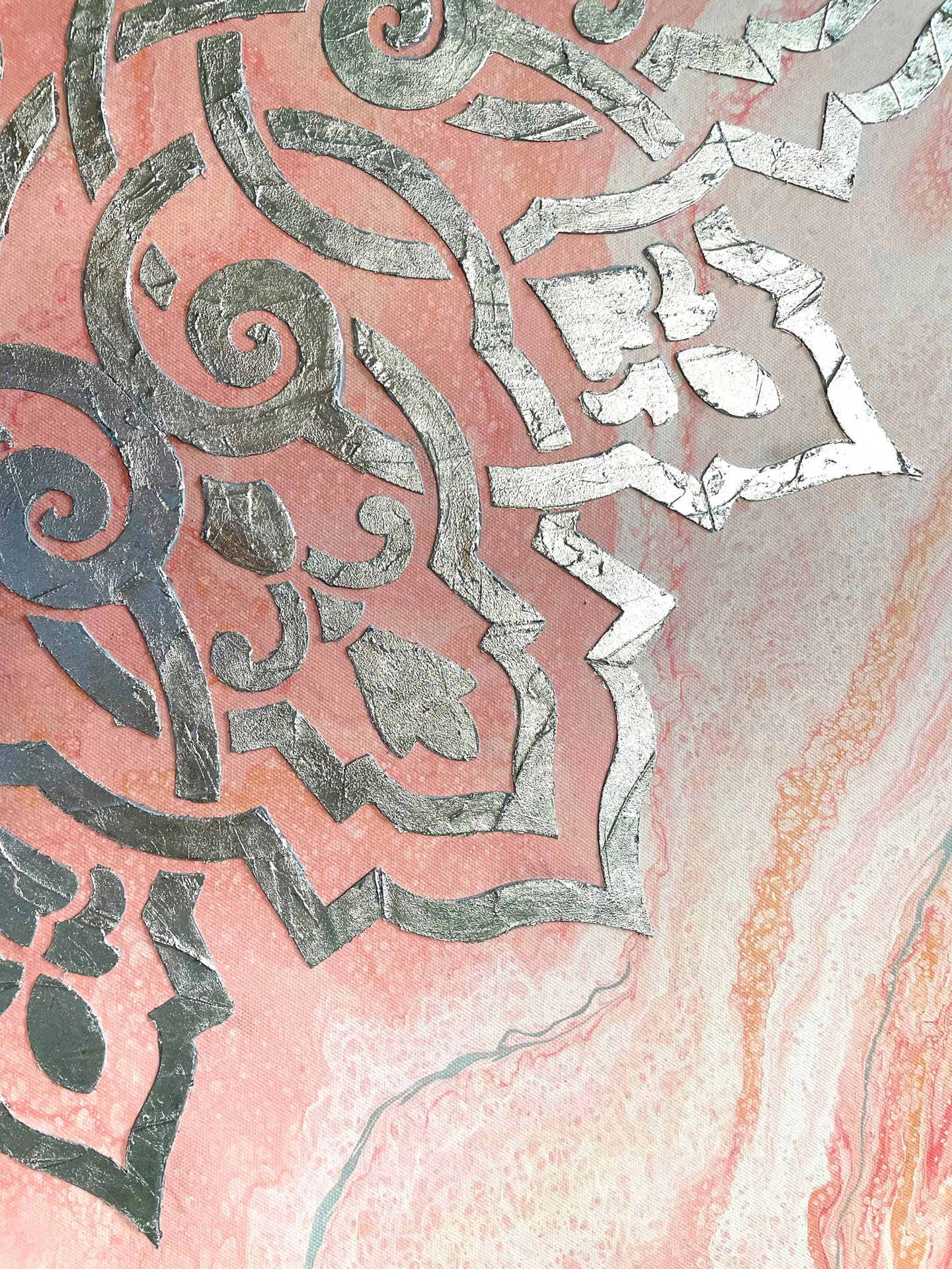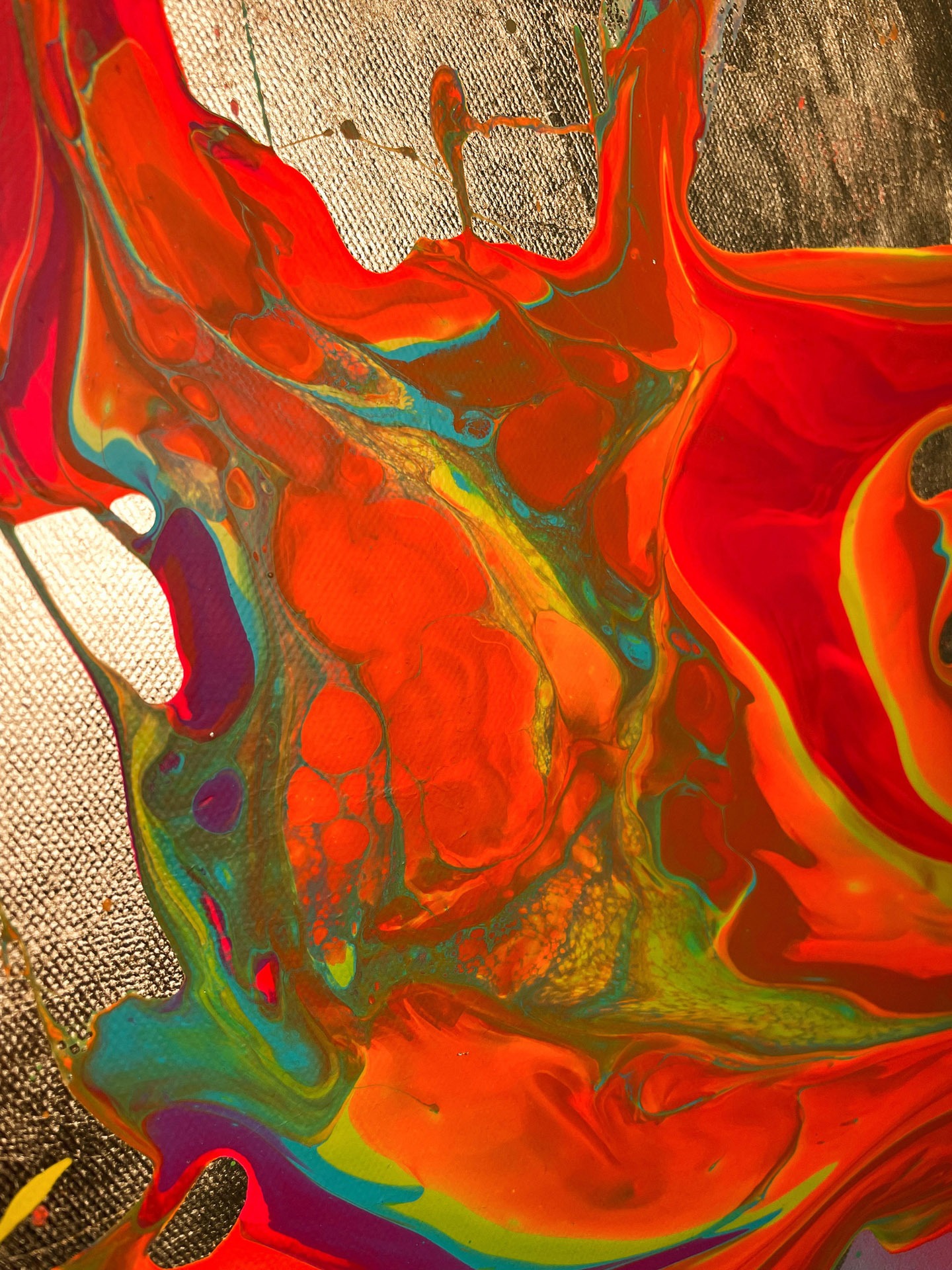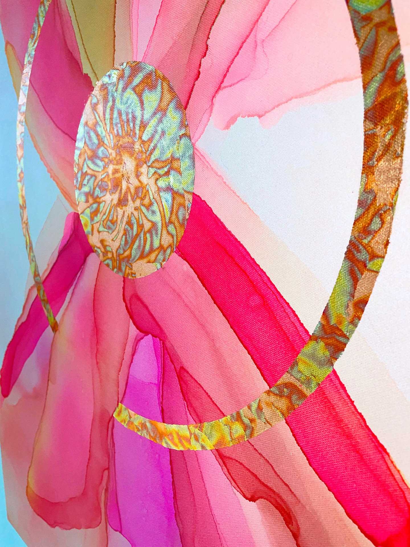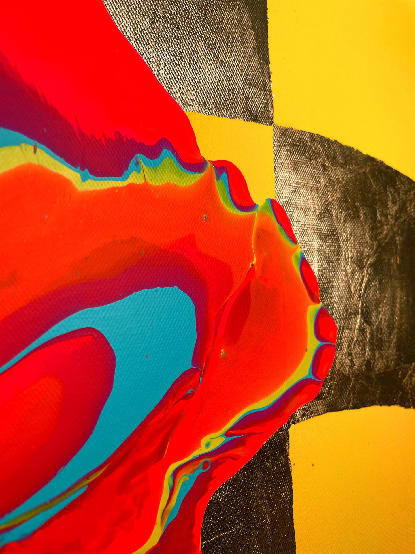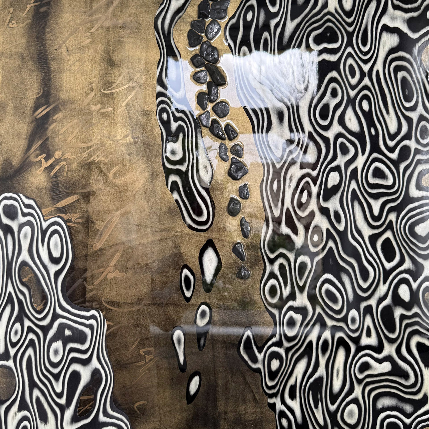 … Die meisten meiner Kompositionen sind geprägt von einem immer wiederkehrenden Merkmal, einem Symbol der Zeitlosigkeit und des Wohlstands – Gold. Ich verarbeite Gold als majestätischen Hintergrund, der die Augen des Betrachters verzaubert, oder in feinen Details, die wie funkelnde Reflexionen im Licht tanzen. Dieses edle Metall, ein Zeichen für Glanz und Beständigkeit, verschmilzt mit den fließenden Farben und den komplexen Strukturen meiner Werke.