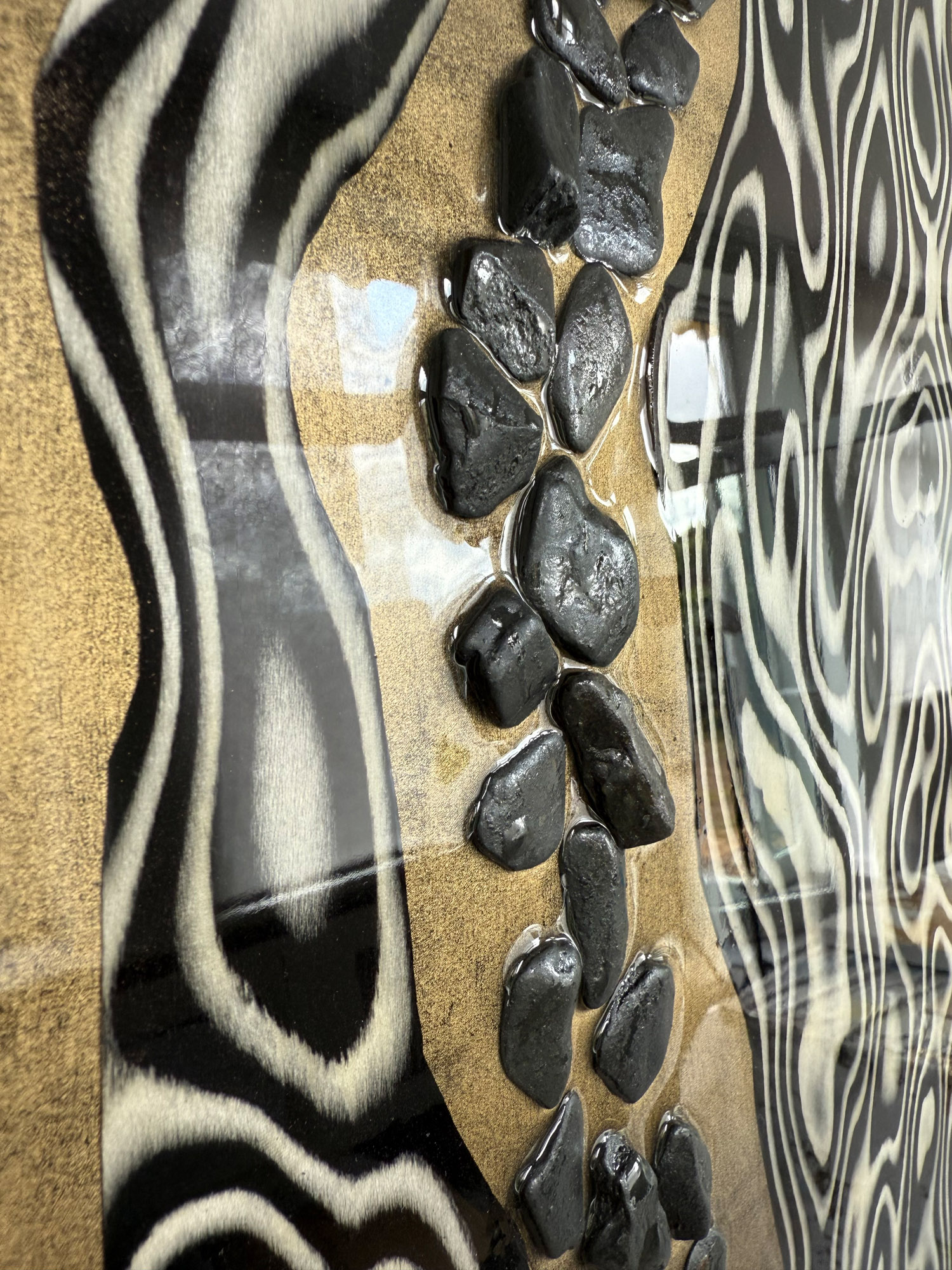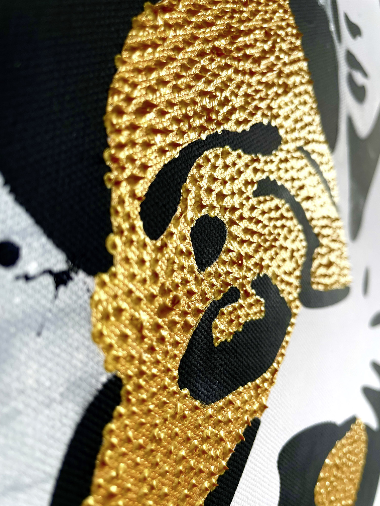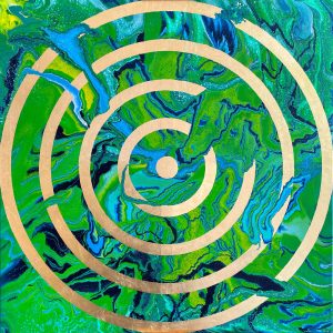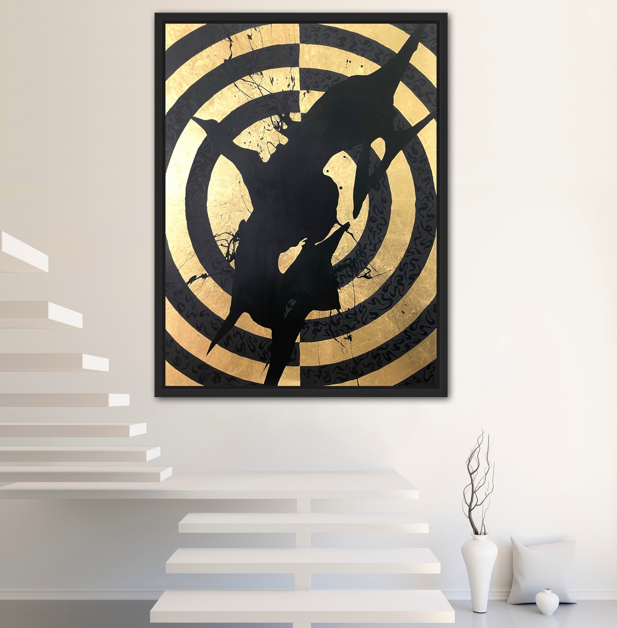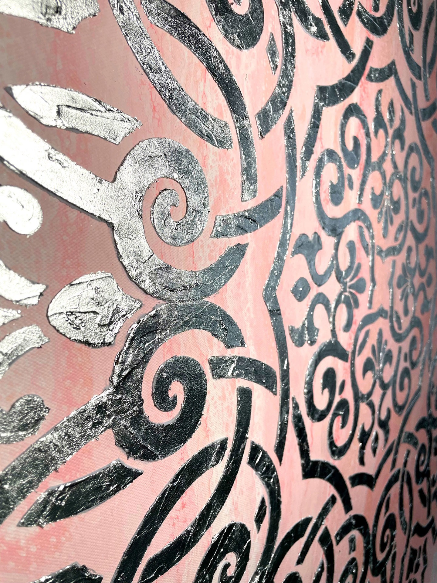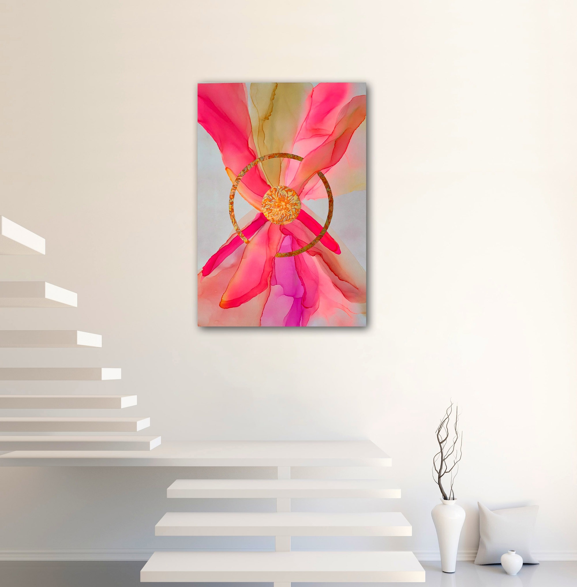 … Die meisten meiner Kompositionen sind geprägt von einem immer wiederkehrenden Merkmal, einem Symbol der Zeitlosigkeit und des Wohlstands – Gold. Ich verarbeite Gold als majestätischen Hintergrund, der die Augen des Betrachters verzaubert, oder in feinen Details, die wie funkelnde Reflexionen im Licht tanzen. Dieses edle Metall, ein Zeichen für Glanz und Beständigkeit, verschmilzt mit den fließenden Farben und den komplexen Strukturen meiner Werke.