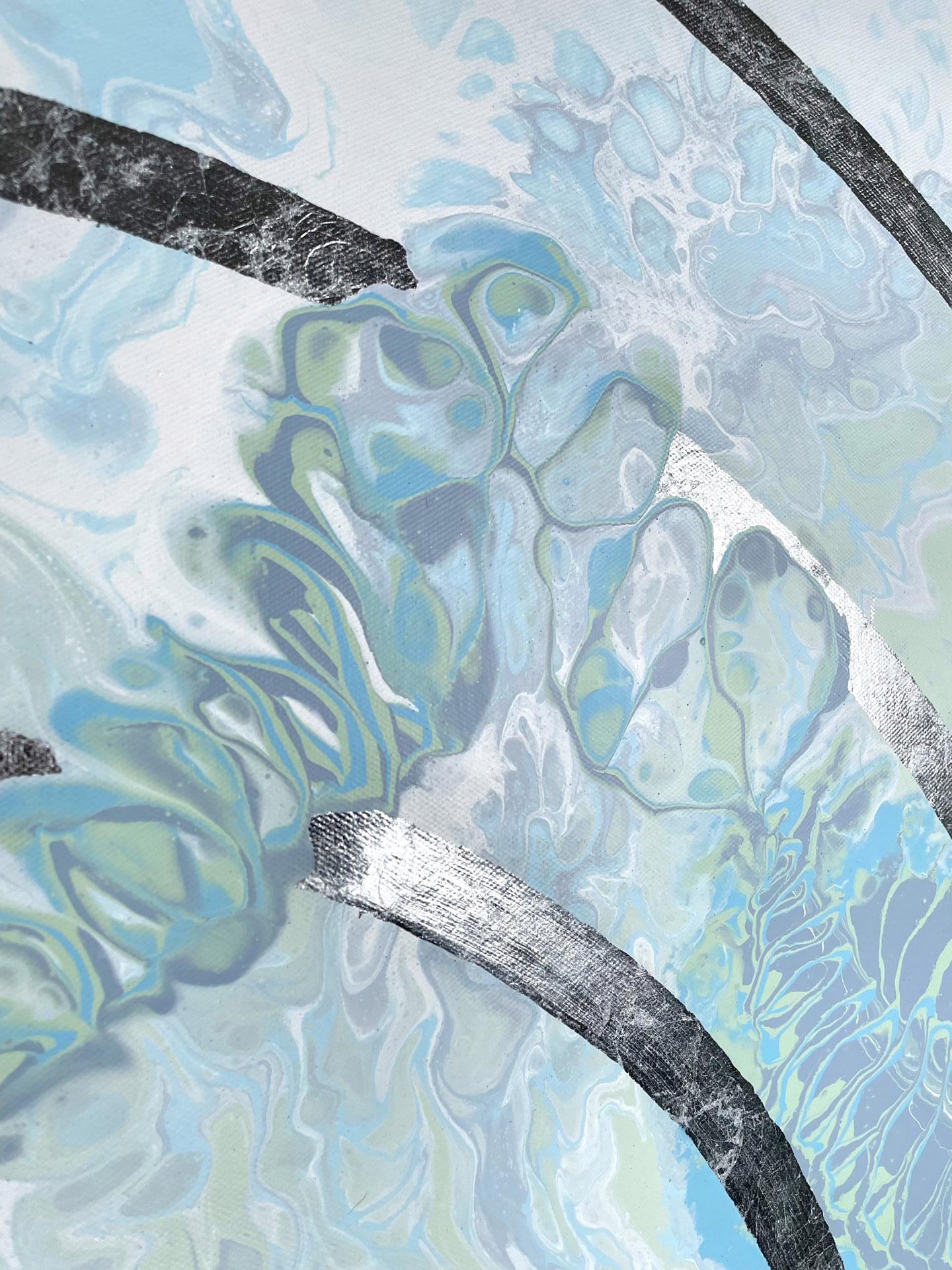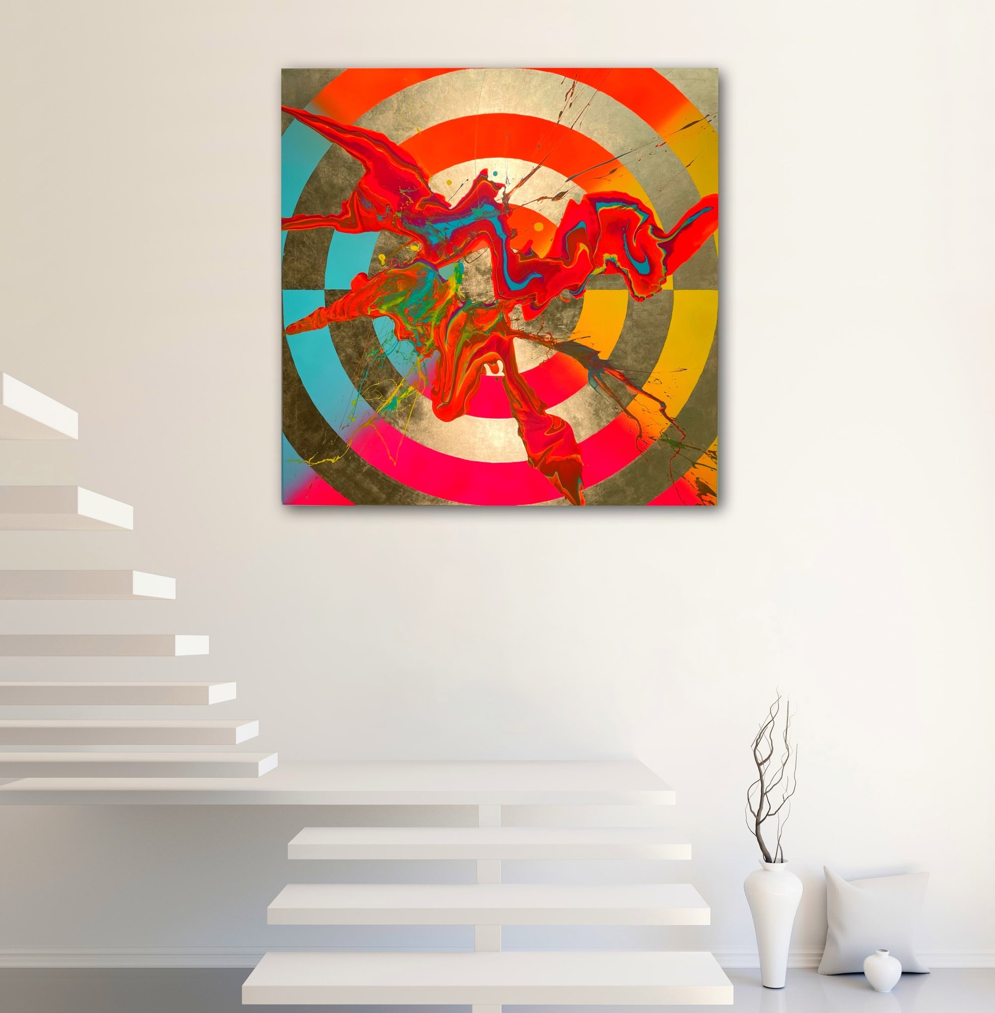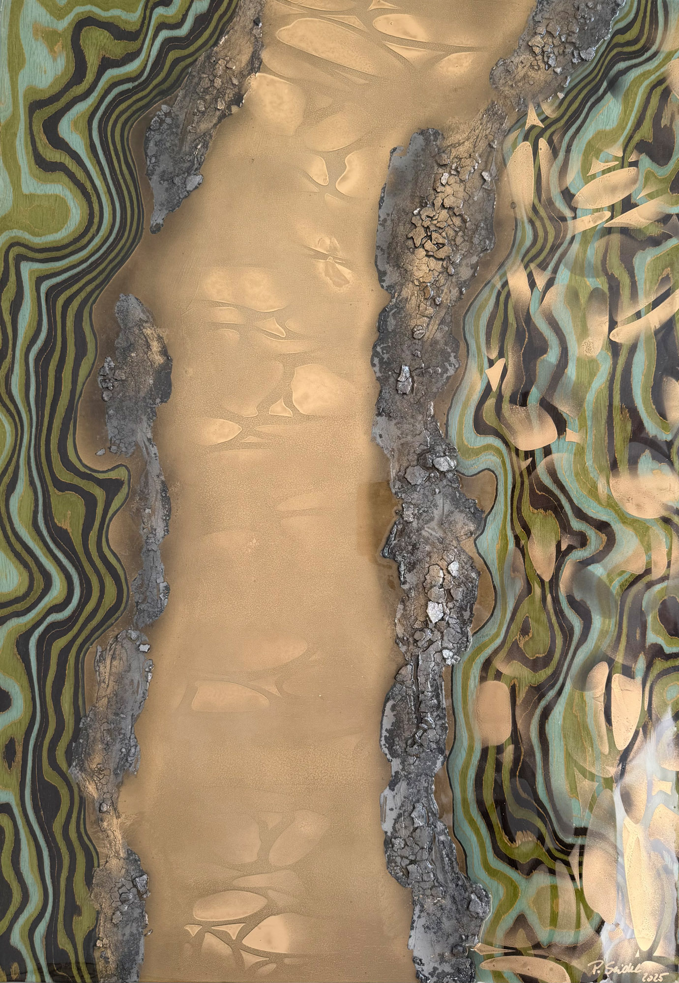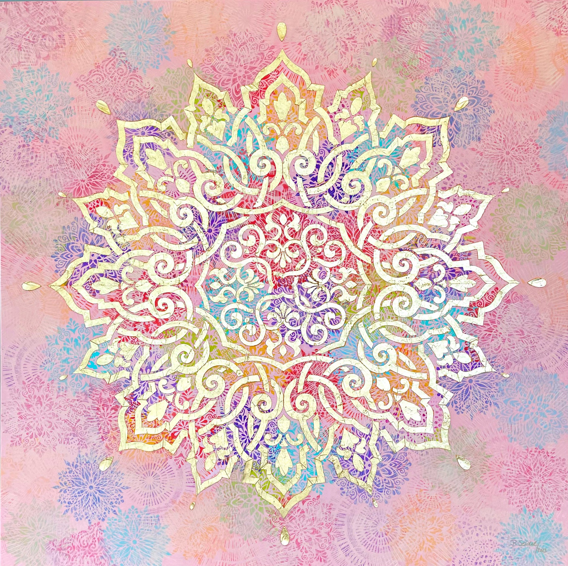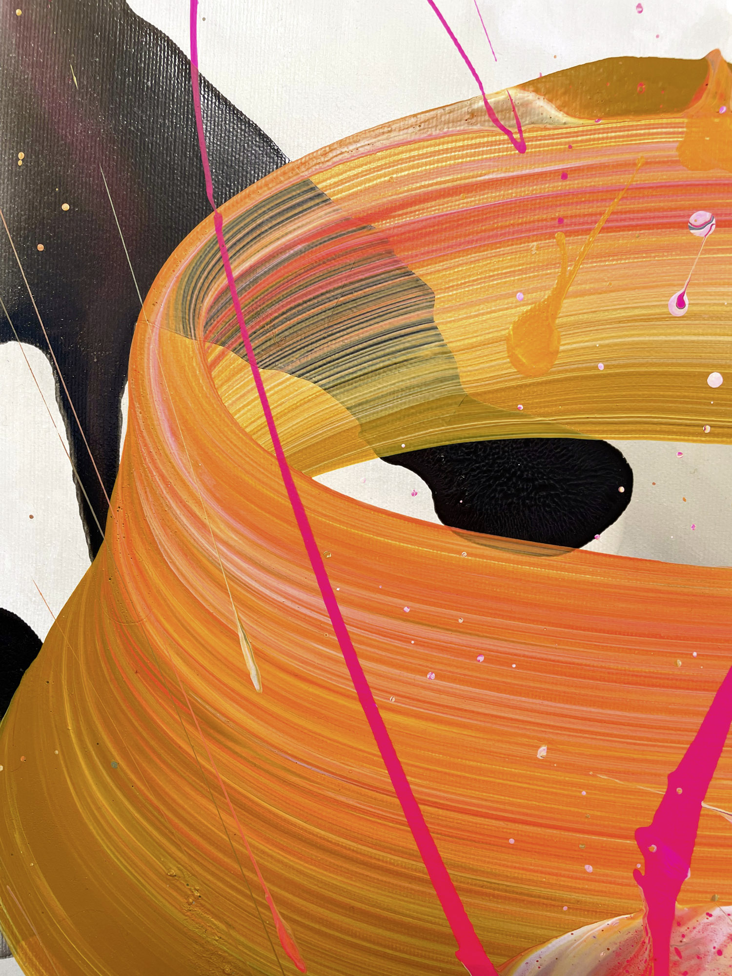 … Die meisten meiner Kompositionen sind geprägt von einem immer wiederkehrenden Merkmal, einem Symbol der Zeitlosigkeit und des Wohlstands – Gold. Ich verarbeite Gold als majestätischen Hintergrund, der die Augen des Betrachters verzaubert, oder in feinen Details, die wie funkelnde Reflexionen im Licht tanzen. Dieses edle Metall, ein Zeichen für Glanz und Beständigkeit, verschmilzt mit den fließenden Farben und den komplexen Strukturen meiner Werke.