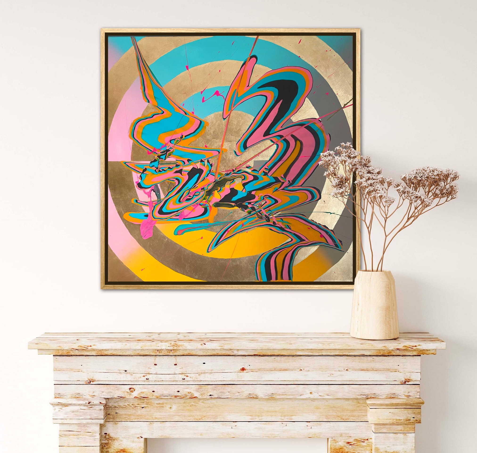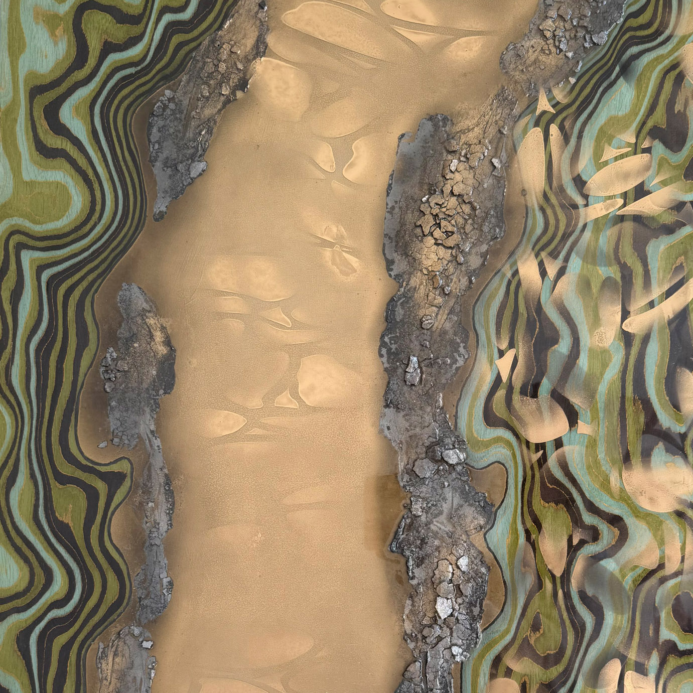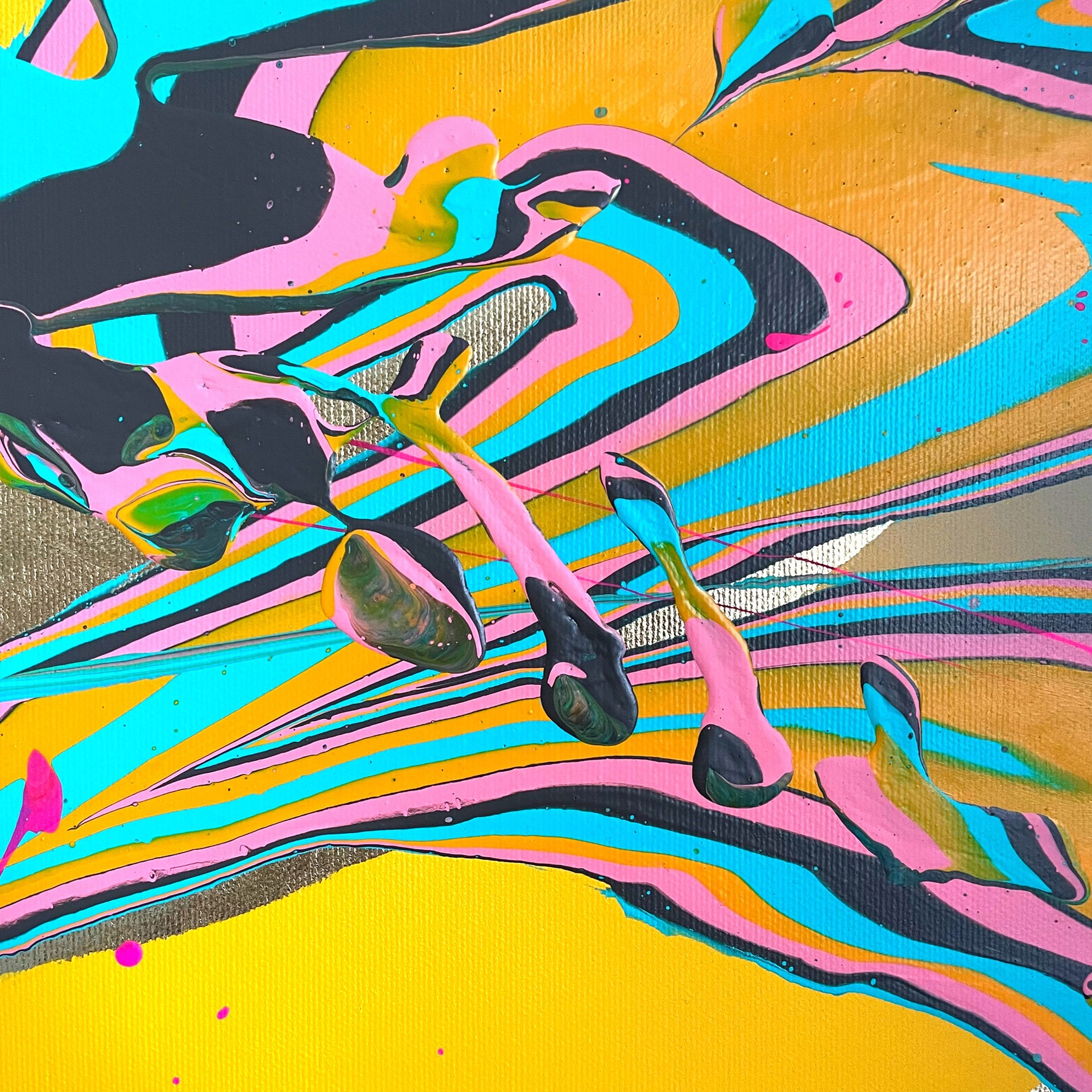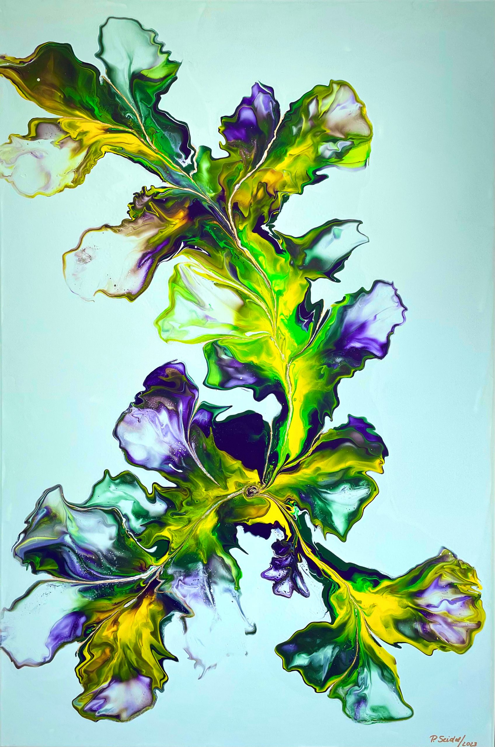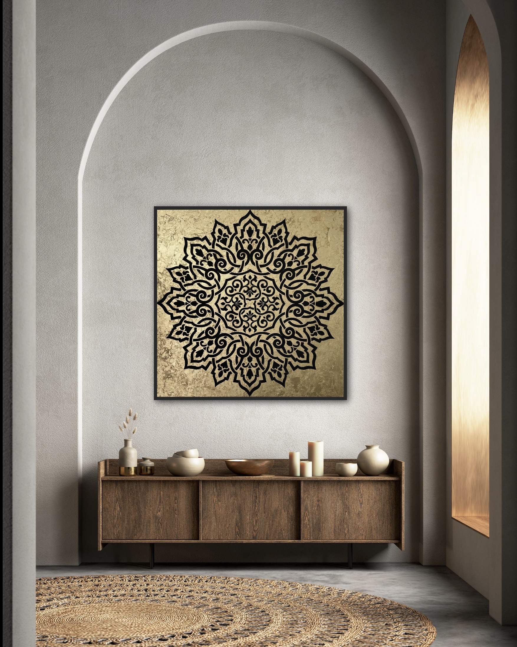 … Die meisten meiner Kompositionen sind geprägt von einem immer wiederkehrenden Merkmal, einem Symbol der Zeitlosigkeit und des Wohlstands – Gold. Ich verarbeite Gold als majestätischen Hintergrund, der die Augen des Betrachters verzaubert, oder in feinen Details, die wie funkelnde Reflexionen im Licht tanzen. Dieses edle Metall, ein Zeichen für Glanz und Beständigkeit, verschmilzt mit den fließenden Farben und den komplexen Strukturen meiner Werke.