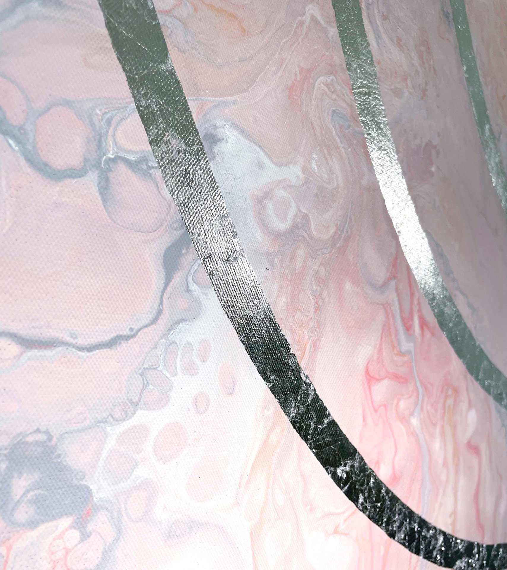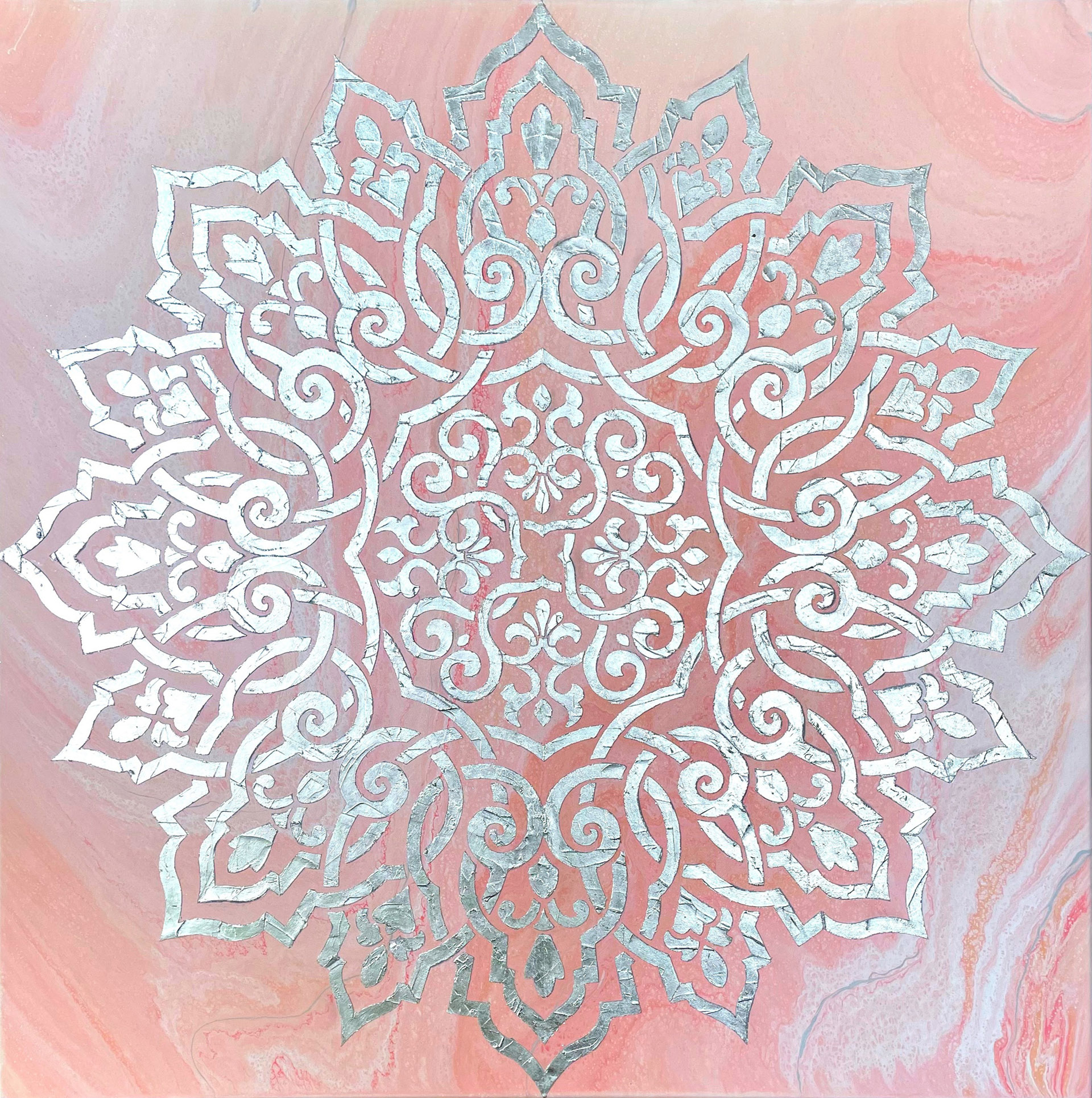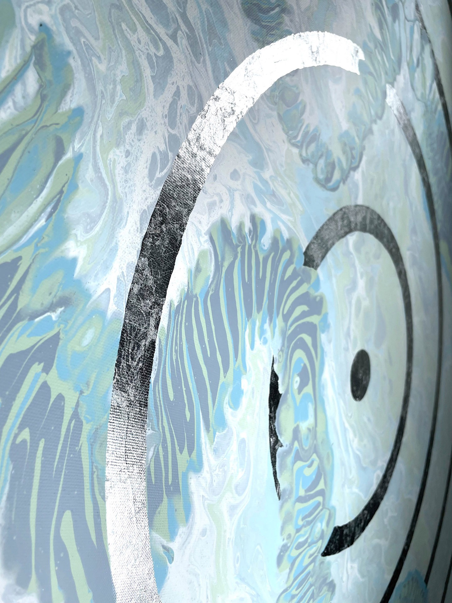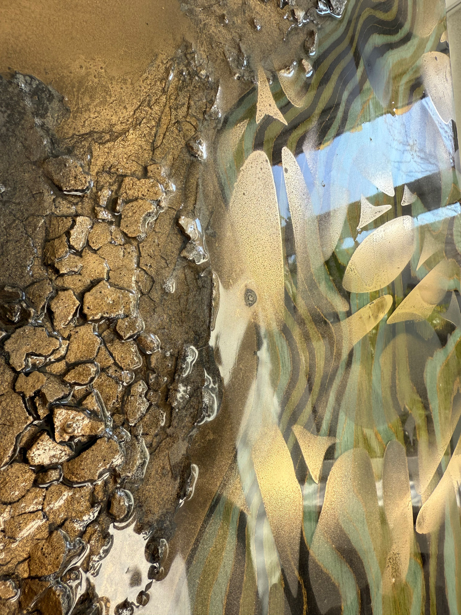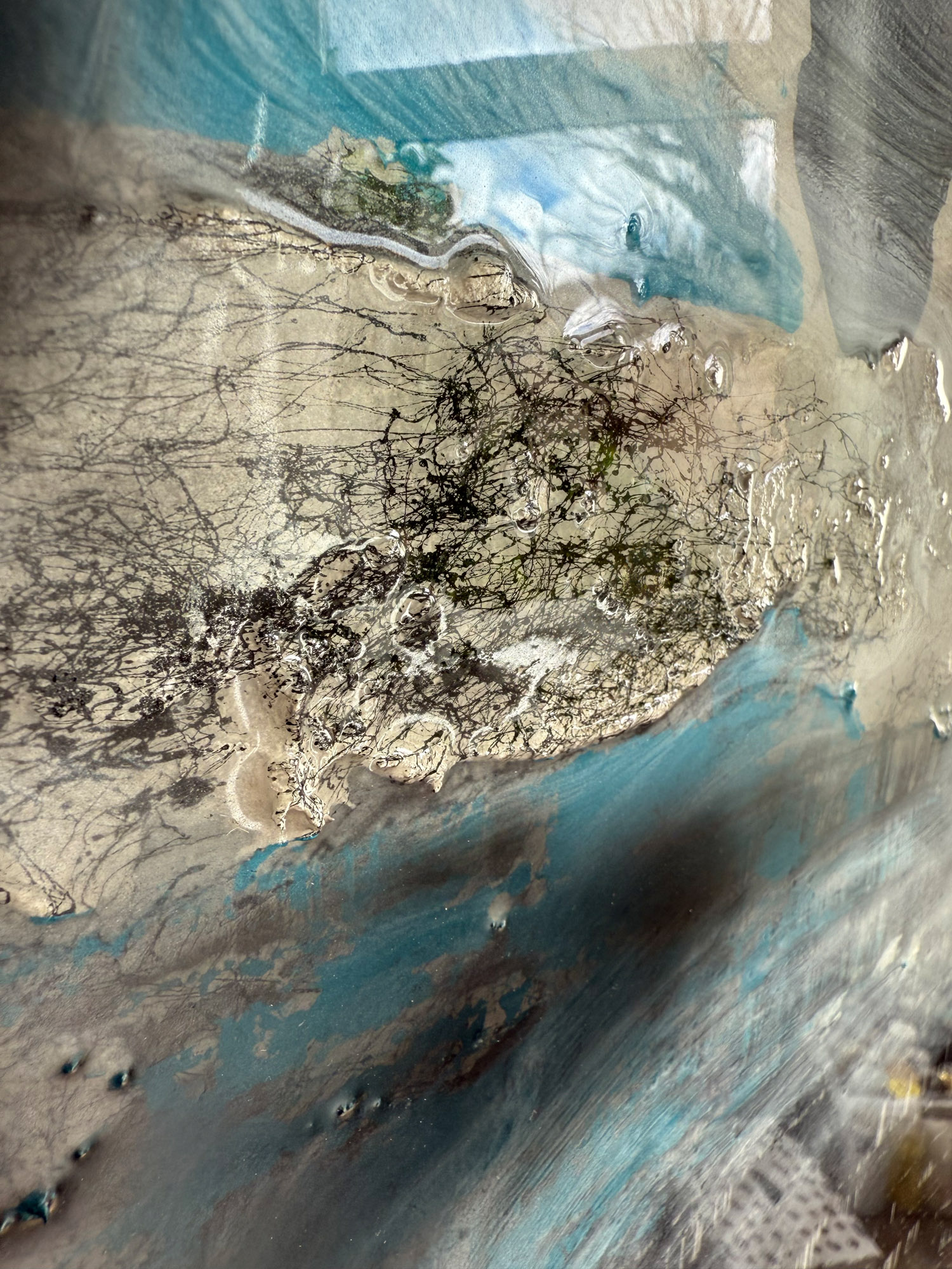 … Die meisten meiner Kompositionen sind geprägt von einem immer wiederkehrenden Merkmal, einem Symbol der Zeitlosigkeit und des Wohlstands – Gold. Ich verarbeite Gold als majestätischen Hintergrund, der die Augen des Betrachters verzaubert, oder in feinen Details, die wie funkelnde Reflexionen im Licht tanzen. Dieses edle Metall, ein Zeichen für Glanz und Beständigkeit, verschmilzt mit den fließenden Farben und den komplexen Strukturen meiner Werke.