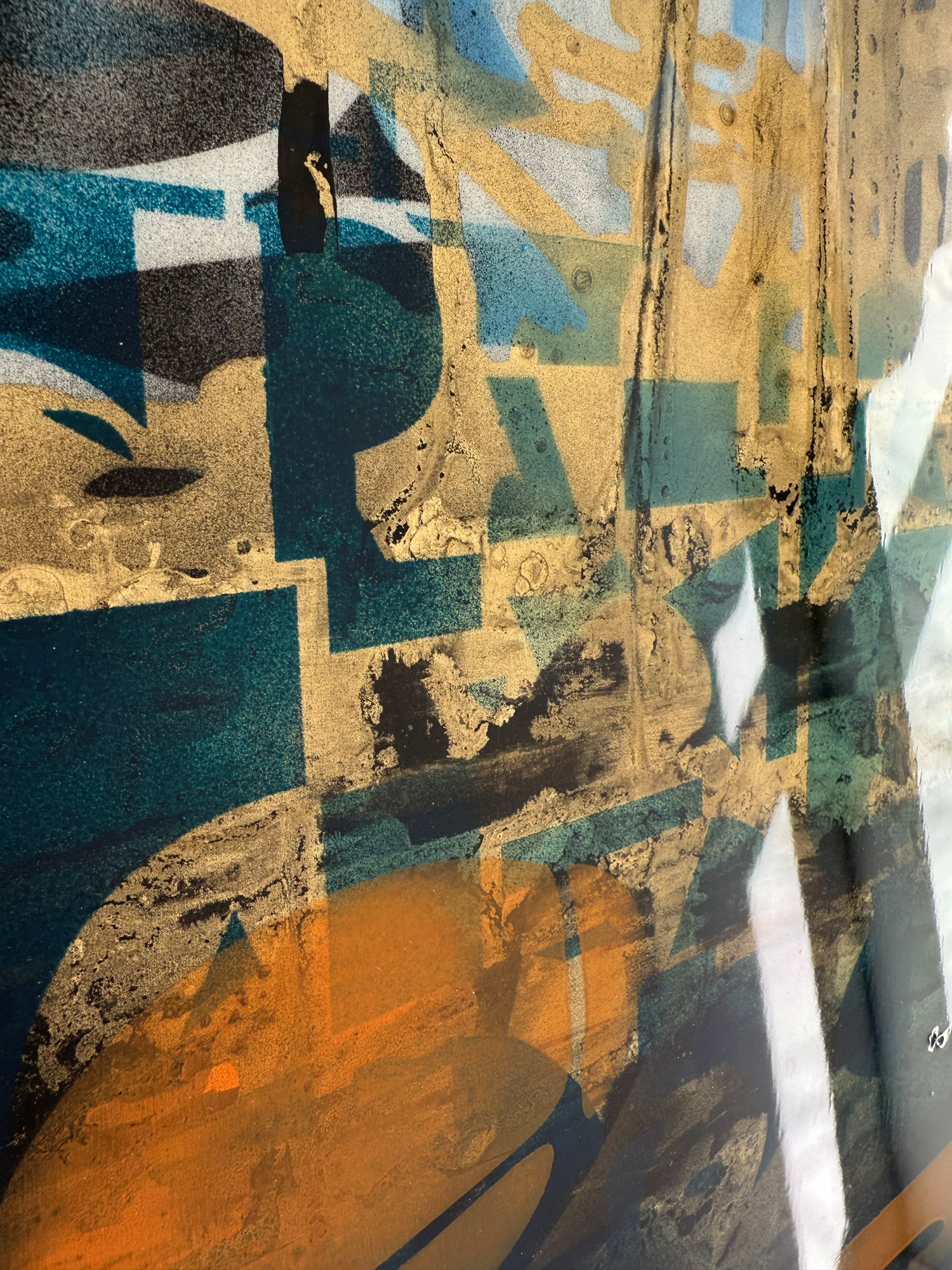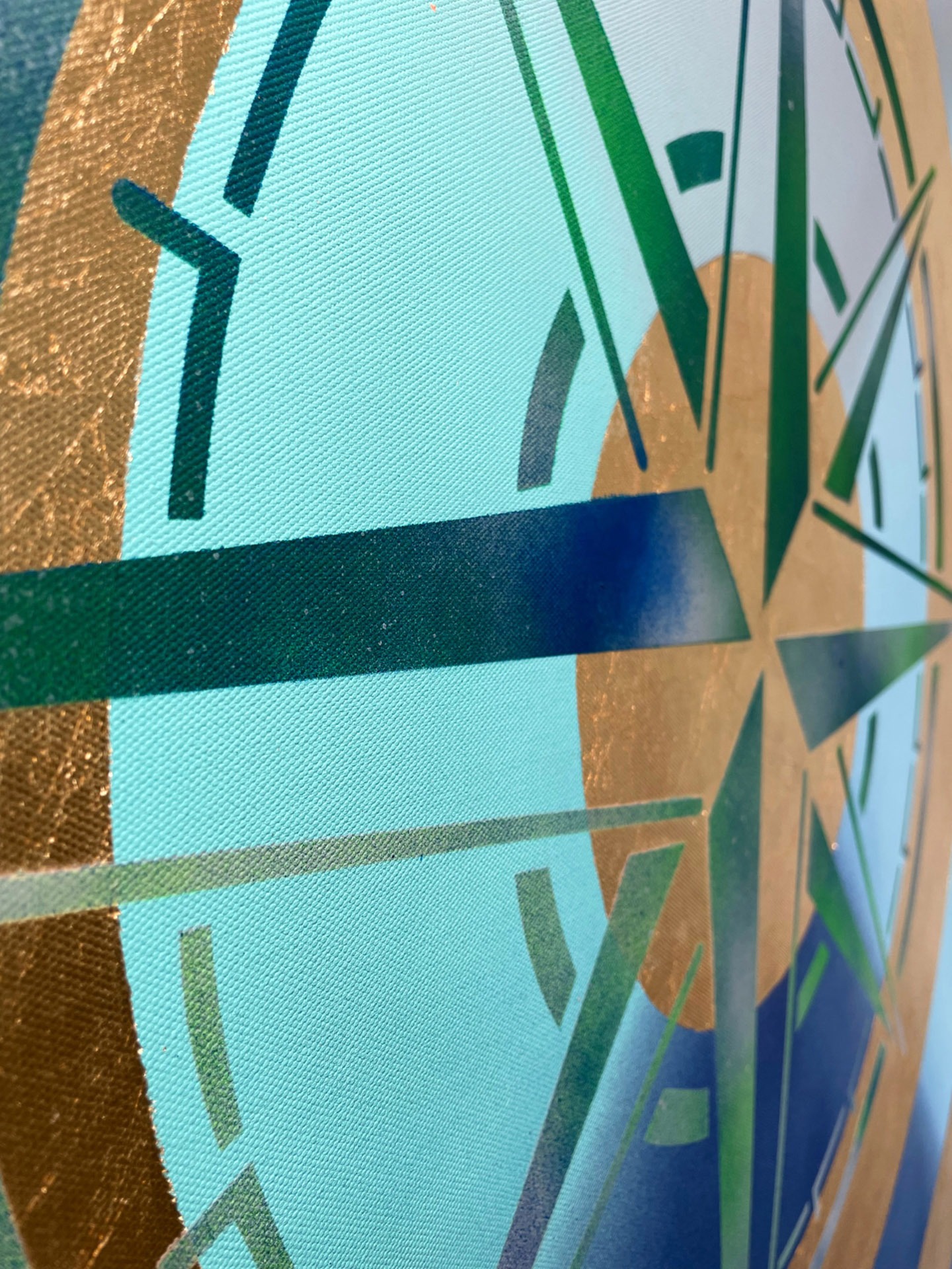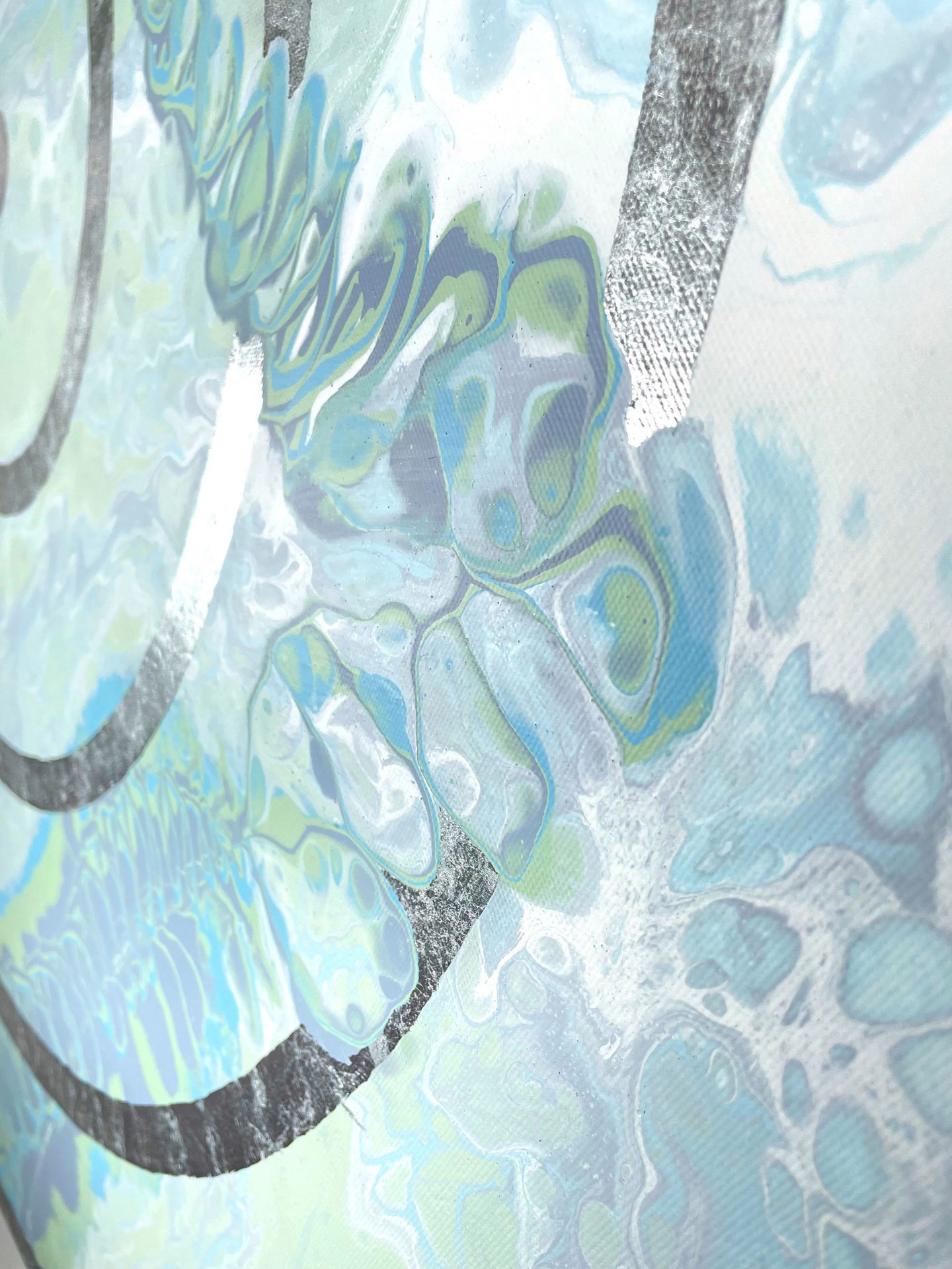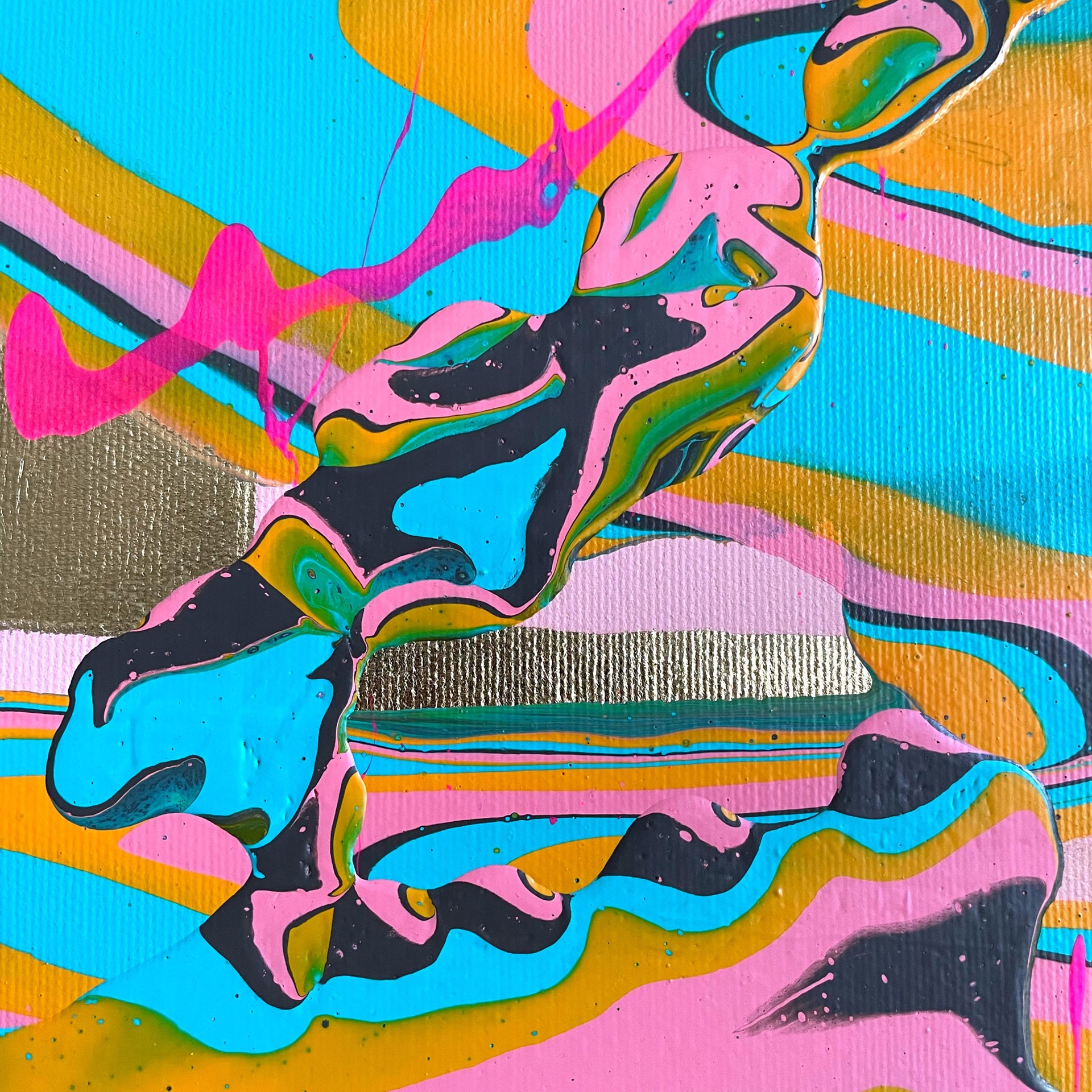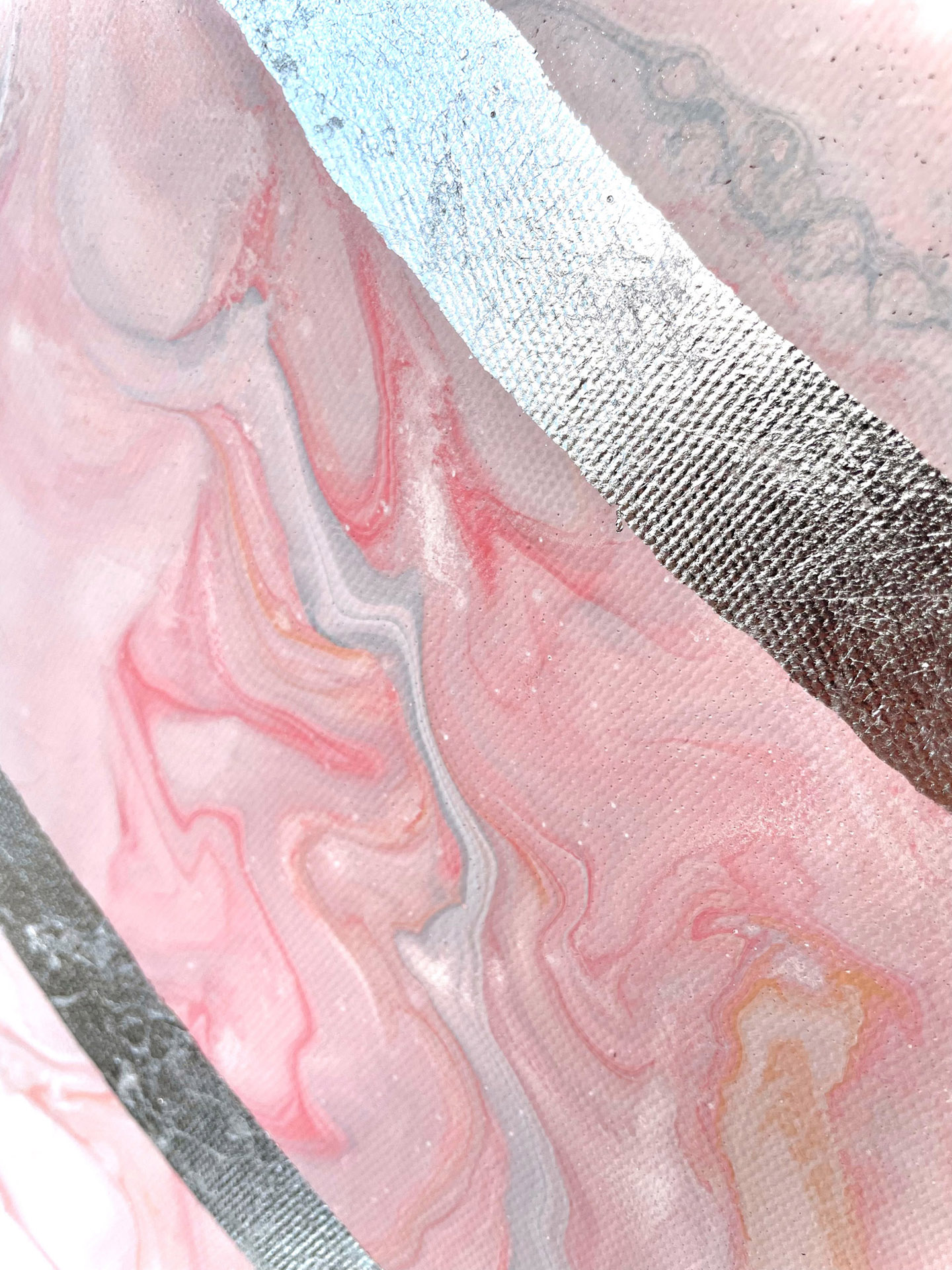 … Die meisten meiner Kompositionen sind geprägt von einem immer wiederkehrenden Merkmal, einem Symbol der Zeitlosigkeit und des Wohlstands – Gold. Ich verarbeite Gold als majestätischen Hintergrund, der die Augen des Betrachters verzaubert, oder in feinen Details, die wie funkelnde Reflexionen im Licht tanzen. Dieses edle Metall, ein Zeichen für Glanz und Beständigkeit, verschmilzt mit den fließenden Farben und den komplexen Strukturen meiner Werke.