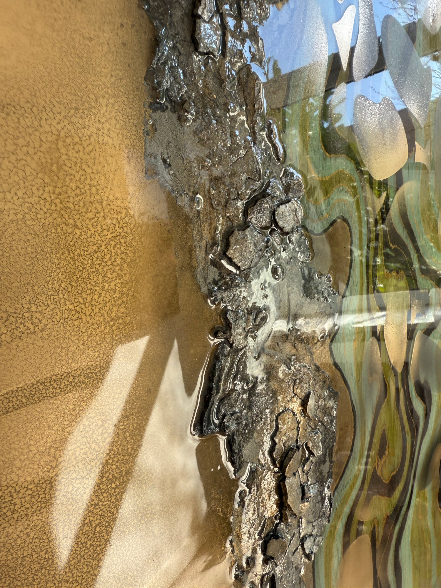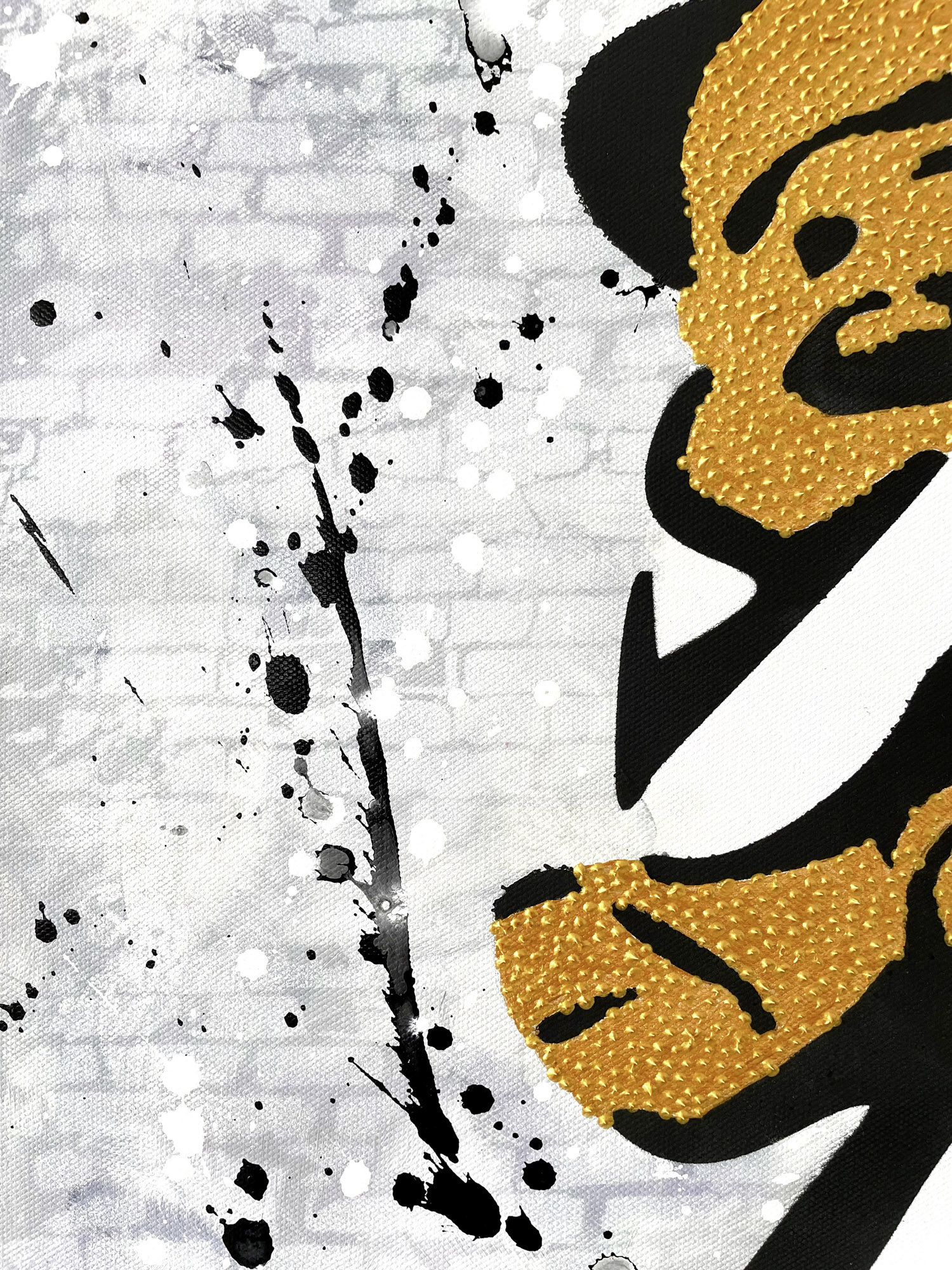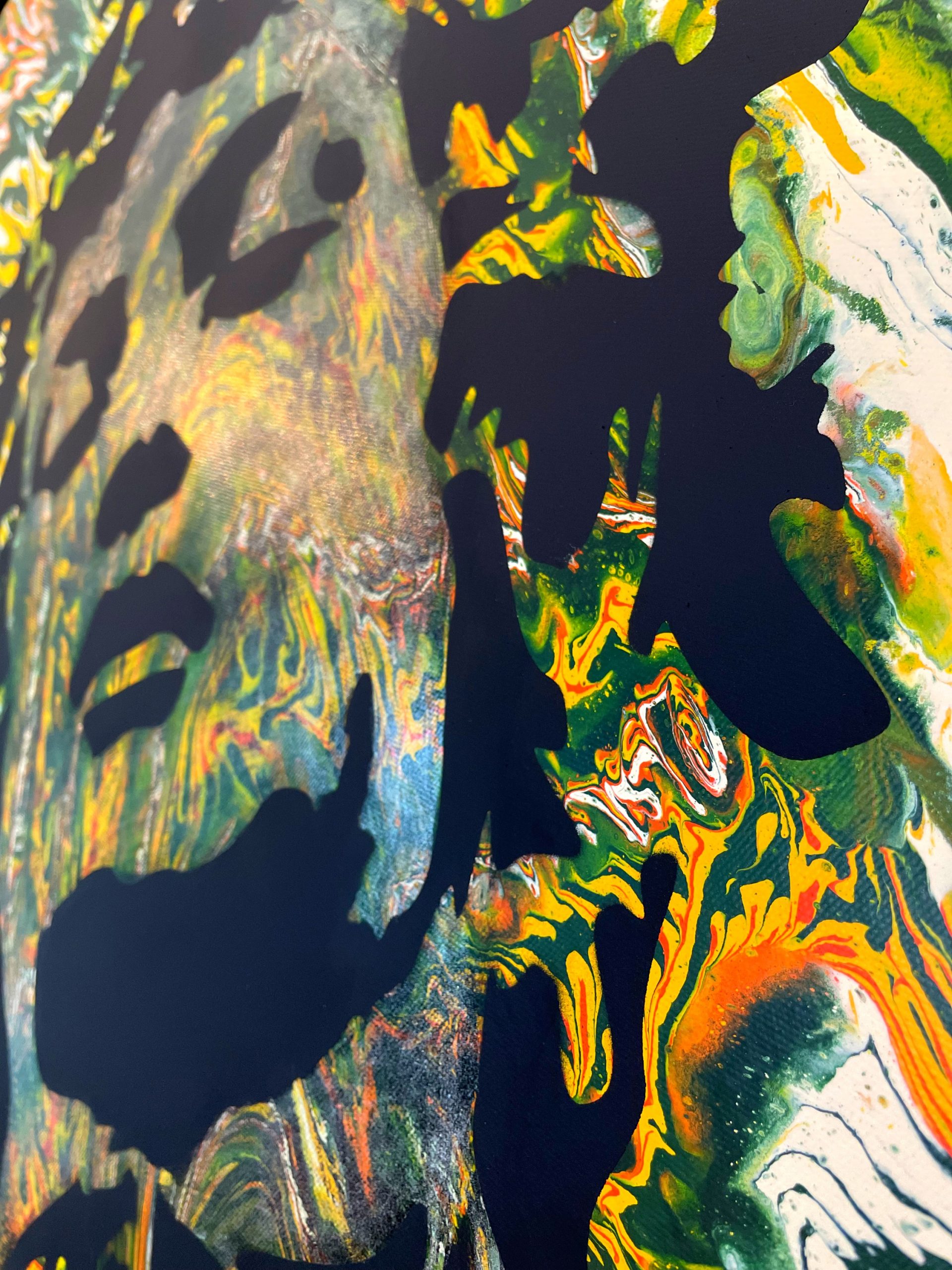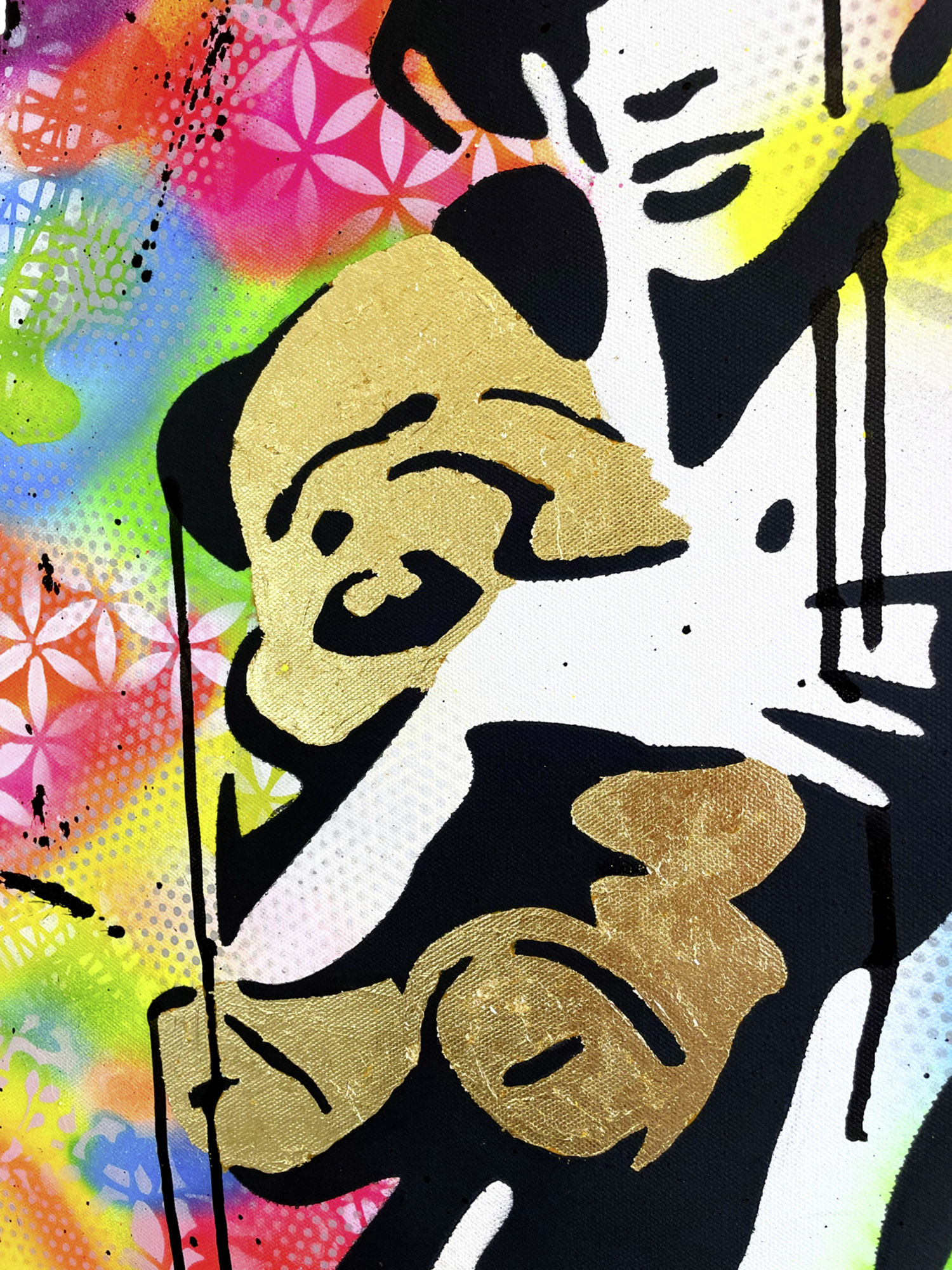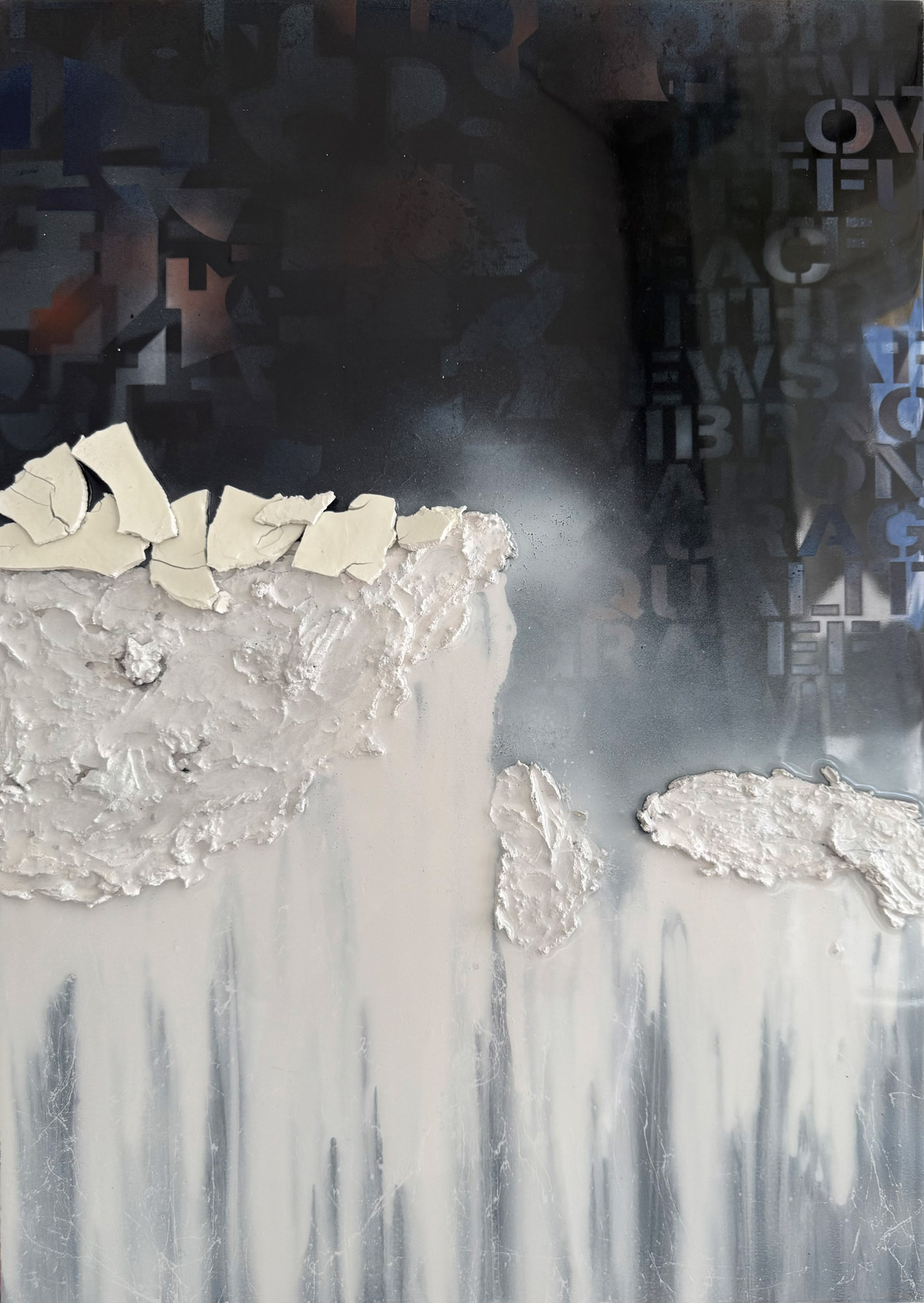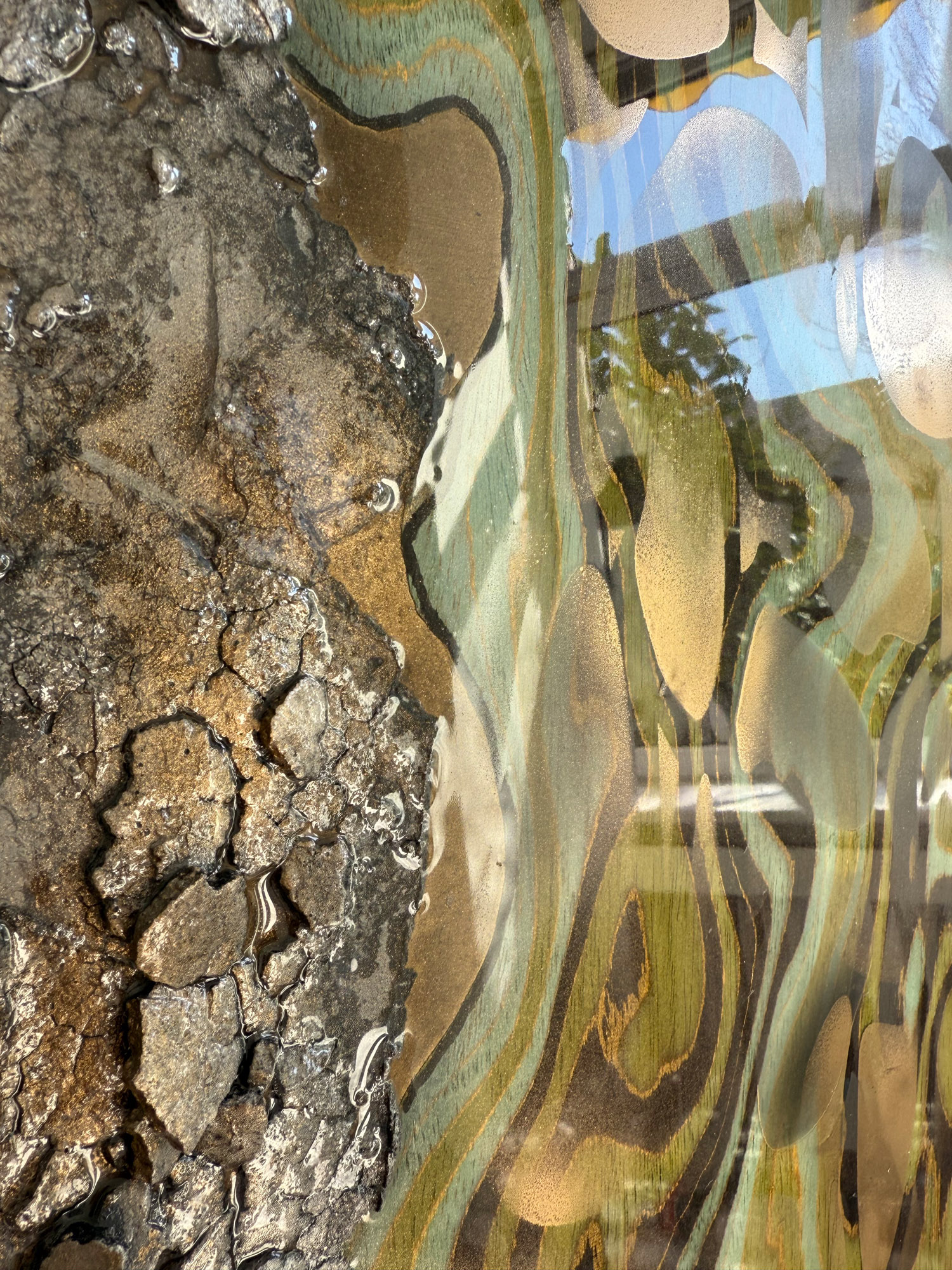 … Die meisten meiner Kompositionen sind geprägt von einem immer wiederkehrenden Merkmal, einem Symbol der Zeitlosigkeit und des Wohlstands – Gold. Ich verarbeite Gold als majestätischen Hintergrund, der die Augen des Betrachters verzaubert, oder in feinen Details, die wie funkelnde Reflexionen im Licht tanzen. Dieses edle Metall, ein Zeichen für Glanz und Beständigkeit, verschmilzt mit den fließenden Farben und den komplexen Strukturen meiner Werke.