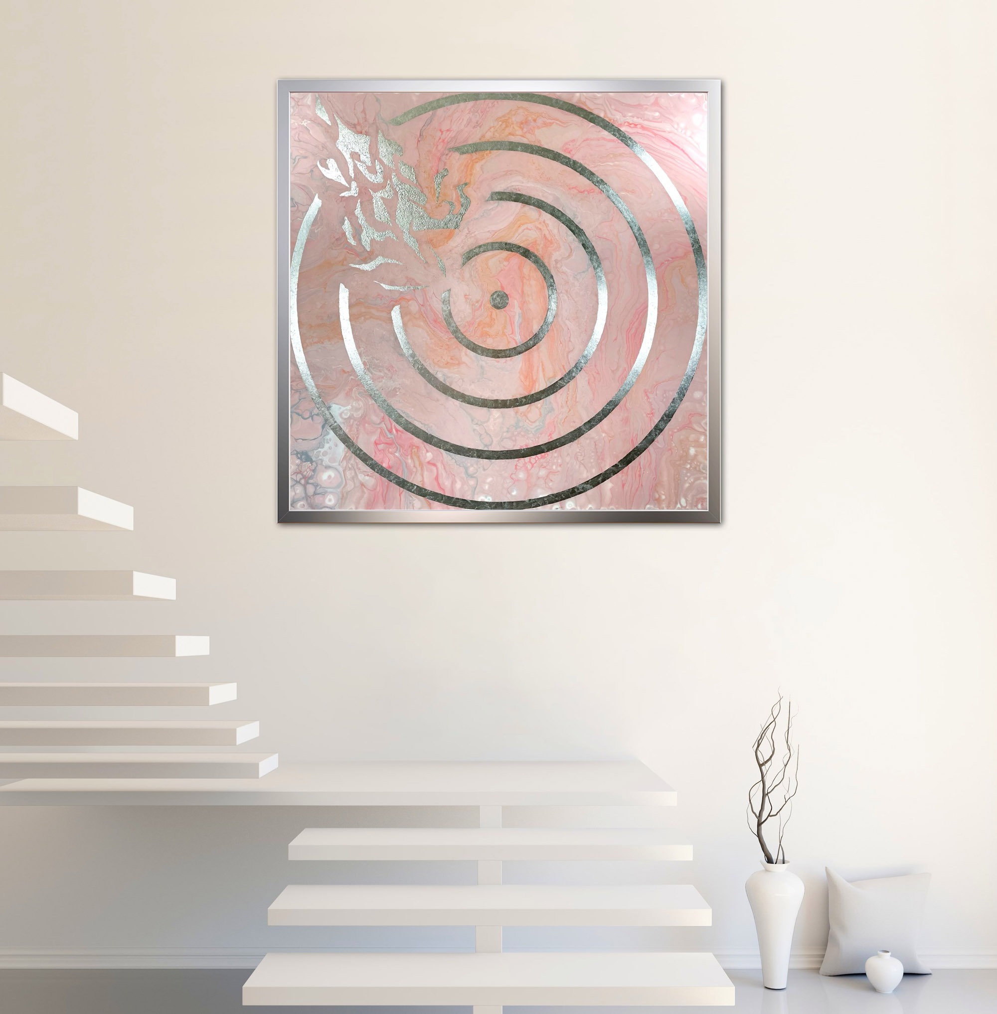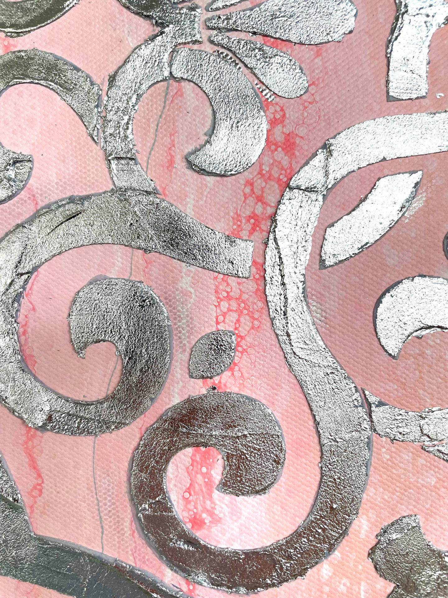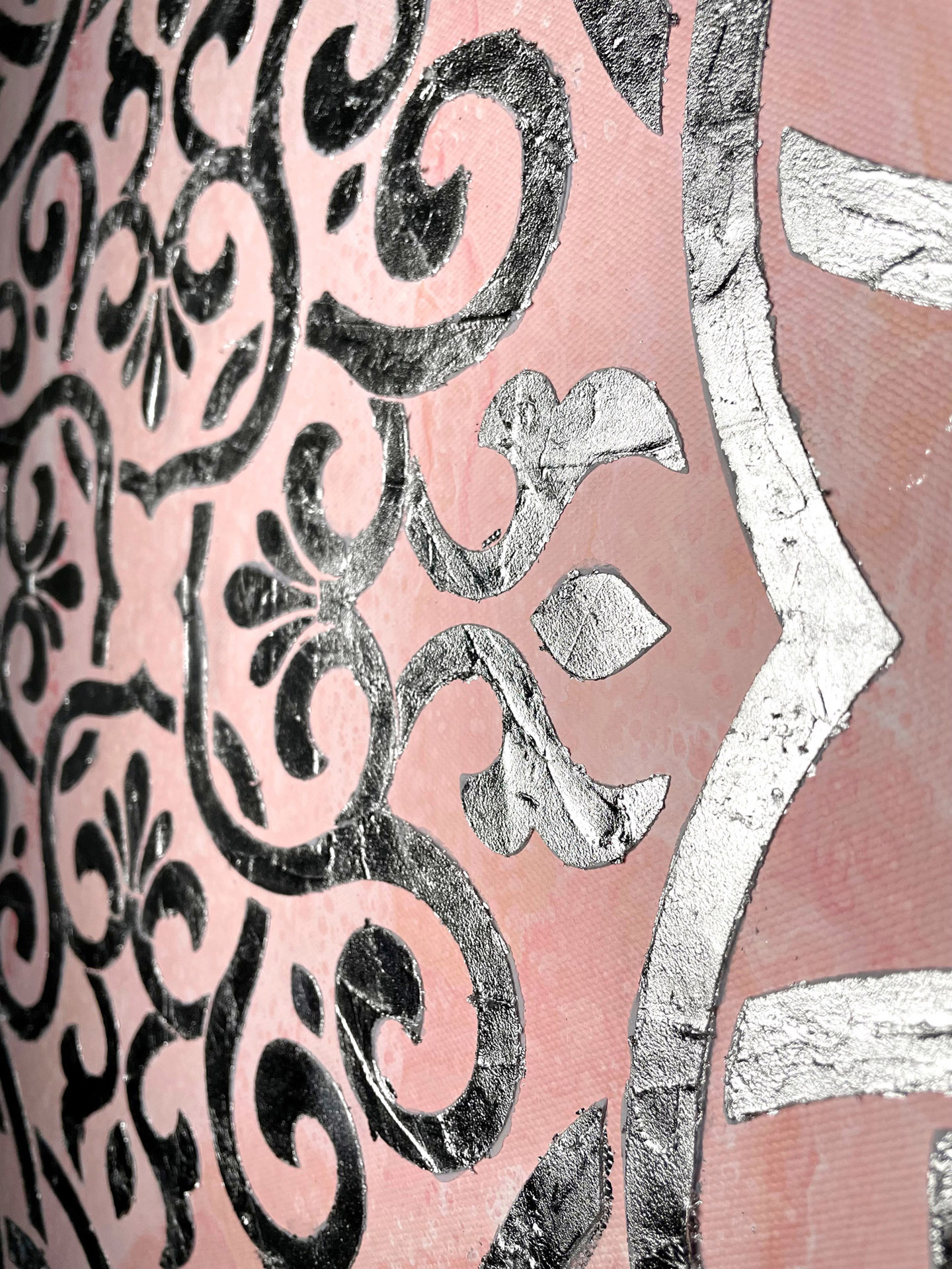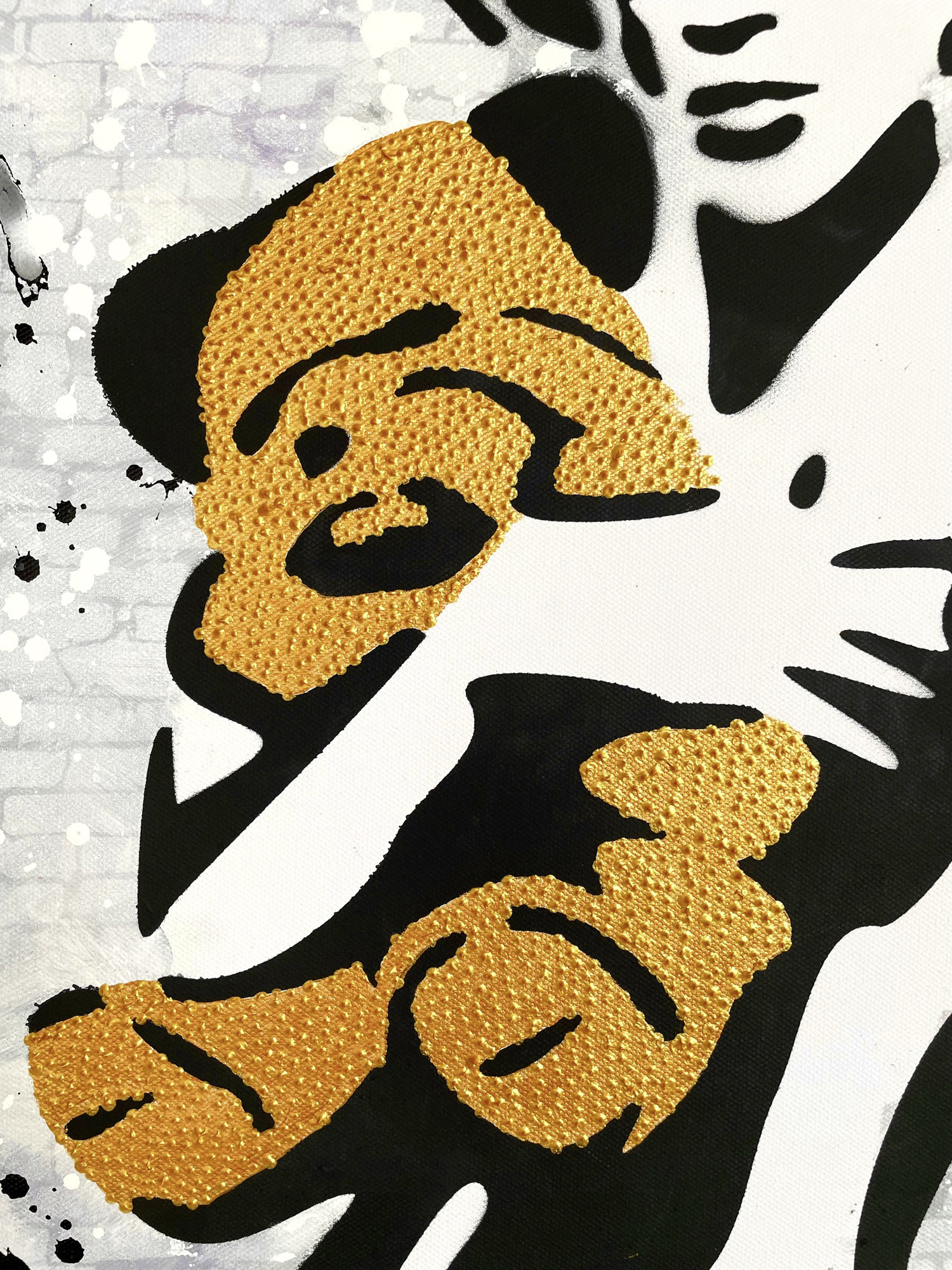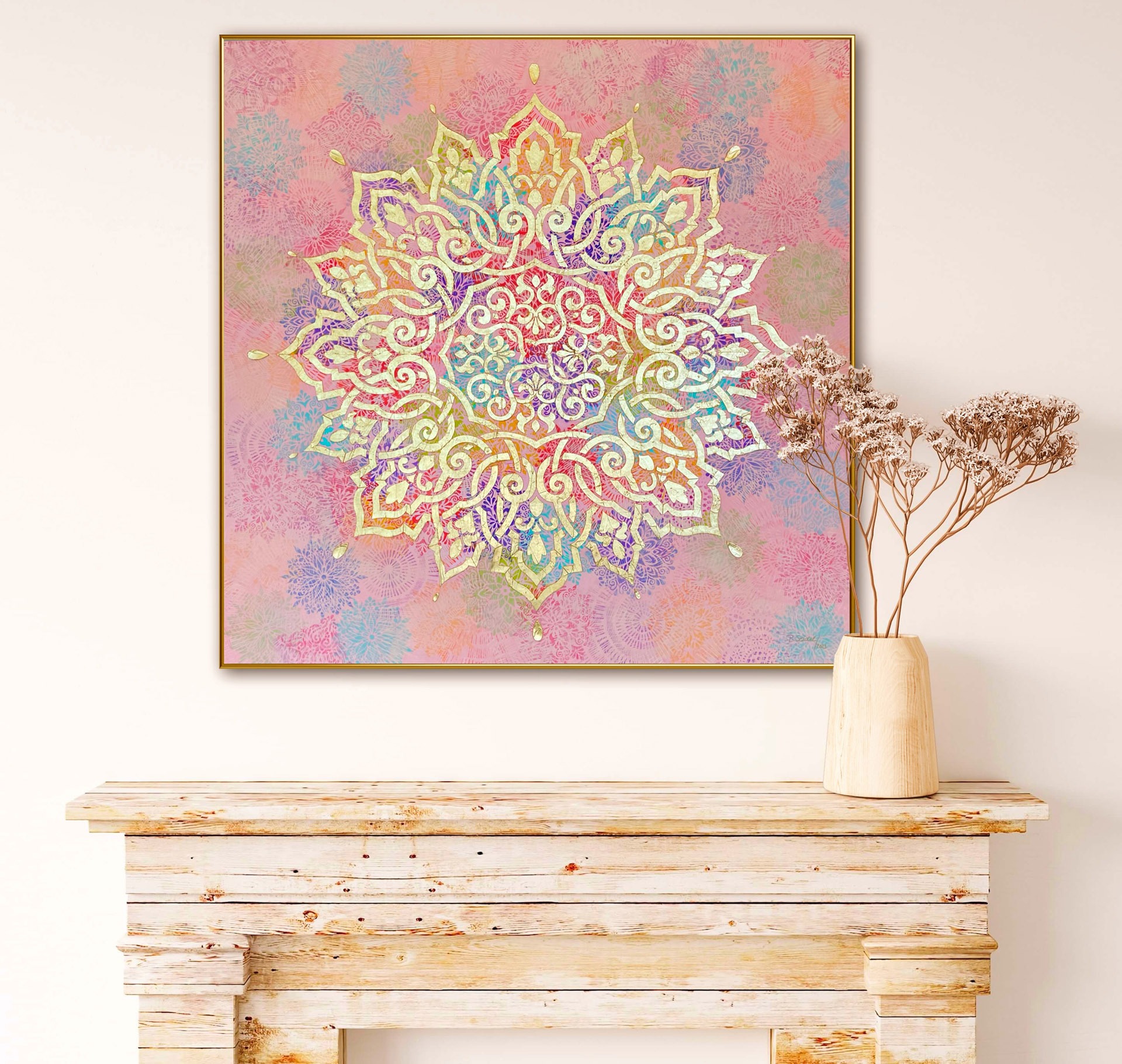 … Die meisten meiner Kompositionen sind geprägt von einem immer wiederkehrenden Merkmal, einem Symbol der Zeitlosigkeit und des Wohlstands – Gold. Ich verarbeite Gold als majestätischen Hintergrund, der die Augen des Betrachters verzaubert, oder in feinen Details, die wie funkelnde Reflexionen im Licht tanzen. Dieses edle Metall, ein Zeichen für Glanz und Beständigkeit, verschmilzt mit den fließenden Farben und den komplexen Strukturen meiner Werke.