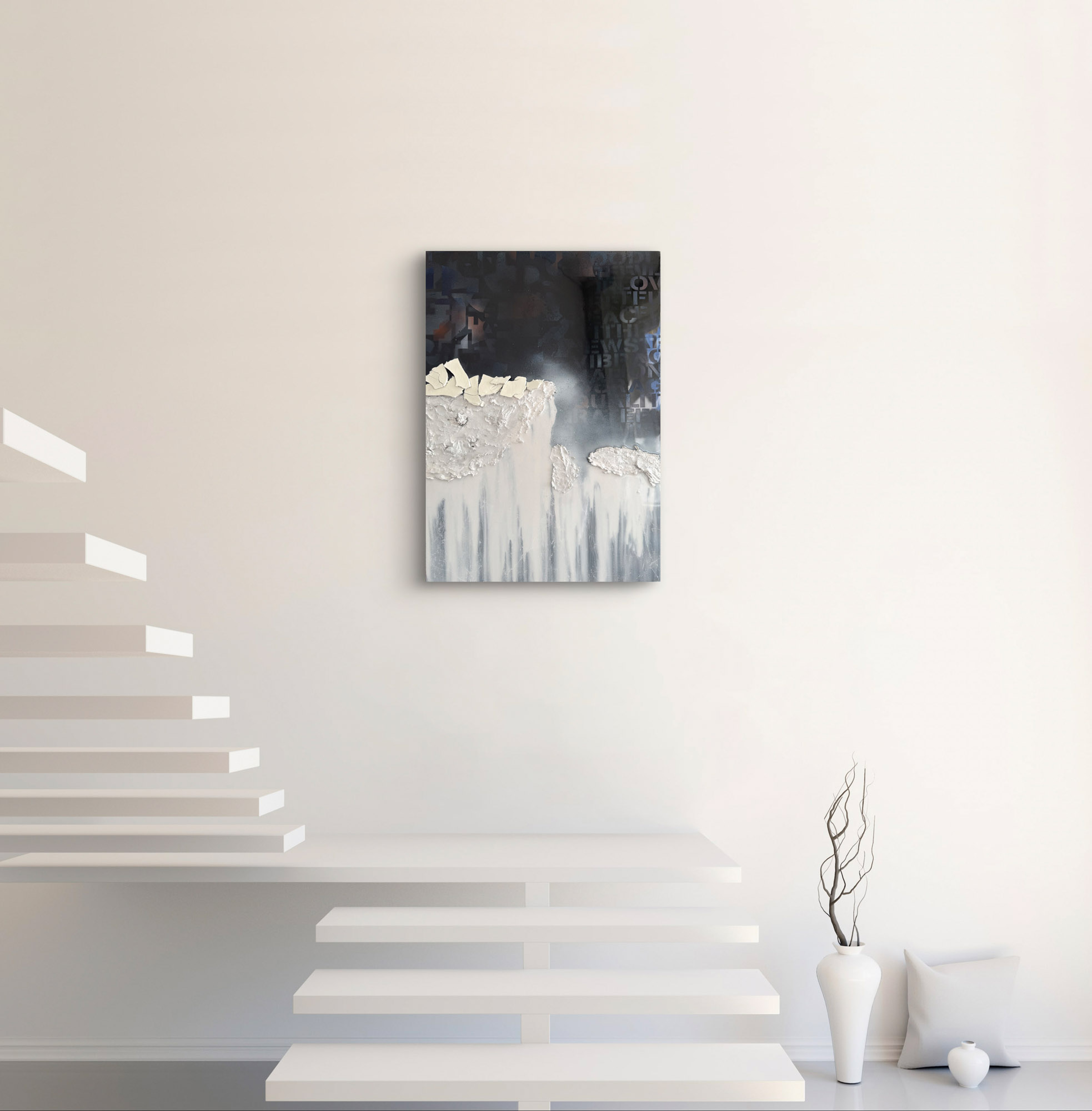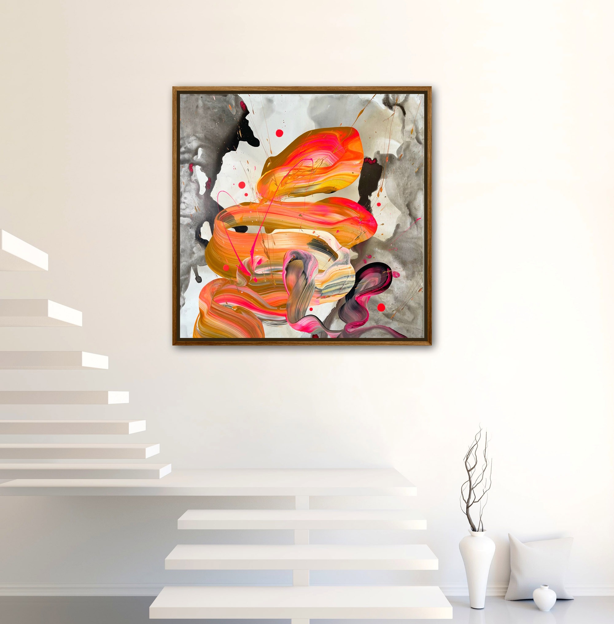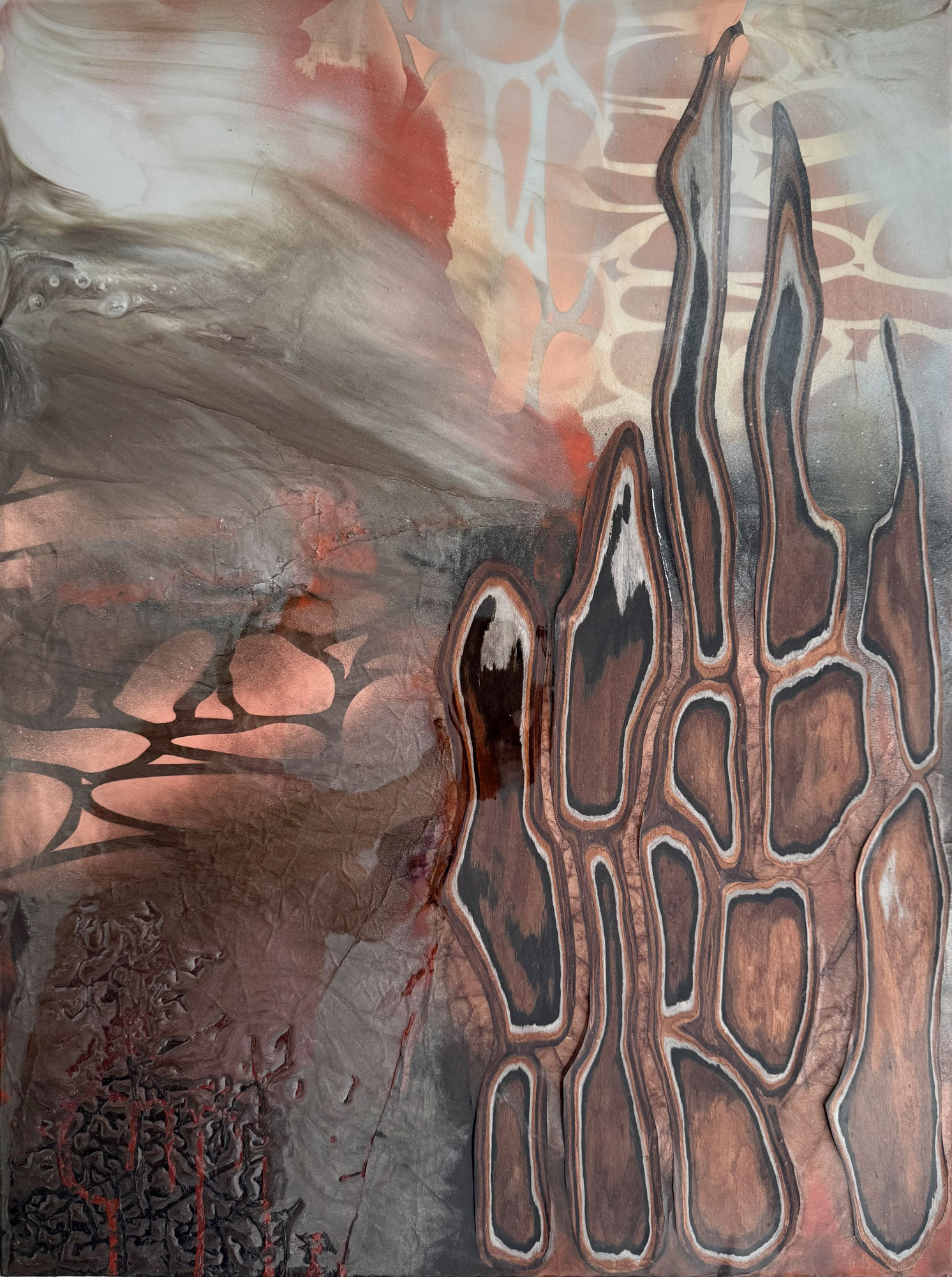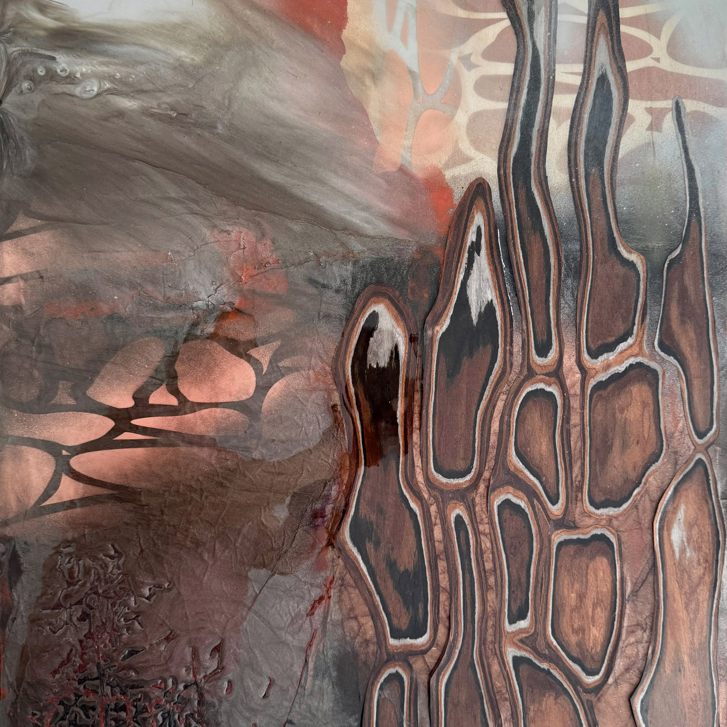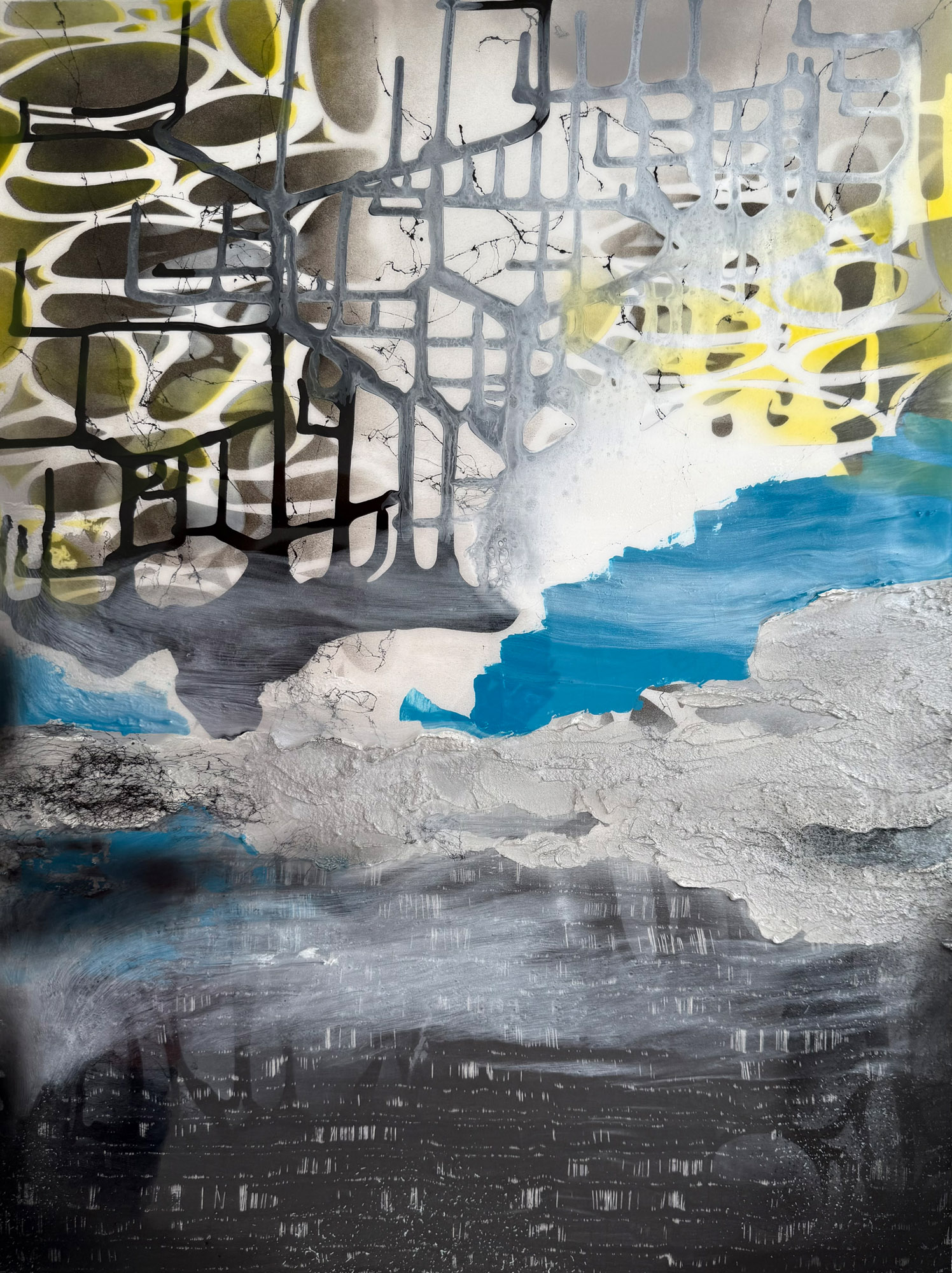 … Die meisten meiner Kompositionen sind geprägt von einem immer wiederkehrenden Merkmal, einem Symbol der Zeitlosigkeit und des Wohlstands – Gold. Ich verarbeite Gold als majestätischen Hintergrund, der die Augen des Betrachters verzaubert, oder in feinen Details, die wie funkelnde Reflexionen im Licht tanzen. Dieses edle Metall, ein Zeichen für Glanz und Beständigkeit, verschmilzt mit den fließenden Farben und den komplexen Strukturen meiner Werke.