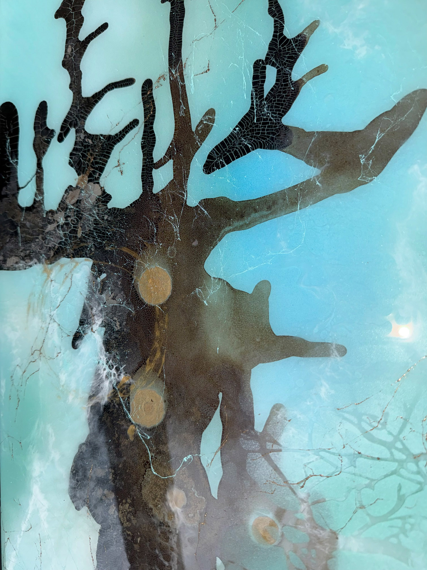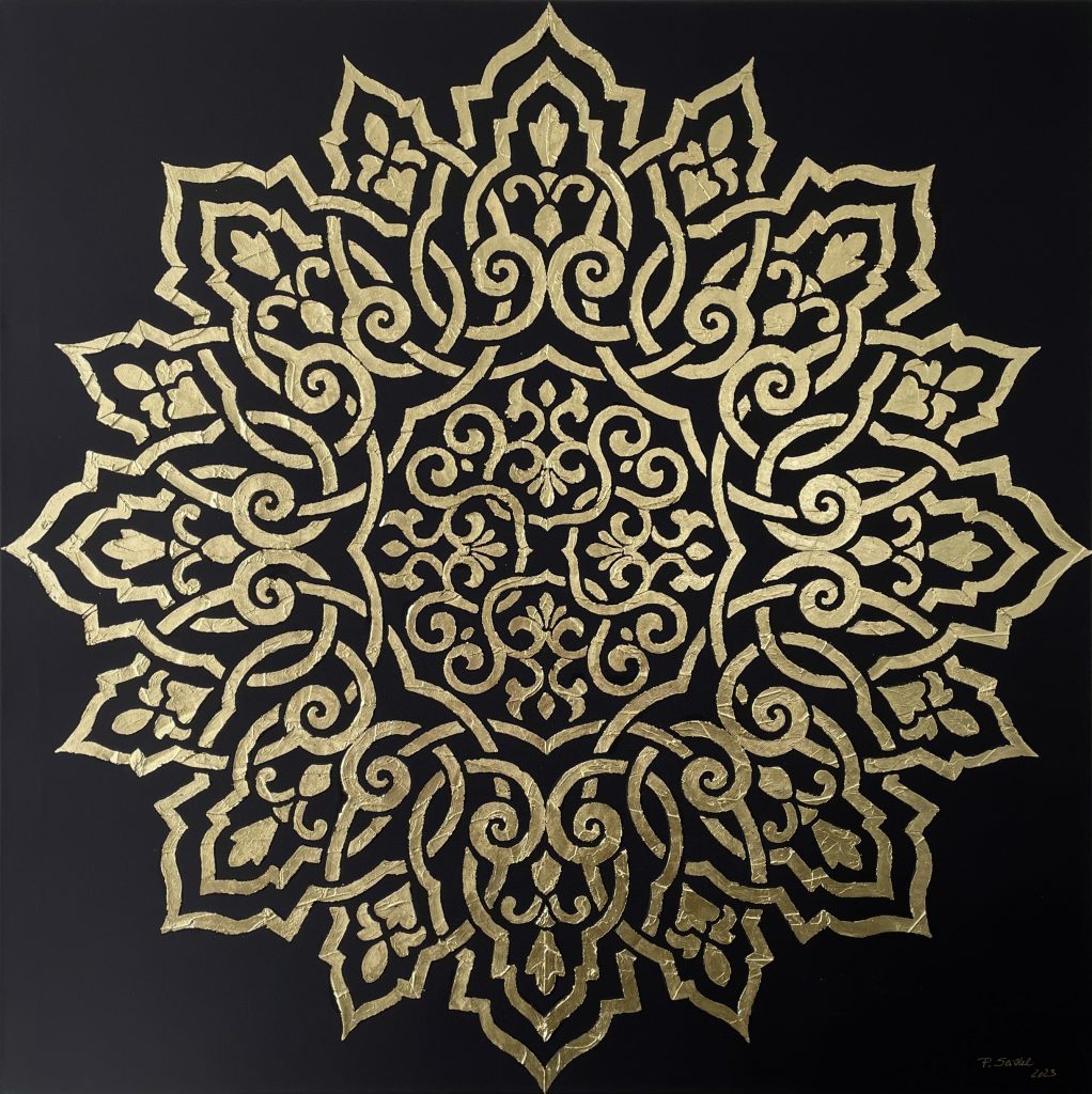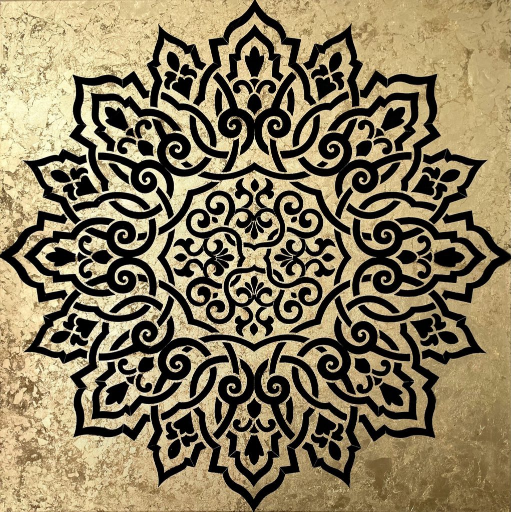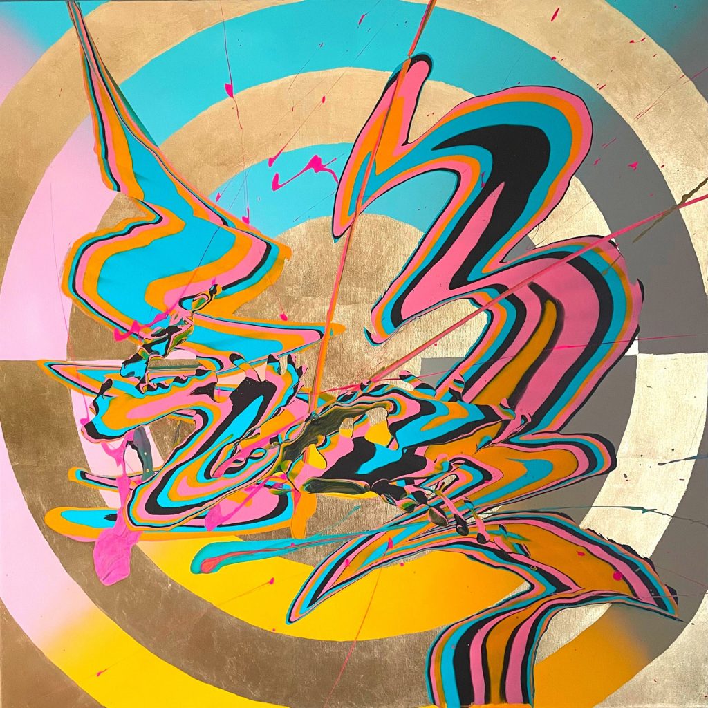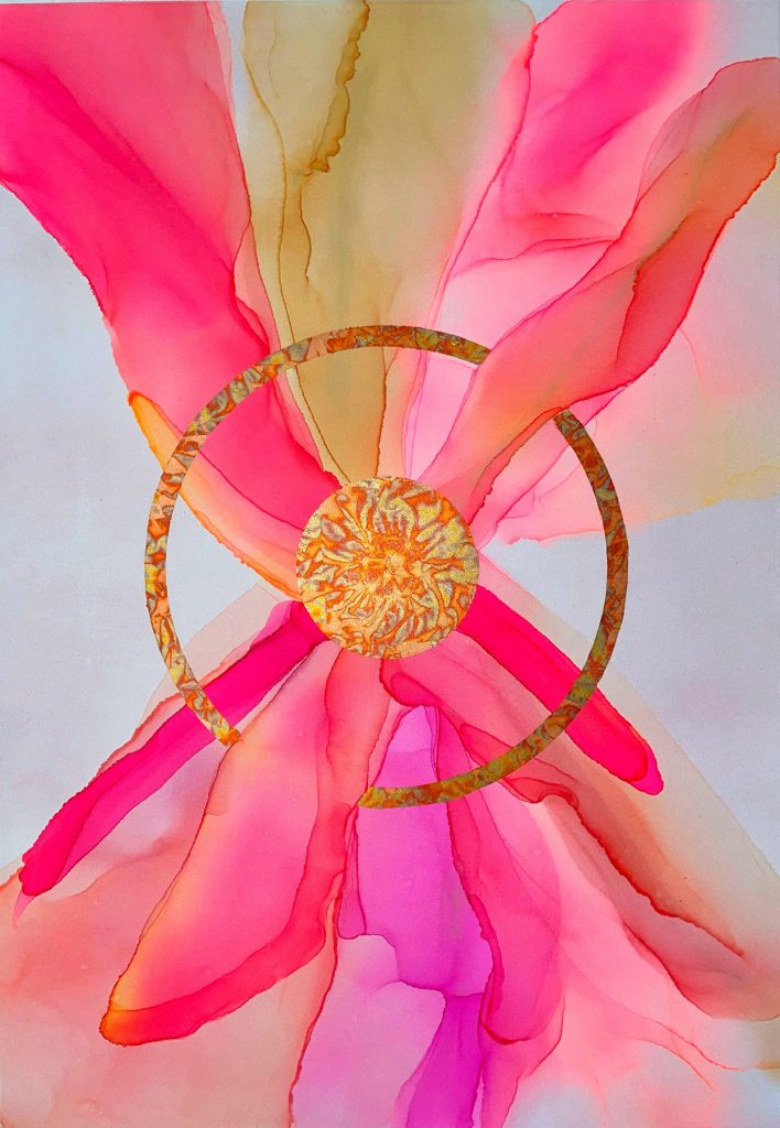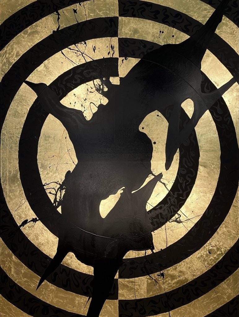 Die Verwendung von Acryl und Tuschen auf Leinwand ermöglicht mir eine vielschichtige Darstellung, bei der sowohl deckende als auch transparente Farben in- und übereinander fließen. So entstehen spannende Nuancen und Texturen. Durch diese Kompositionen werden oftmals überraschende Ergebnisse erzielt, die den Blick des Betrachters lenken und zum Nachdenken anregen. Besonders markant sind die goldenen kreisförmigen Flächen, die als Hintergrund oder aufliegend gestaltet werden und eine metaphorische Ebene der Vollkommenheit und Spiritualität vermitteln.